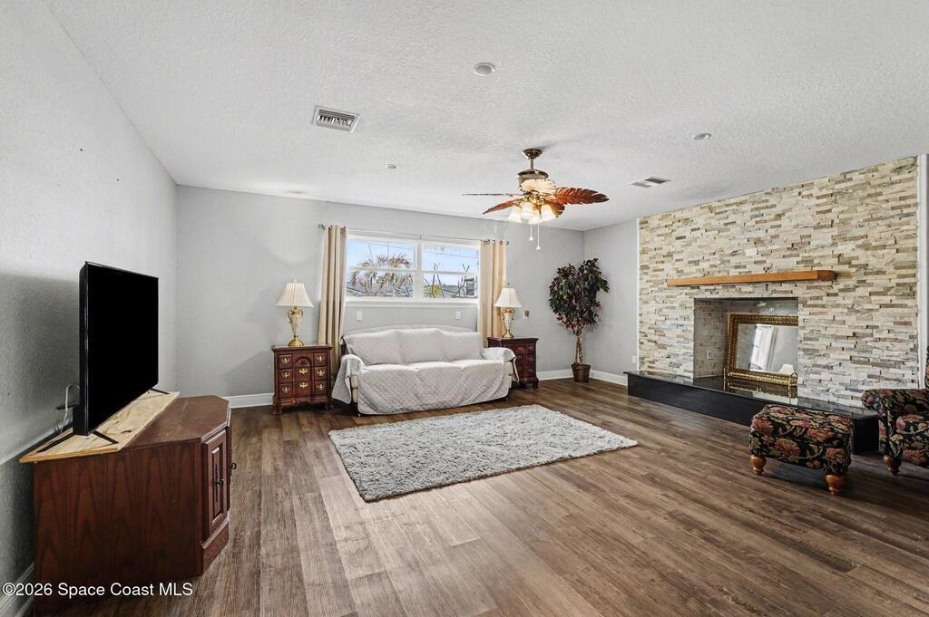 In the heart of Merritt Island, this happy home is made for laughter, lounging & lazy weekends. The kitchen sits right in the heart of it all--perfect for cooking up a homecooked meal for a crowd or ordering Ubereats & calling it ''chef's choice.'' The split floorplan gives everyone their own space, making movie nights peaceful & mornings calm. Cozy up by the electric fireplace, soak in the sunshine through dbl pane windows, & enjoy a worry-free life w/ 2 ACs (both 2018) & a 2021 roof. The extended 2-car garage is perfect for all your toys, tools & treasures, while the home's handicap accessibility adds thoughtful convenience. A short stroll takes you to a scenic waterfront park where you can watch sunsets, feed ducks, or just breathe it all in. This is the kind of home that feels like a deep sigh of contentment--easy, comfortable & full of heart.