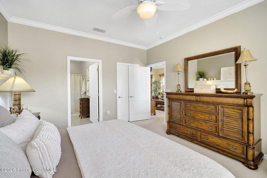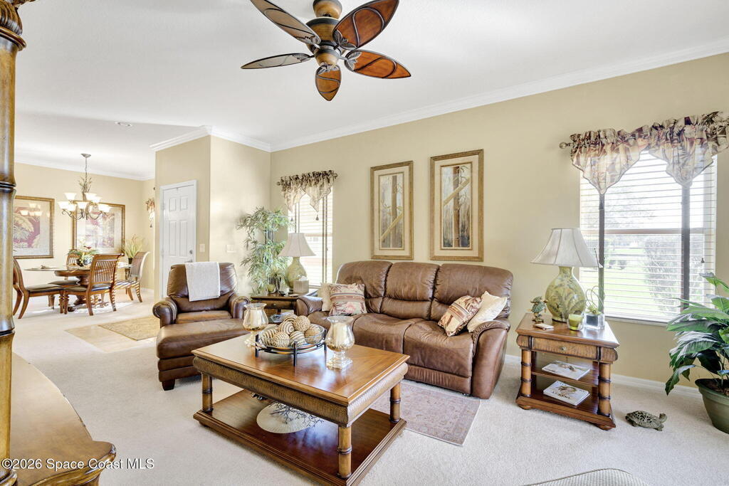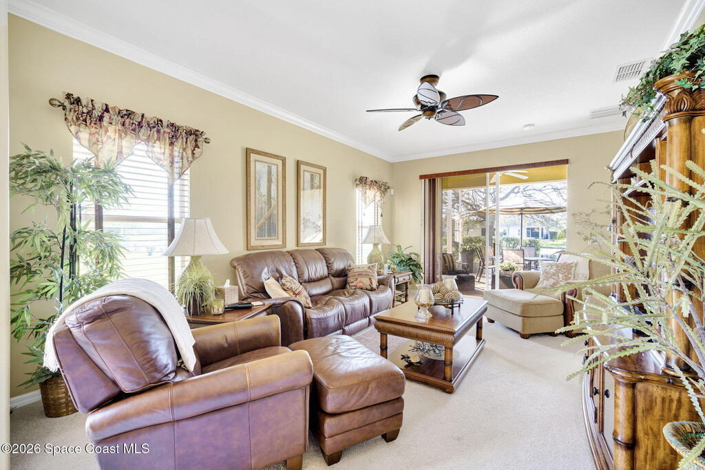 Available now through end of December, this stunning fully furnished and turnkey rental is located in the highly desirable 55+ gated community of Heritage Isle in Viera. Perfect for seasonal residents, those relocating, or anyone seeking a peaceful retreat, this beautifully maintained lakefront home offers both comfort and style in one of Brevard County's most sought-after active adult communities. The home features 2 spacious bedrooms, 2 full bathrooms, and a versatile bonus room ideal for an office, guest space, or hobby room. From the moment you walk in, you'll notice the tasteful decor and high-end finishes including crown molding, plantation shutters, and solar tubes that fill the space with natural light. The open-concept layout is designed for easy living and entertaining, while the fully stocked kitchen comes complete with dishes, cookware, linens, a coffee maker, and everything you need to feel right at home.