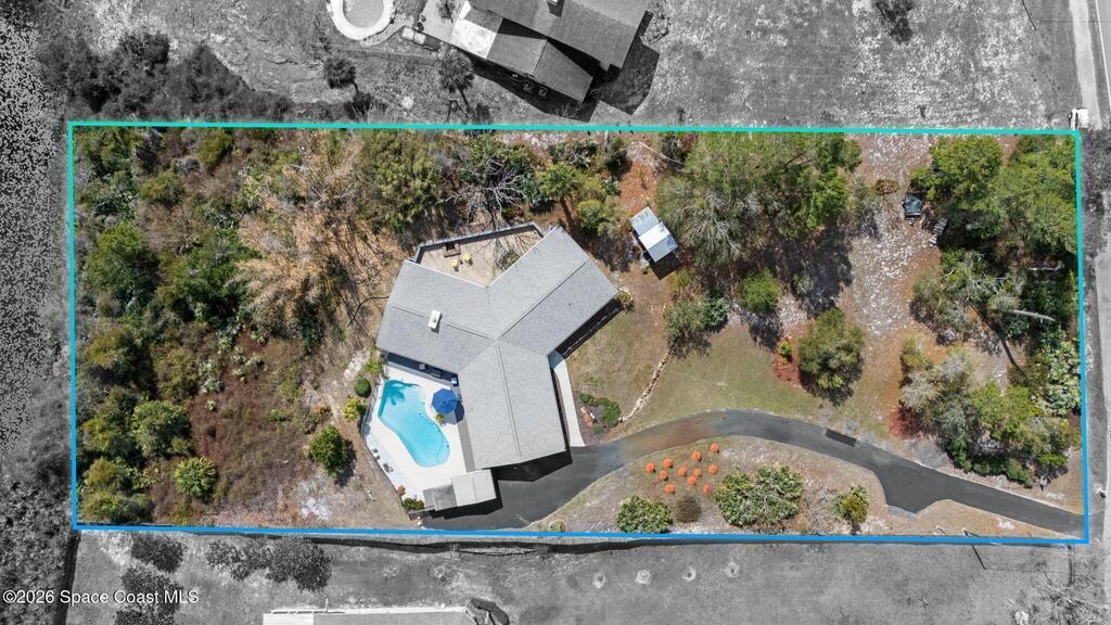 Four bedroom, three bathroom pool home in S. Carpenter on 1.43 acres, connected to city water (rare for the area). Up on a hill with lake views, no neighbors behind, and amazing rocket launch sights. Unique three-wing layout with central common areas. Updated kitchen and bathrooms. Large sliders and windows offer panoramic scenery and pool views from multiple areas. Cozy fireplace and charming courtyard add warmth and outdoor enjoyment. Bonus room off the garage offers flexible space for a workshop, office, or hobby area. Appliances 2023. Roof 2021. Electrical panel 2022. AC 2023. Pool resurfaced 2025. Privacy, space, and thoughtful updates throughout.