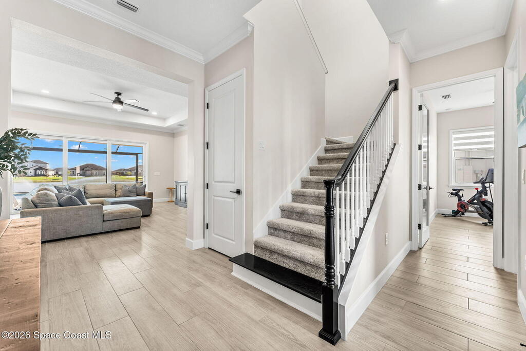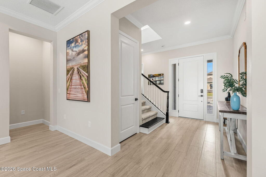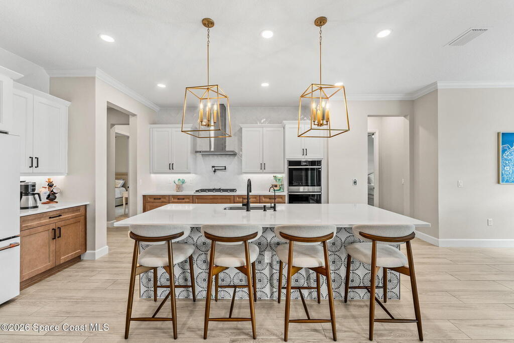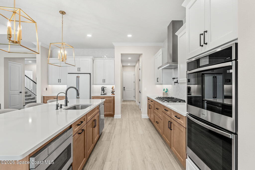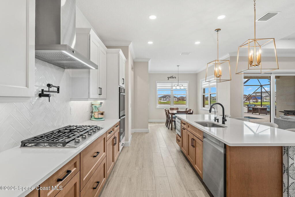 Experience refined living in the gated Laurasia community of Viera, a premier golf cart-friendly neighborhood celebrated for its elegance and convenience. This stunning two-story home offers 5 bedrooms, 4.5 baths, and a side-entry 2-car plus golf cart garage. The open-concept design centers around a gourmet kitchen featuring Level 5 cabinetry, quartz countertops, a pot filler, and a reverse osmosis system. Relax or entertain in the panoramic screened pool area, complete with shell lock pavers for slip-resistant style and fully automated Hayward pool controls for effortless enjoyment. The luxurious primary suite includes a spa-like bath with soaking tub and separate shower. Additional upgrades include a tankless natural gas water heater for endless efficiency. Zoned for A-rated Viera Elementary, Middle, and High School, this home blends exceptional craftsmanship with the vibrant Viera lifestyle.