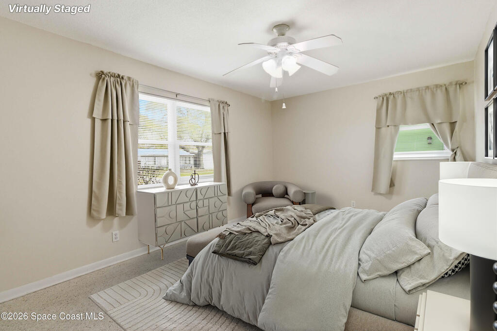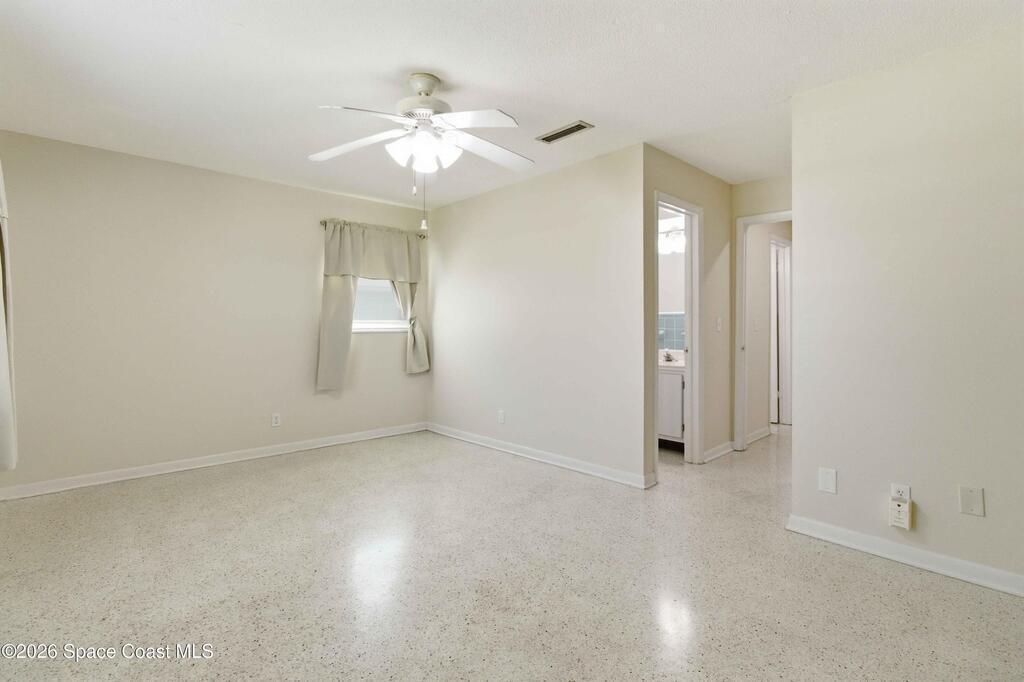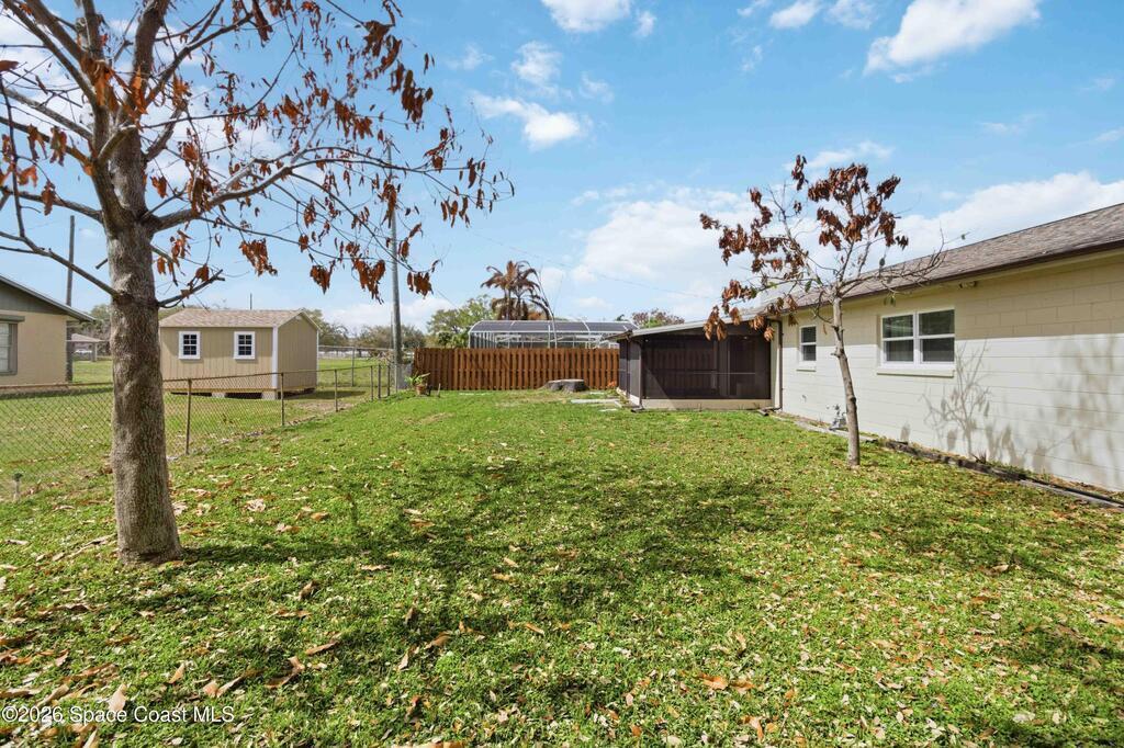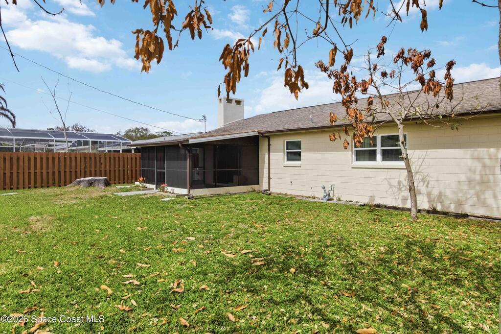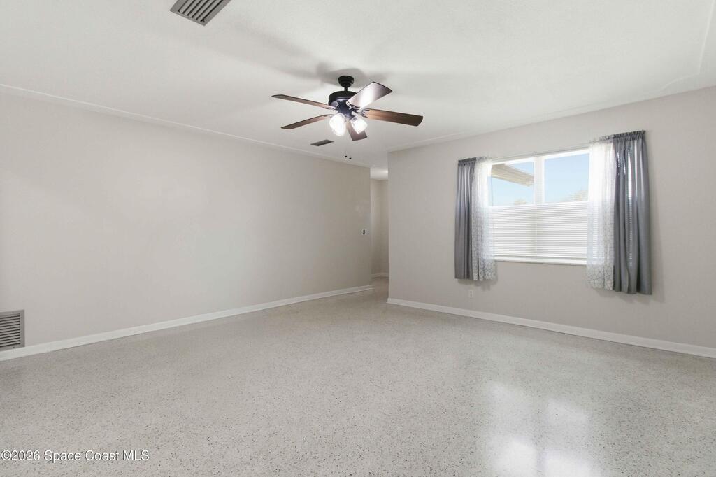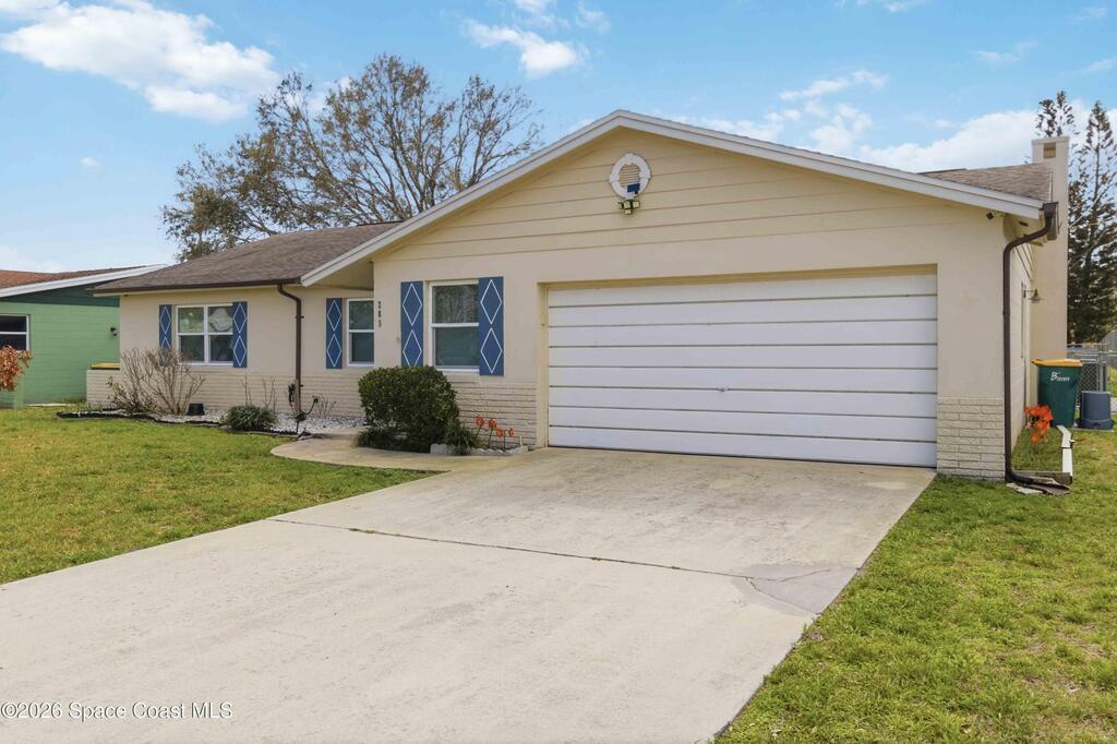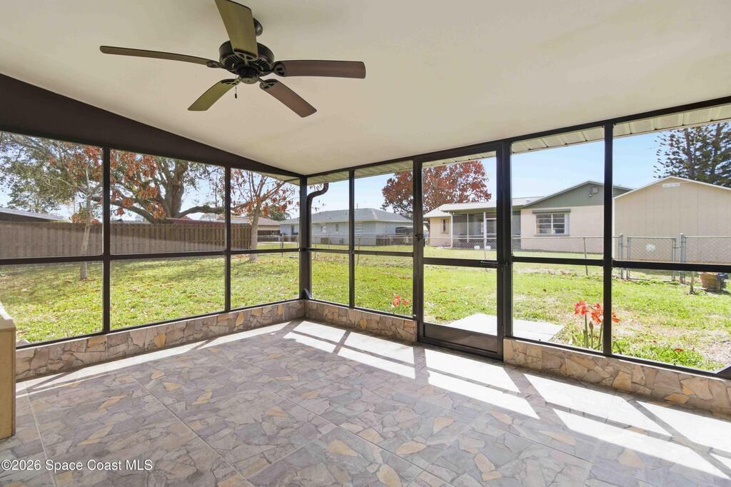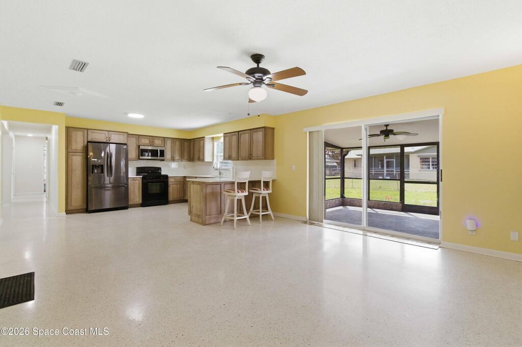 Discover your peaceful coastal retreat in Merritt Island, FL! This 3-bedroom, 2-bathroom concrete block home spans 1, 730 sq ft and sits on a quiet dead-end street with no HOA. Terrazzo flooring extends throughout the entire home, creating a sleek, seamless look. The open, sun-filled living room flows into the spacious and kitchen and dining area. The fully renovated kitchen offers ample cabinets and counter space, while the dining room features a stone-accented fireplace and sliding glass doors leading to the screened lanai. The primary bedroom includes two built-in closets and an en-suite bath. Enjoy the fully fenced backyard and a roomy 2-car garage. Just minutes from grocery stores, shopping, restaurants, and the coast, including Cape Canaveral and Cocoa Beach, this home blends comfort, convenience, and coastal charm. Mortgage savings may be available for buyers of this listing.