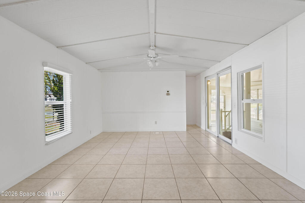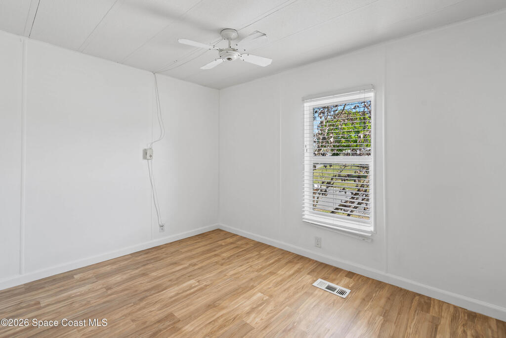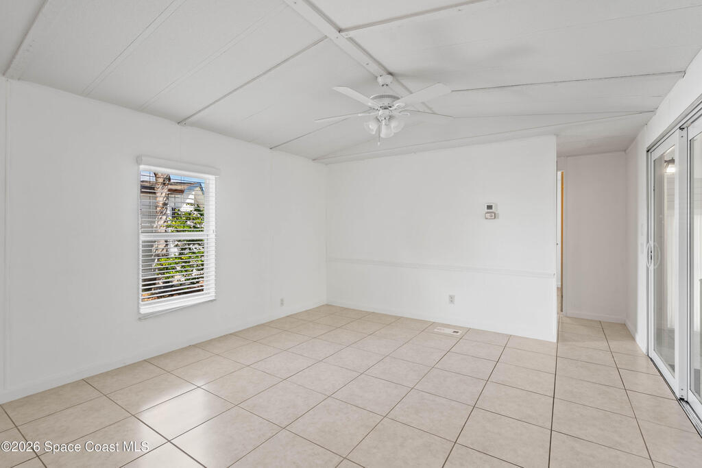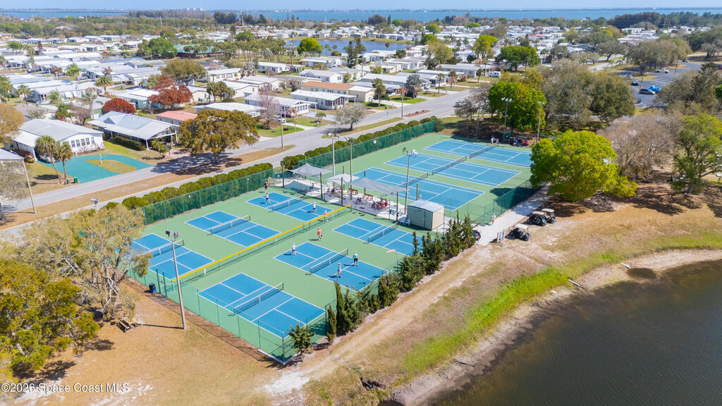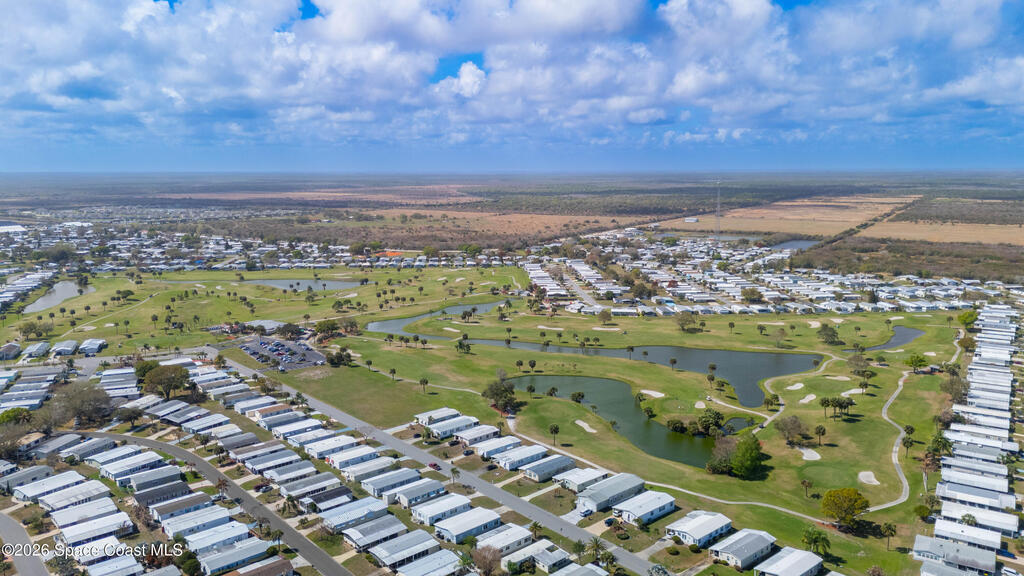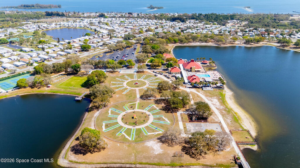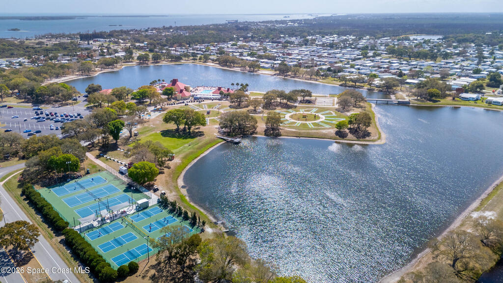 Move-in ready corner lot opportunity in Barefoot Bay! This well-maintained home offers 840 sq ft of living area plus over 500 sq ft of enclosed Florida room/flex space with windows, screens, and its own AC, creating comfortable additional living space beyond the official square footage. The enclosed area includes workshop and storage areas ideal for hobbies or projects. Inside you'll find tile flooring, vaulted ceilings, updated kitchen with white cabinetry, and a bright open living and dining layout. Both bathrooms have been updated, and the home also features a metal roof and spacious concrete driveway. Situated on a desirable corner lot with mature tropical landscaping. Located within the Barefoot Bay Recreation District offering pools, golf, tennis, pickleball, clubhouse activities, fishing pier, and beach access nearby. Exceptional value in Barefoot Bay and priced to sell. Ideal for seasonal living, full-time residence, or investment.