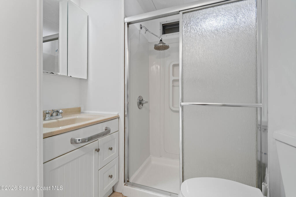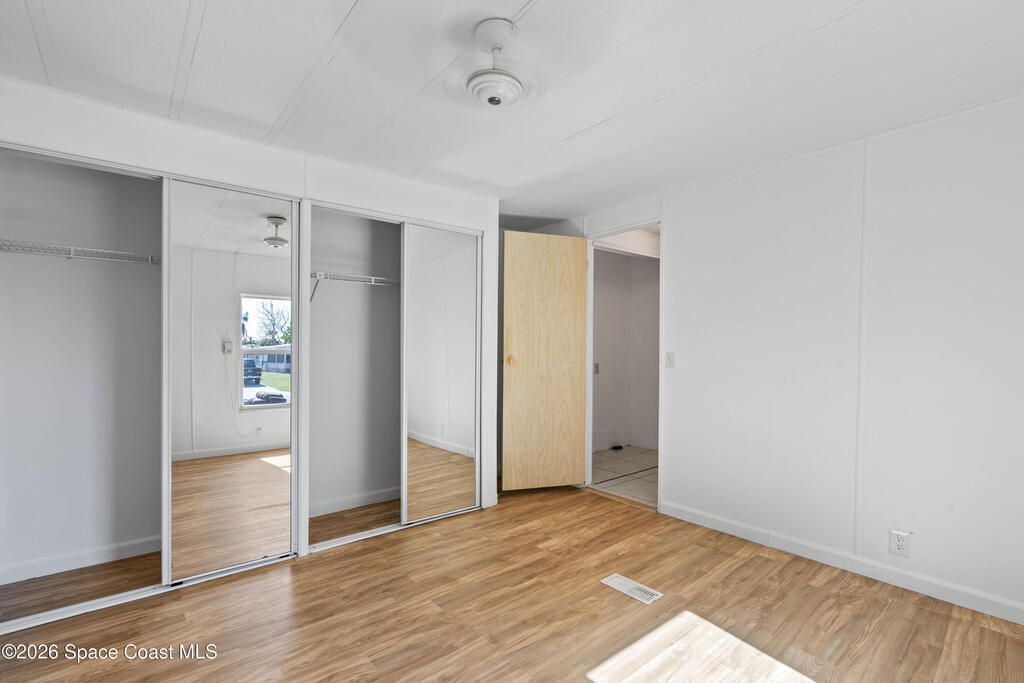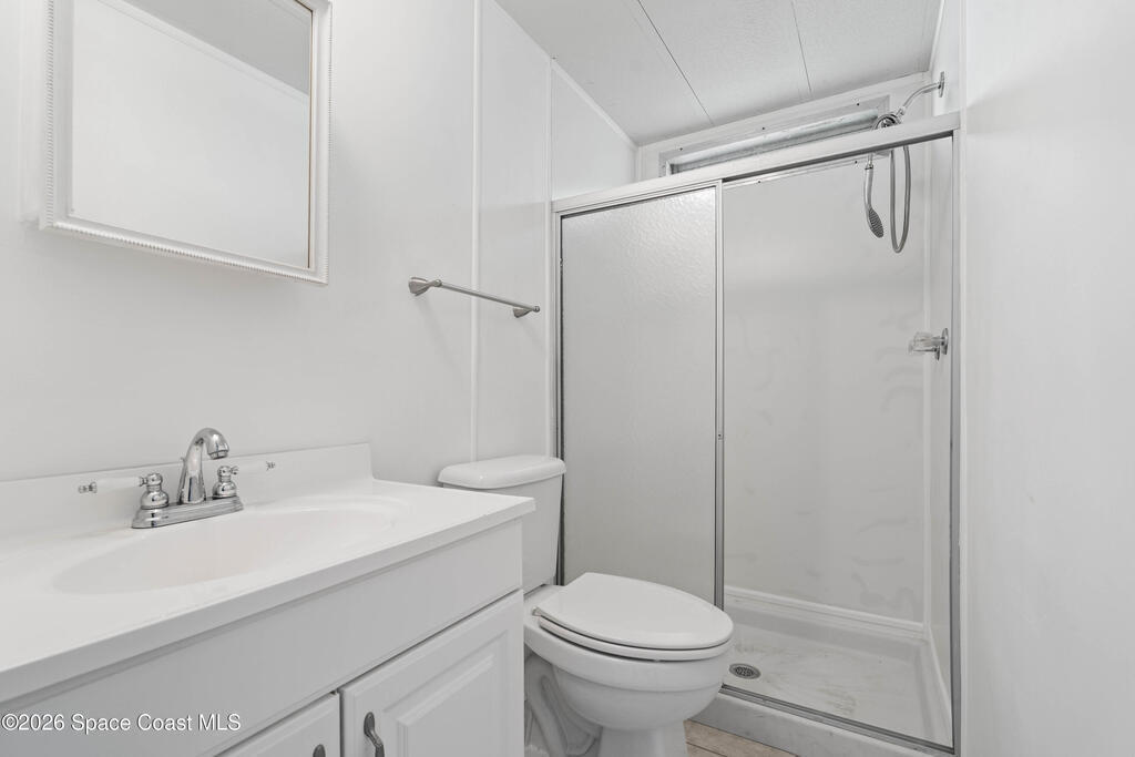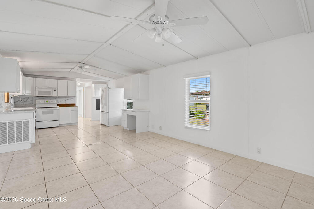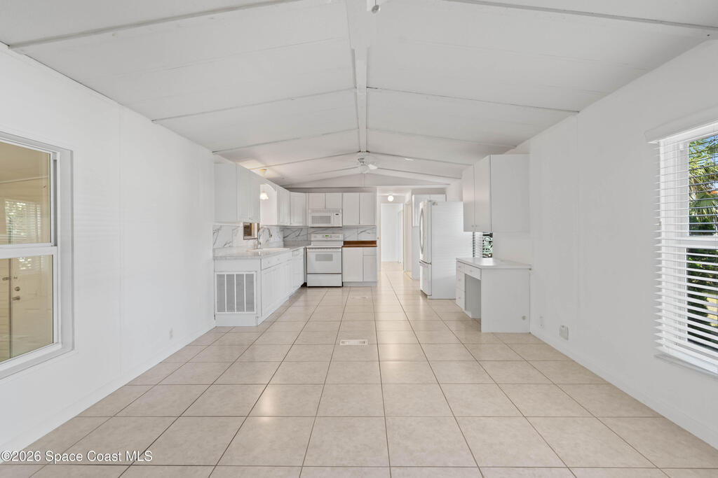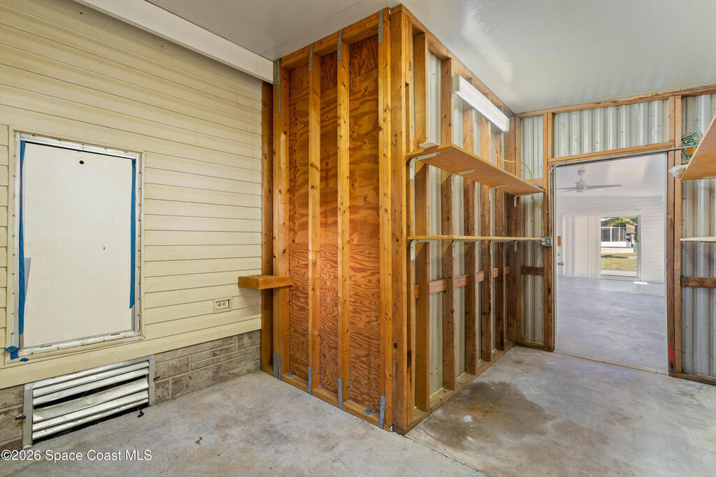 Move-in ready corner lot opportunity in Barefoot Bay! This well-maintained home offers 840 sq ft of living area plus over 500 sq ft of enclosed Florida room/flex space with windows, screens, and its own AC, creating comfortable additional living space beyond the official square footage. The enclosed area includes workshop and storage areas ideal for hobbies or projects. Inside you'll find tile flooring, vaulted ceilings, updated kitchen with white cabinetry, and a bright open living and dining layout. Both bathrooms have been updated, and the home also features a metal roof and spacious concrete driveway. Situated on a desirable corner lot with mature tropical landscaping. Located within the Barefoot Bay Recreation District offering pools, golf, tennis, pickleball, clubhouse activities, fishing pier, and beach access nearby. Exceptional value in Barefoot Bay and priced to sell. Ideal for seasonal living, full-time residence, or investment.