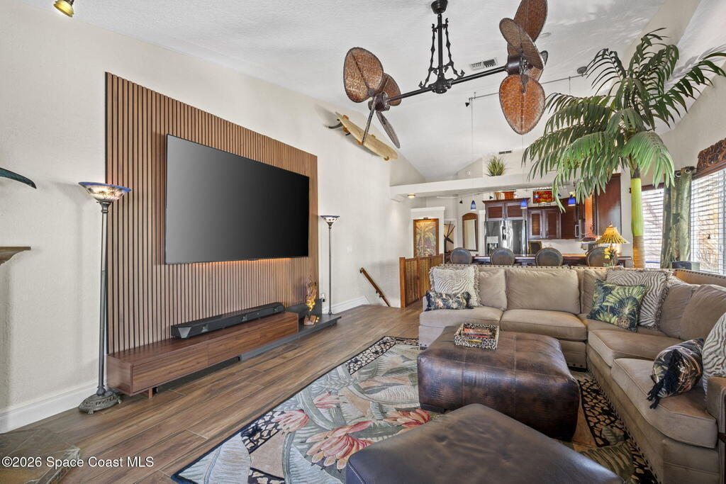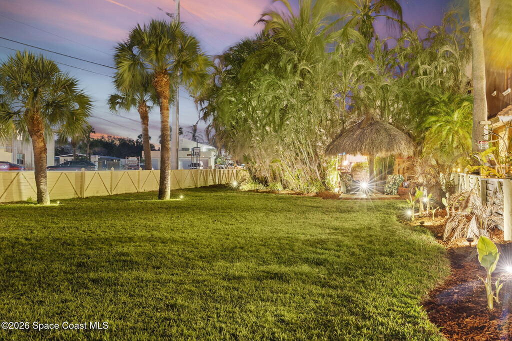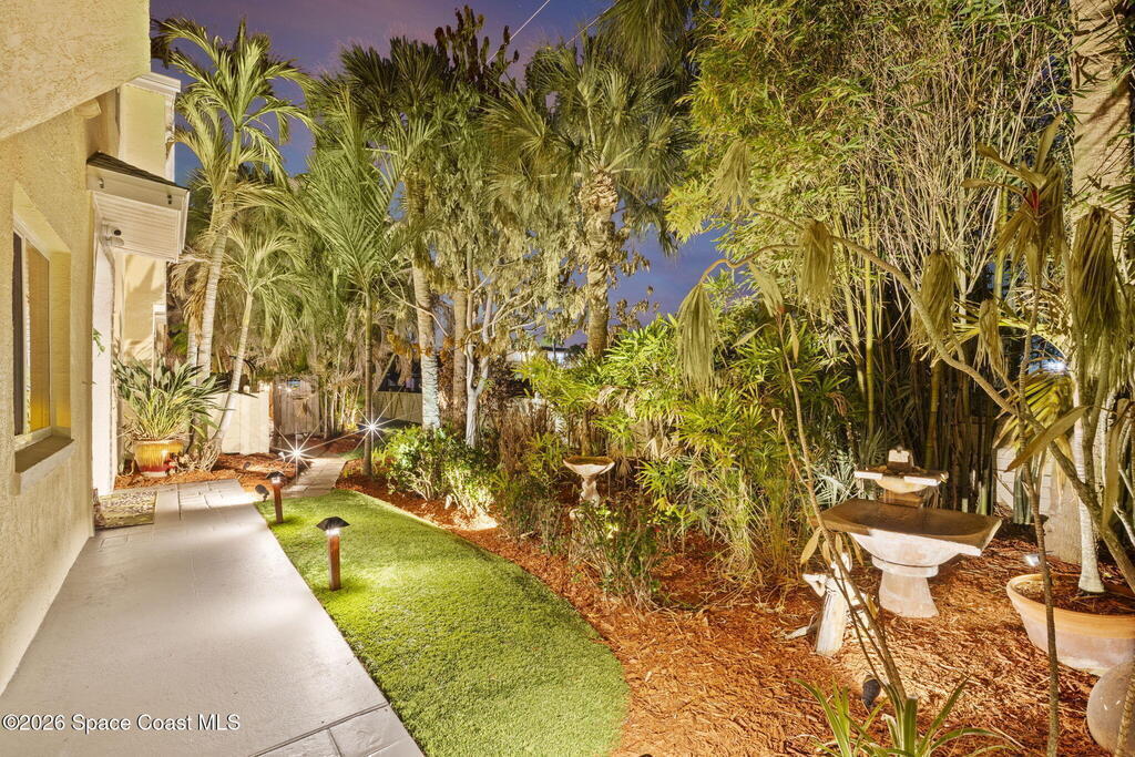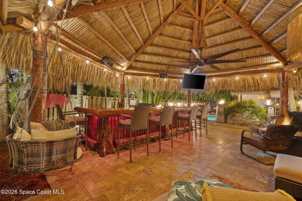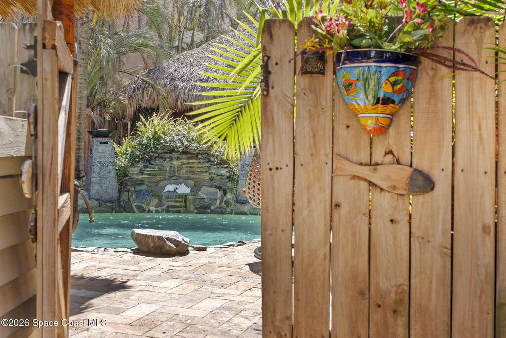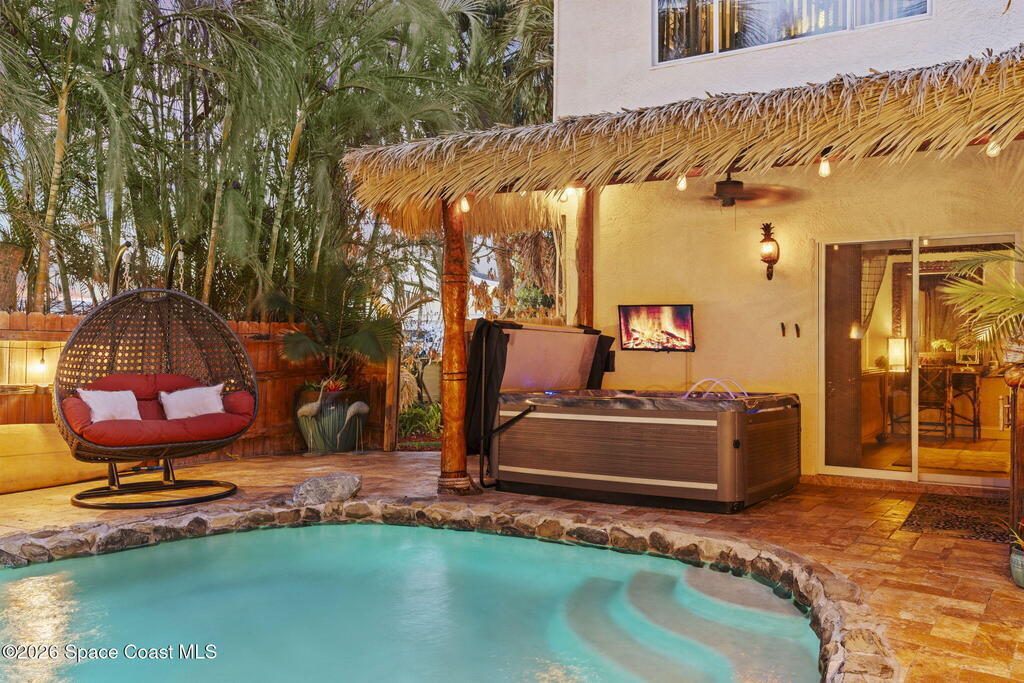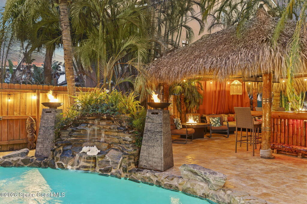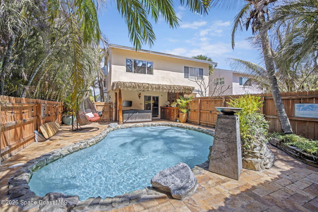 Tropical paradise just steps from the beach in Cape Canaveral! This one-of-a-kind townhome is the only property on the east side of Ridgewood Ave to span an entire city block, offering rare privacy and endless possibilities. Arrive through lush, manicured tropical landscaping that feels like your own island retreat. The backyard is an entertainer's dream with a stunning blue lagoon pool, travertine pavers, and a one-of-a-kind tiki pavilion with a fully built-out bar. A rare vacant lot provides room for a guest house, future investment property, or space for all your toys. Inside feels like a Hawaiian escape with wood-look tile floors and custom touches throughout. The open floor plan flows effortlessly as the kitchen overlooks the spacious family room with vaulted ceilings. The primary suite overlooks the tropical backyard and features a spa-like bath with steam shower and soaking tub. Downstairs includes a second bedroom, custom bath, OFFICE, and FLEX SPACE!
