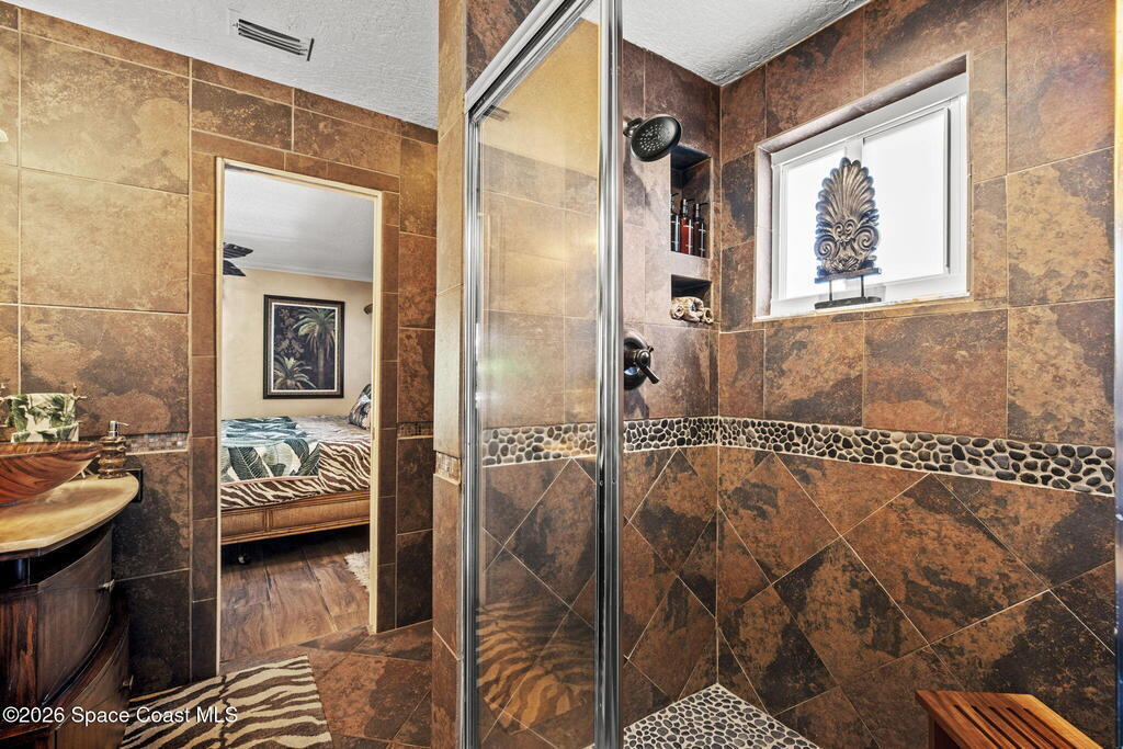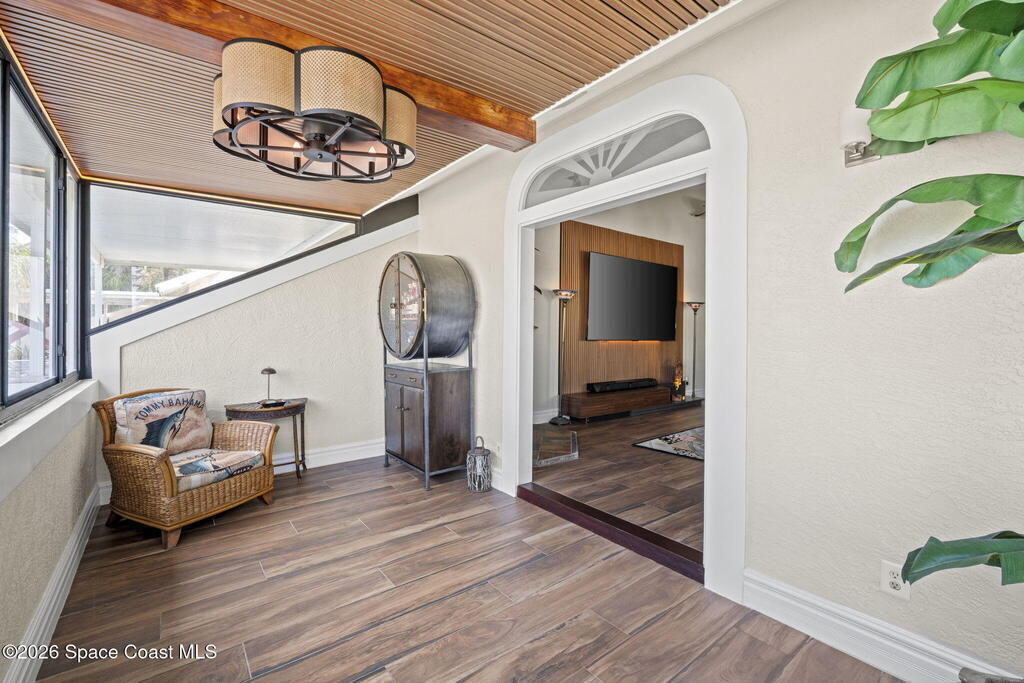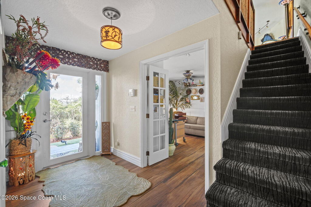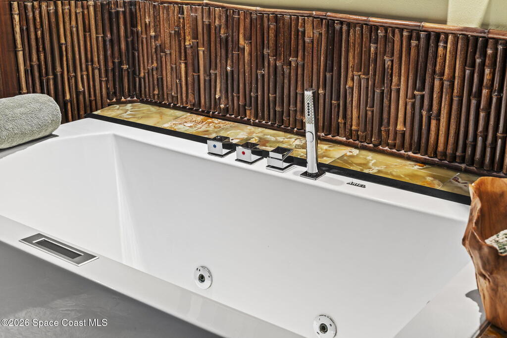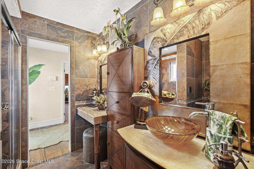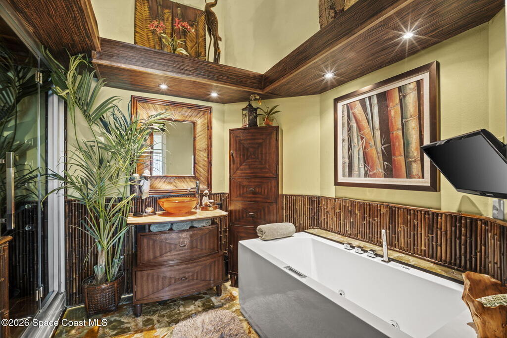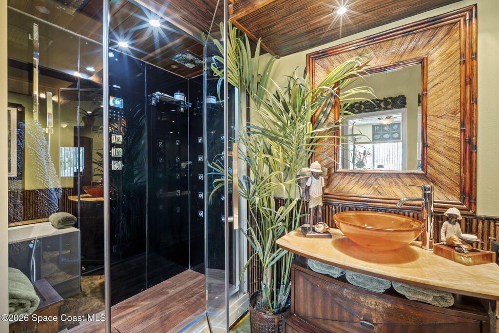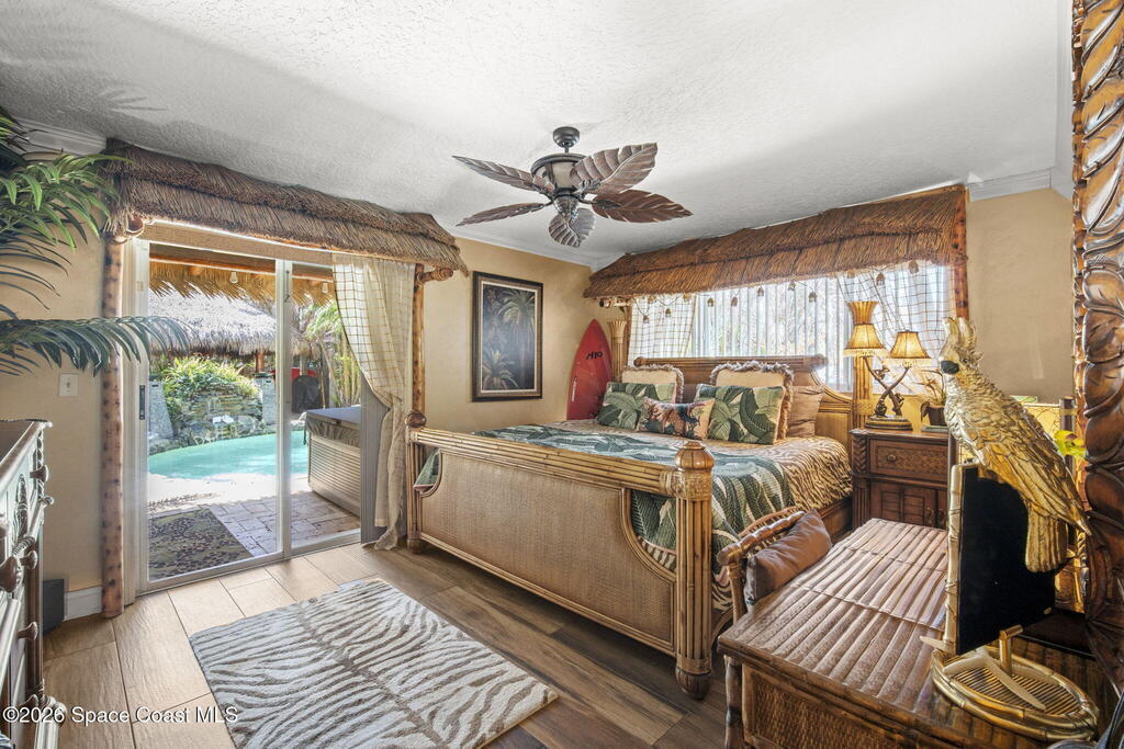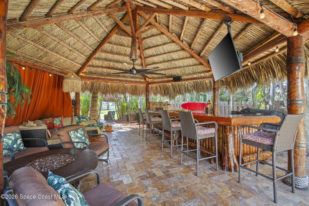 Tropical paradise just steps from the beach in Cape Canaveral! This one-of-a-kind townhome is the only property on the east side of Ridgewood Ave to span an entire city block, offering rare privacy and endless possibilities. Arrive through lush, manicured tropical landscaping that feels like your own island retreat. The backyard is an entertainer's dream with a stunning blue lagoon pool, travertine pavers, and a one-of-a-kind tiki pavilion with a fully built-out bar. A rare vacant lot provides room for a guest house, future investment property, or space for all your toys. Inside feels like a Hawaiian escape with wood-look tile floors and custom touches throughout. The open floor plan flows effortlessly as the kitchen overlooks the spacious family room with vaulted ceilings. The primary suite overlooks the tropical backyard and features a spa-like bath with steam shower and soaking tub. Downstairs includes a second bedroom, custom bath, OFFICE, and FLEX SPACE!