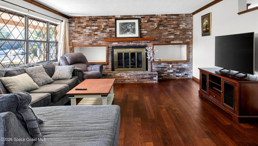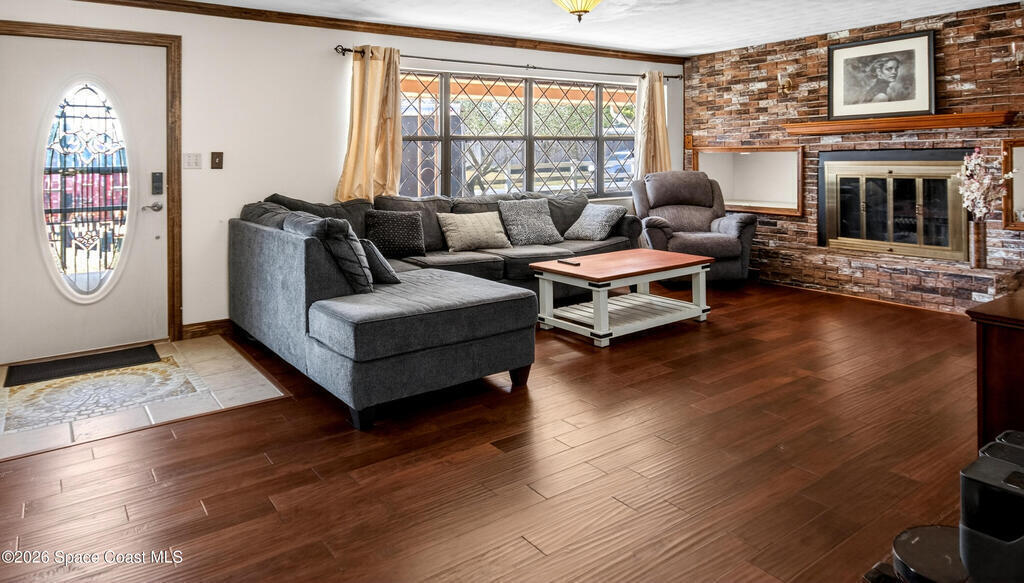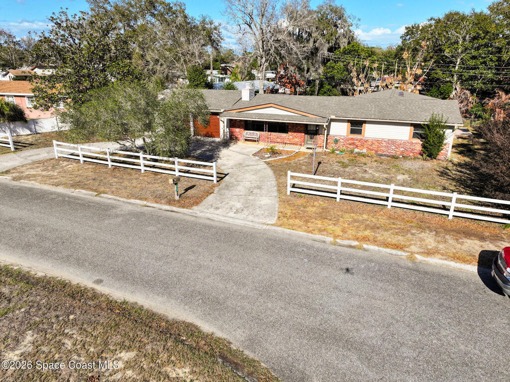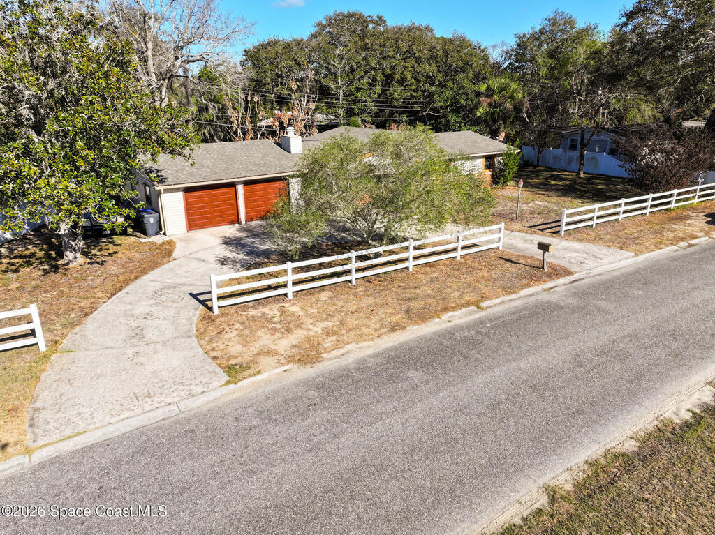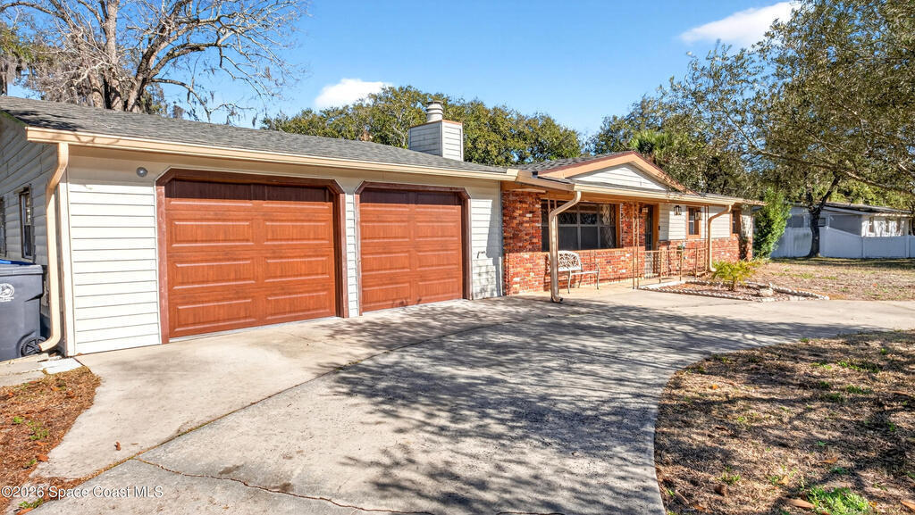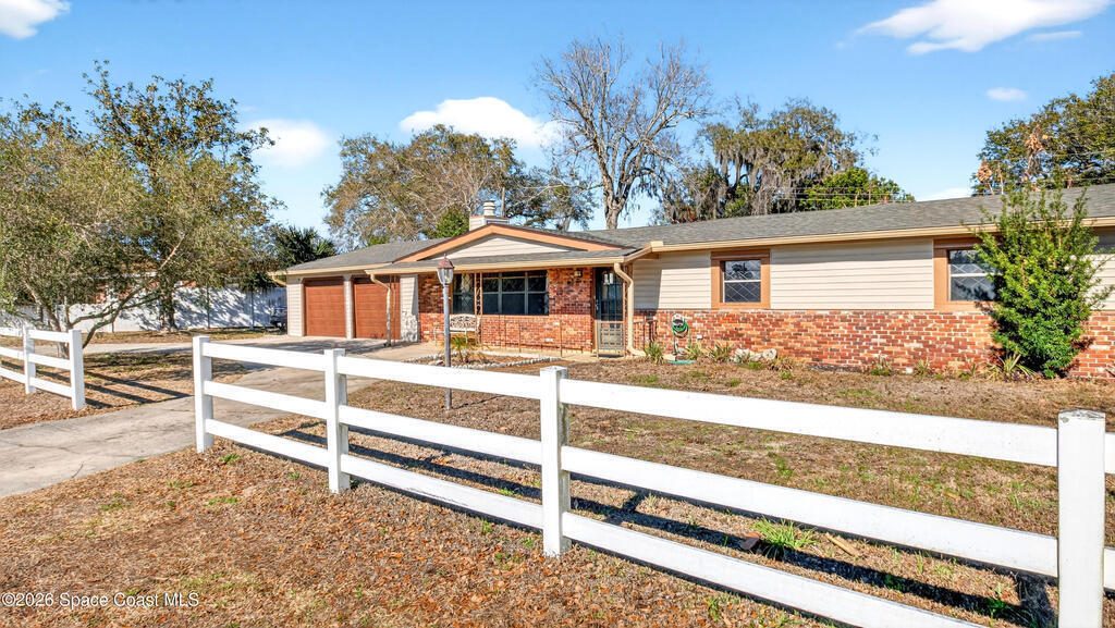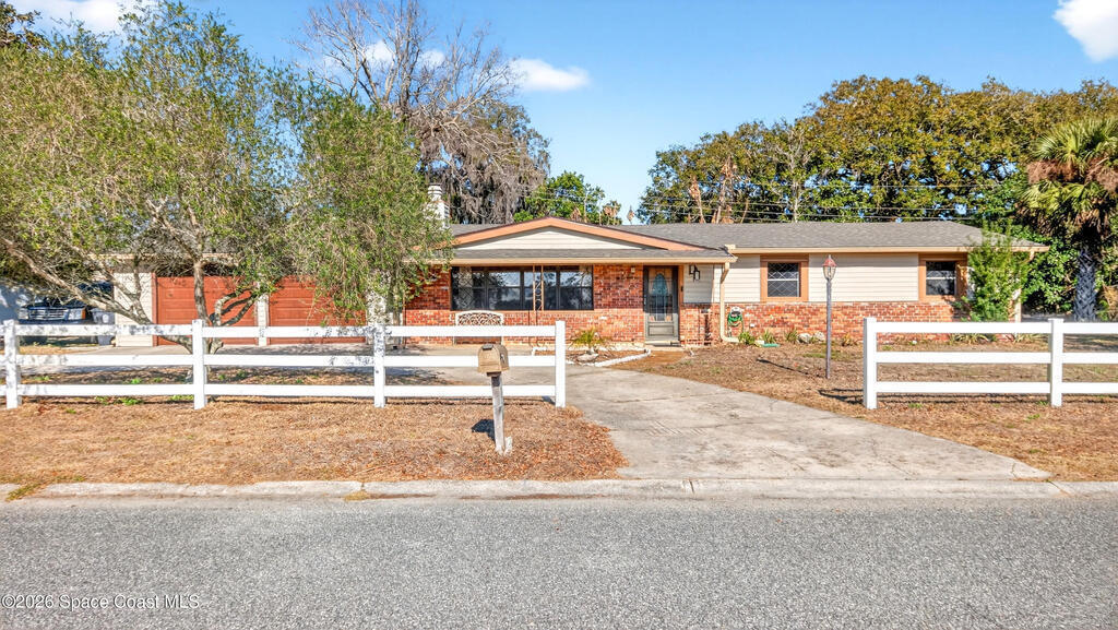 Charming Titusville home in the heart of Florida's Space Coast! A circular driveway and oversized 2-car garage welcome you to this brick-accented residence with great curb appeal. Inside, the inviting living area features wood-style flooring and a dramatic floor-to-ceiling brick fireplace with built-in niches. The galley kitchen offers granite countertops and abundant wood cabinetry. The primary bedroom is a relaxing retreat with elegant French doors that open to a massive sunroom--perfect for morning coffee or entertaining. Dedicated laundry room for added convenience. The yard features fruit-bearing starfruit and olive trees. Ideally located across from Kennedy Space Center where you can watch rocket launches from your back porch. Minutes from world-class fishing in the Indian River and Mosquito Lagoon, Playalinda Beach, and Hwy 50 with direct access to Orlando.