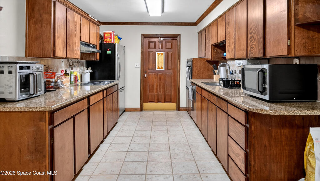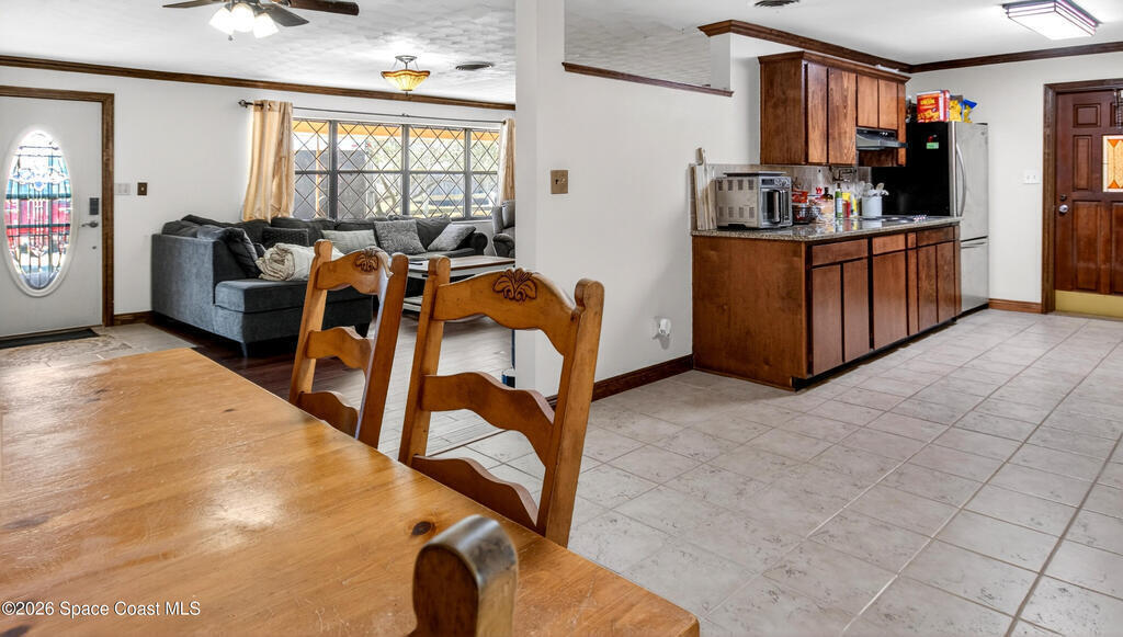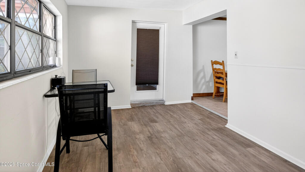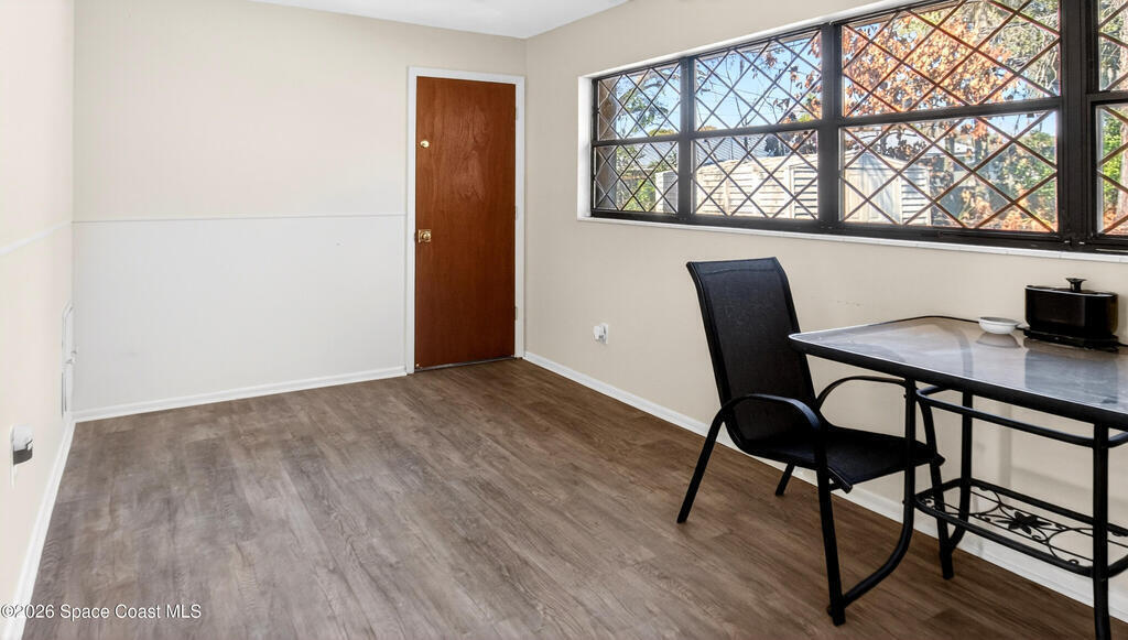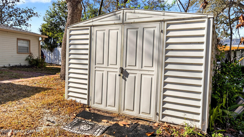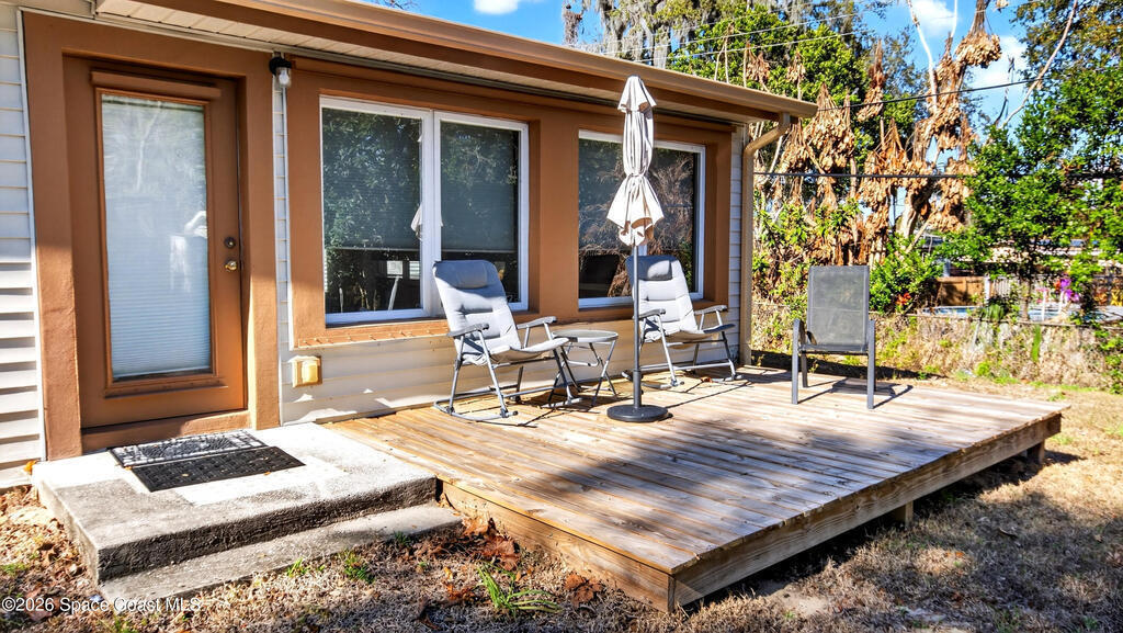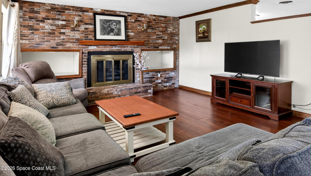 Charming Titusville home in the heart of Florida's Space Coast! A circular driveway and oversized 2-car garage welcome you to this brick-accented residence with great curb appeal. Inside, the inviting living area features wood-style flooring and a dramatic floor-to-ceiling brick fireplace with built-in niches. The galley kitchen offers granite countertops and abundant wood cabinetry. The primary bedroom is a relaxing retreat with elegant French doors that open to a massive sunroom--perfect for morning coffee or entertaining. Dedicated laundry room for added convenience. The yard features fruit-bearing starfruit and olive trees. Ideally located across from Kennedy Space Center where you can watch rocket launches from your back porch. Minutes from world-class fishing in the Indian River and Mosquito Lagoon, Playalinda Beach, and Hwy 50 with direct access to Orlando.
