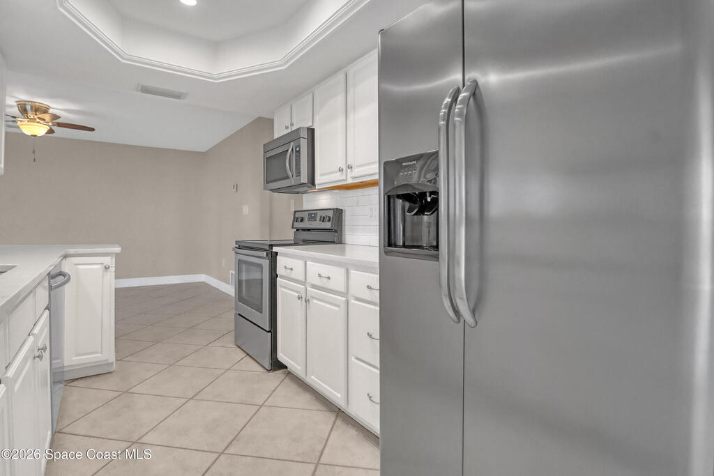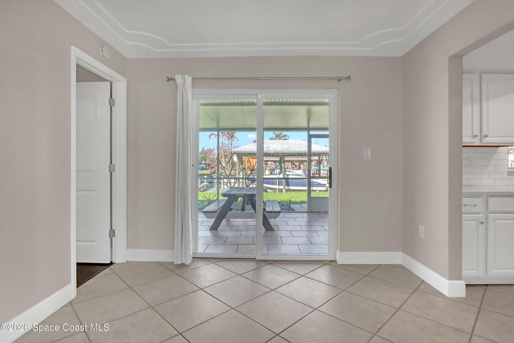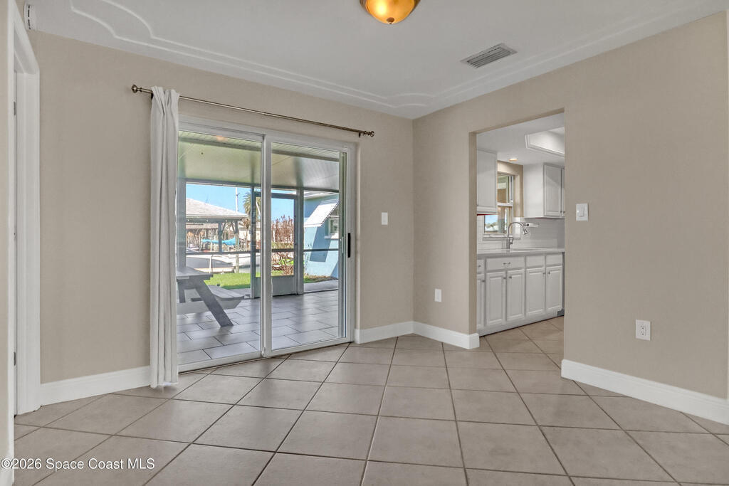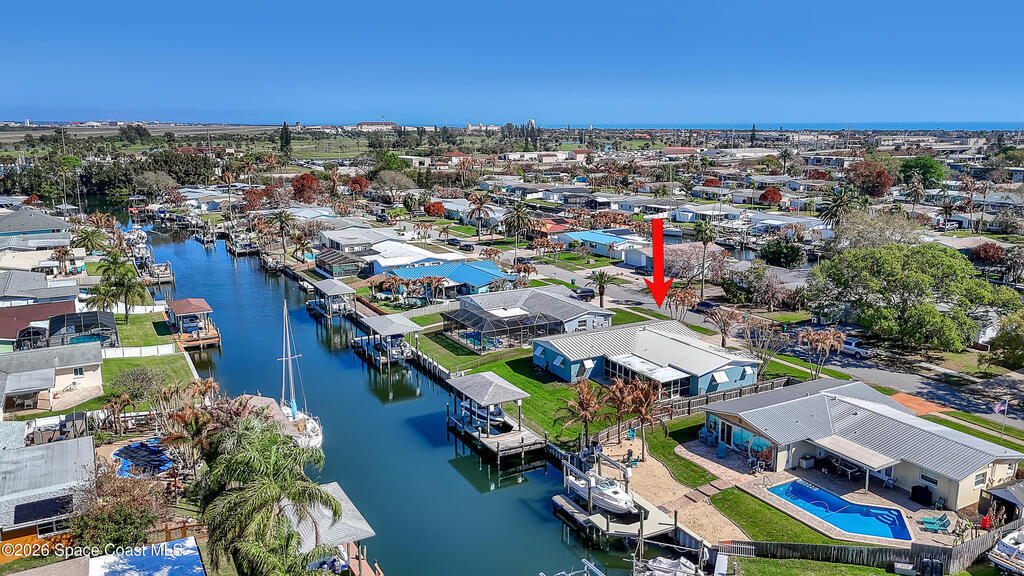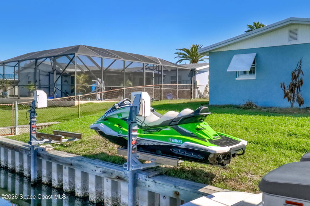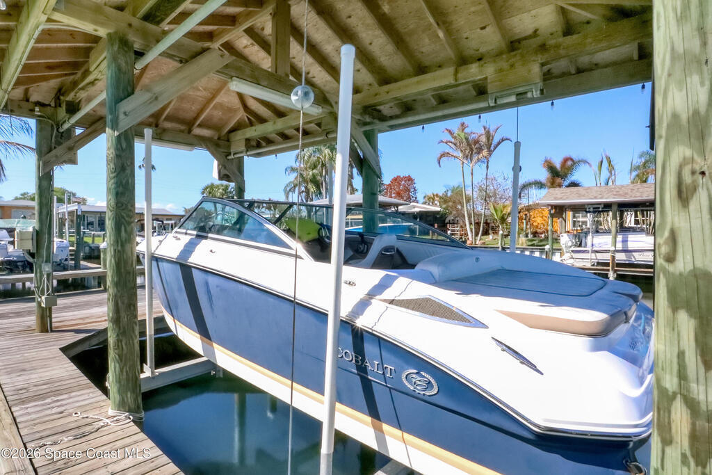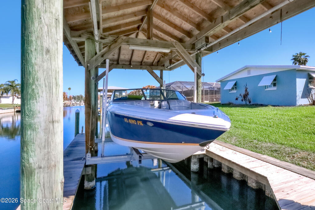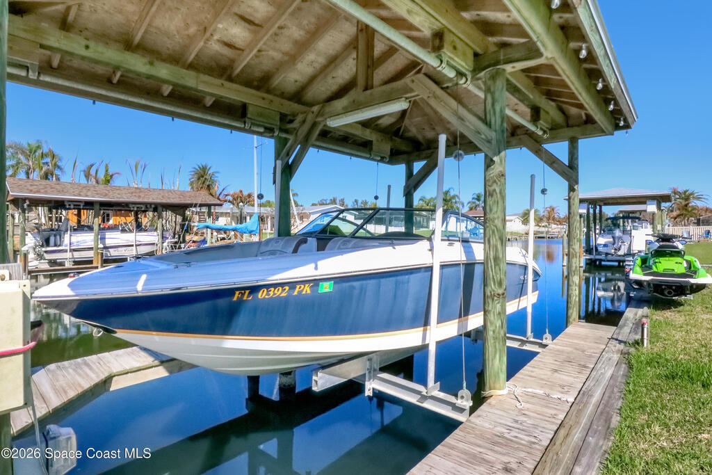 Boater's paradise on a deepwater canal with 85 ft of waterfront, covered dock, expansive sun pad, 80' boat lift, 2012 Cobalt 232 Bowrider, 2021 Yamaha FX Cruiser, and two powered jet ski lifts. This 4-bed, 2-bath home offers a galley kitchen with stainless appliances, quartz counters, white cabinetry, and subway tile backsplash. Enjoy multiple living areas including formal living/dining, family room/flex space, and a huge screened porch. Split floor plan with large en-suite primary and three additional bedrooms plus cabana bath with backyard access. Impeccably maintained: plantation shutters, metal roof, hurricane window & door protection, Tesla charger, no carpet, washer/dryer, storage shed, and side-entry garage door. Canal dredged in 2025. Underground utilities. Minutes to Space Force Base and quick boat access to the Banana River. Outstanding location near the beach and top-rated schools--ideal as a primary or second home.