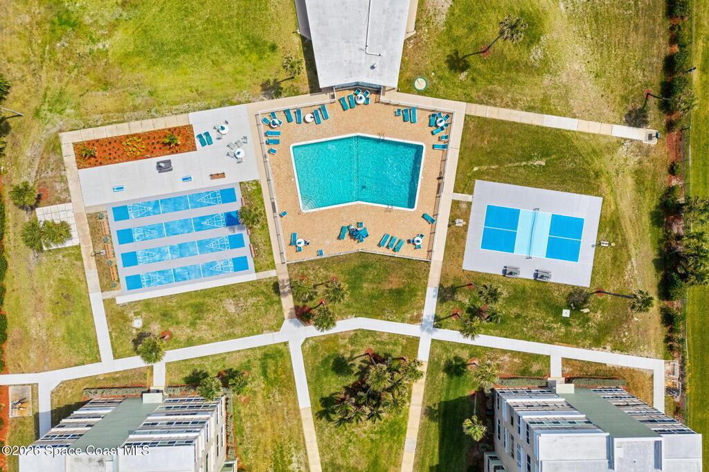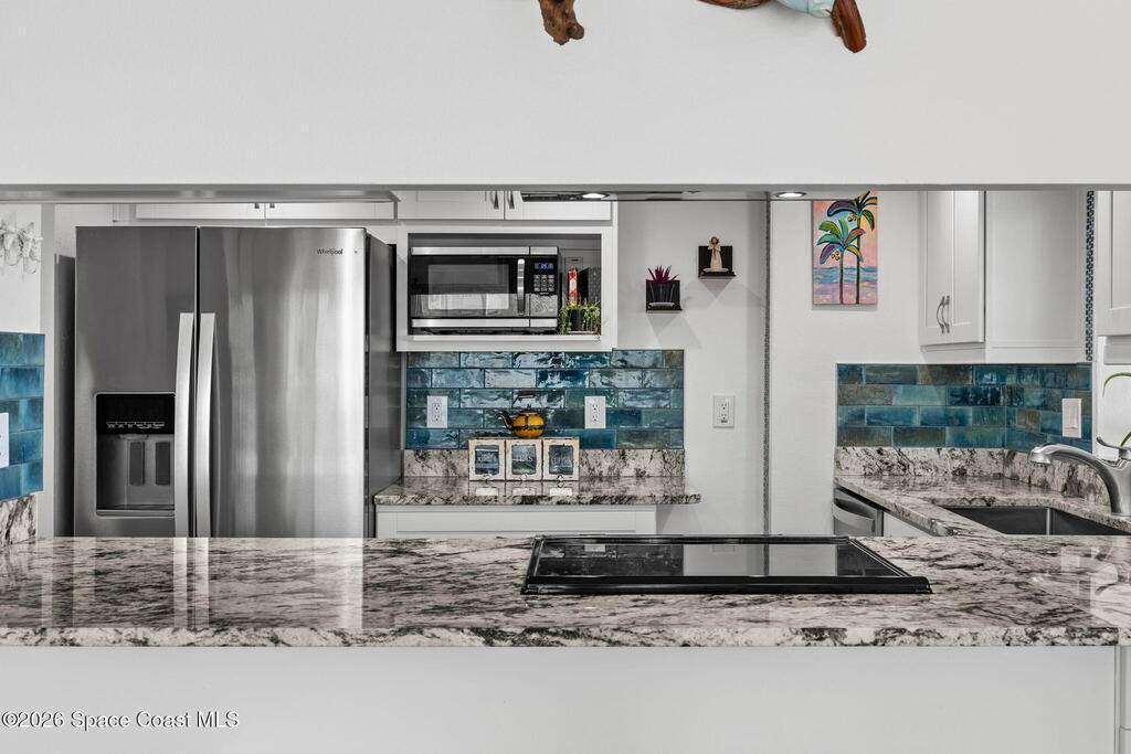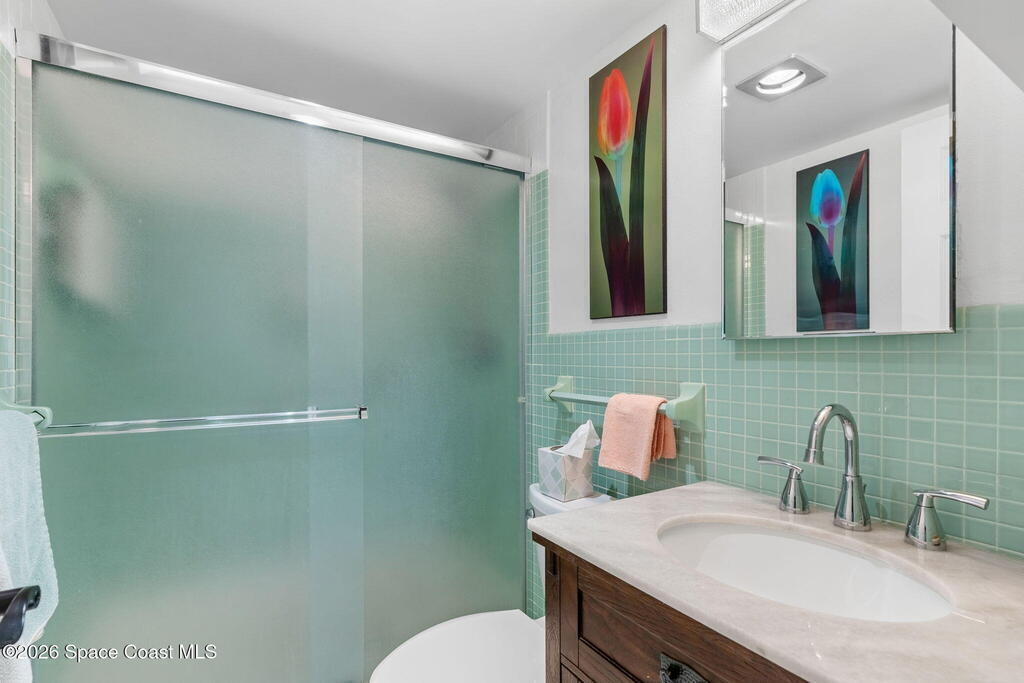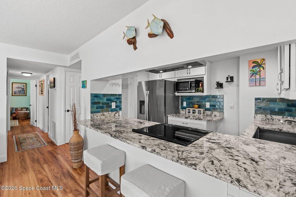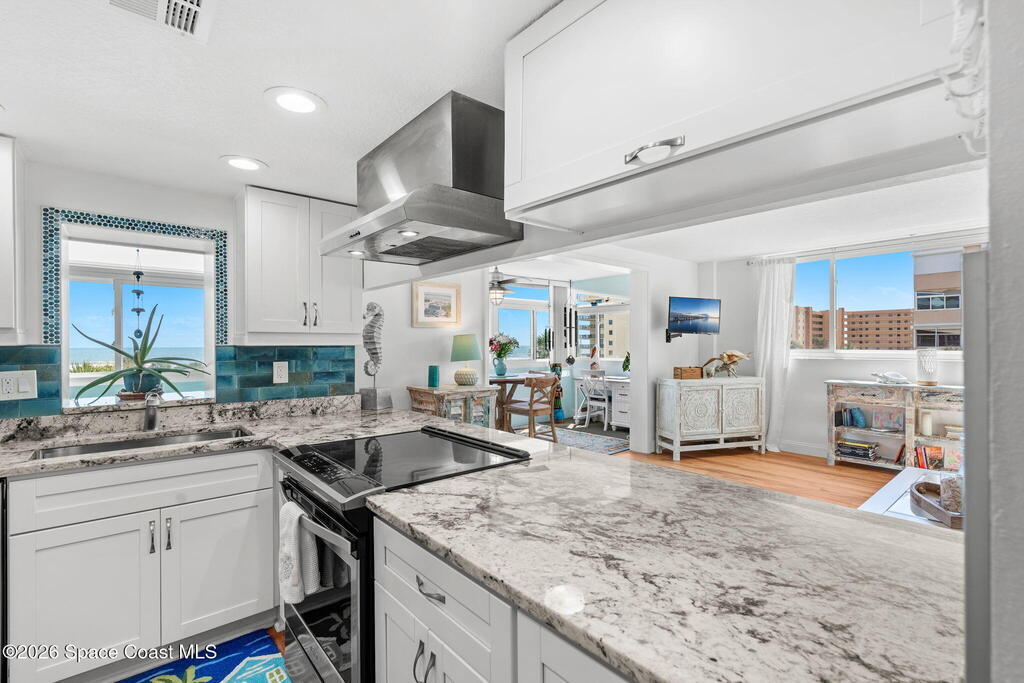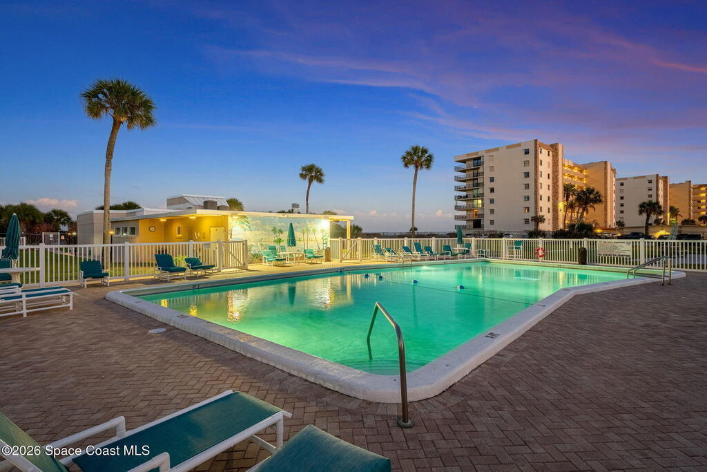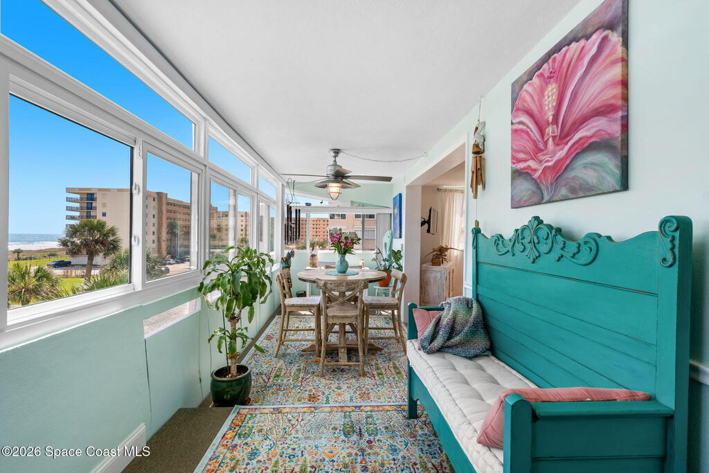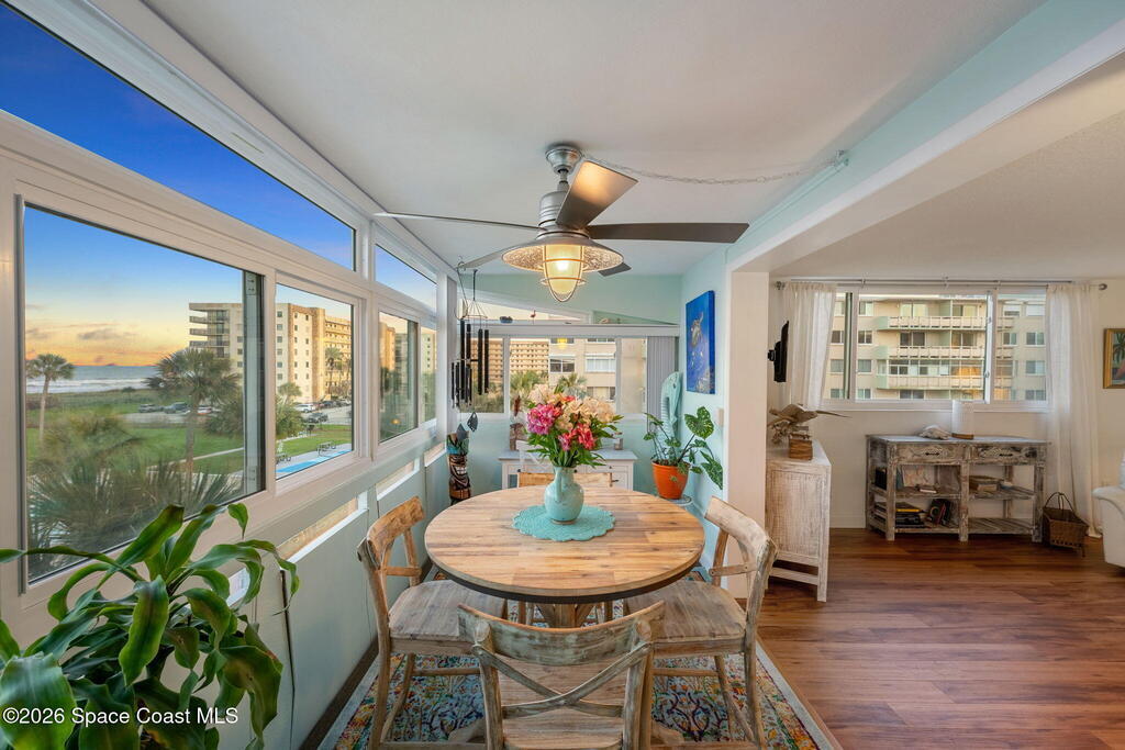 4TH FLOOR 2/2 BEACHFRONT BEAUTY!!! One of only 12 direct ocean units in the complex!20 magnificent feet of wall-to-wall, direct ocean-facing windows bring in abundant natural light and uninterrupted water views at this Cocoa Beach iconic Twin Towers condo. Originally constructed in1964 for NASA families during the height of the Space Race, it's one of the largest 2/2 units offering 1, 089 sq ft of modern meets mid-century coastal living: Clean lines, expansive glass, and a layout oriented toward the Atlantic. The updated kitchen features ocean blue subway tile, stainless appliances, and gorgeous granite PLUS a pass thru window at deep farm sink offering ocean views. Pecan luxury vinyl plank blends beautifully, and the original 60's bathrooms perfectly blend old with new. Both bedrooms open to a shared side balcony with additional ocean views, creating a seamless indoor-outdoor connection and natural cross breezes.Windows like these don't stay open long. Blink...and you will miss it!