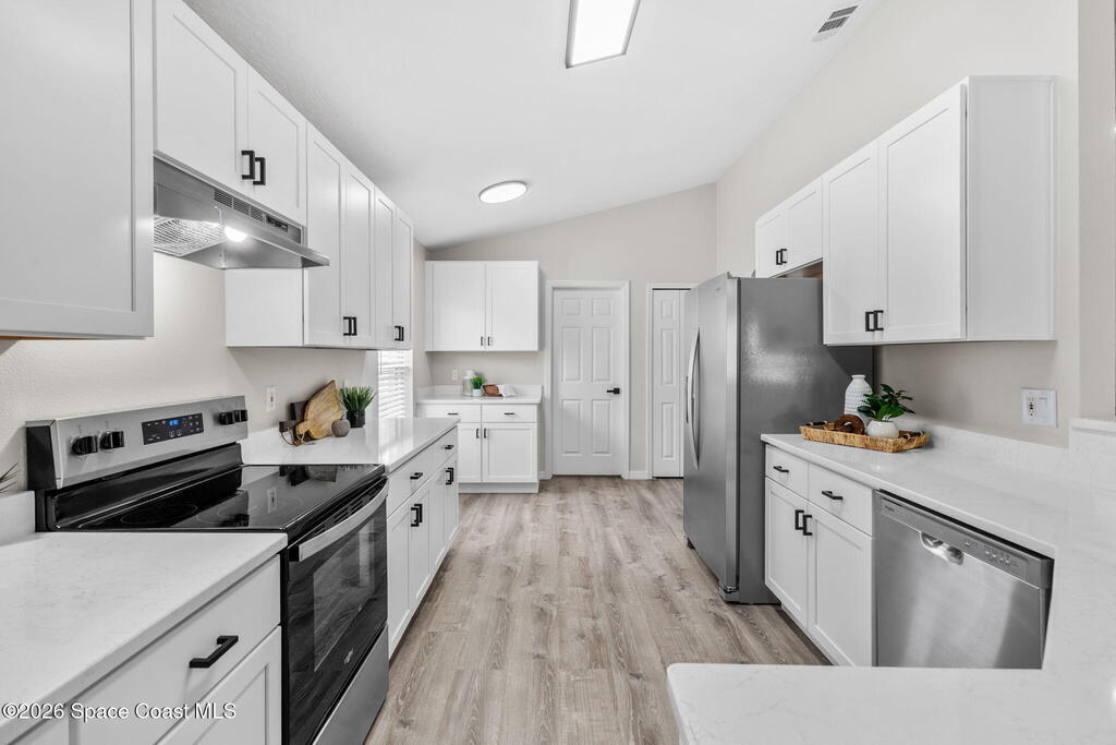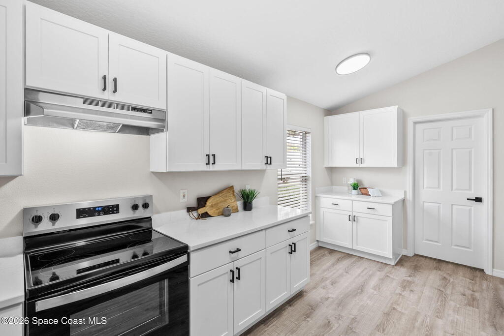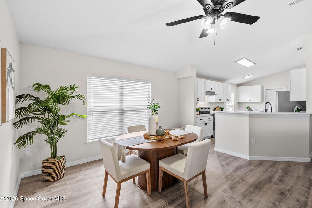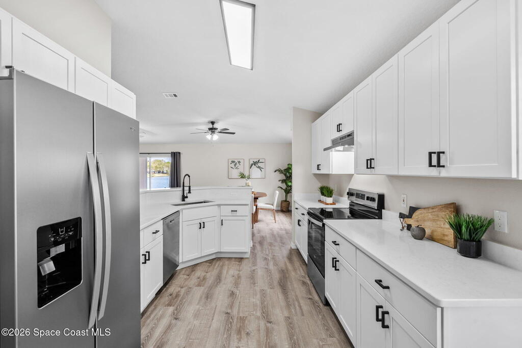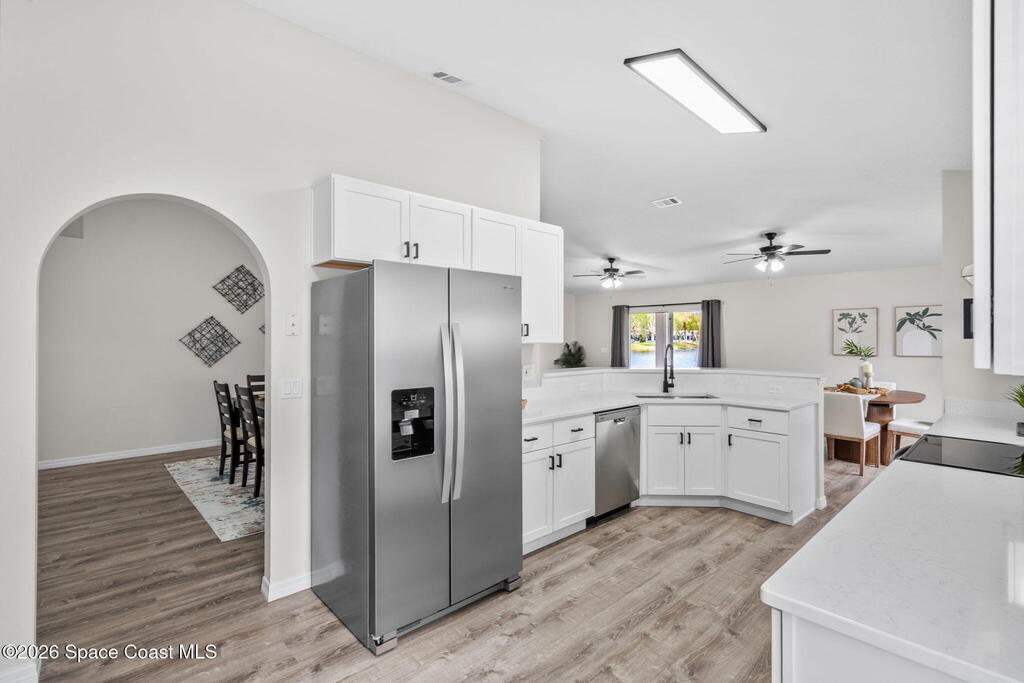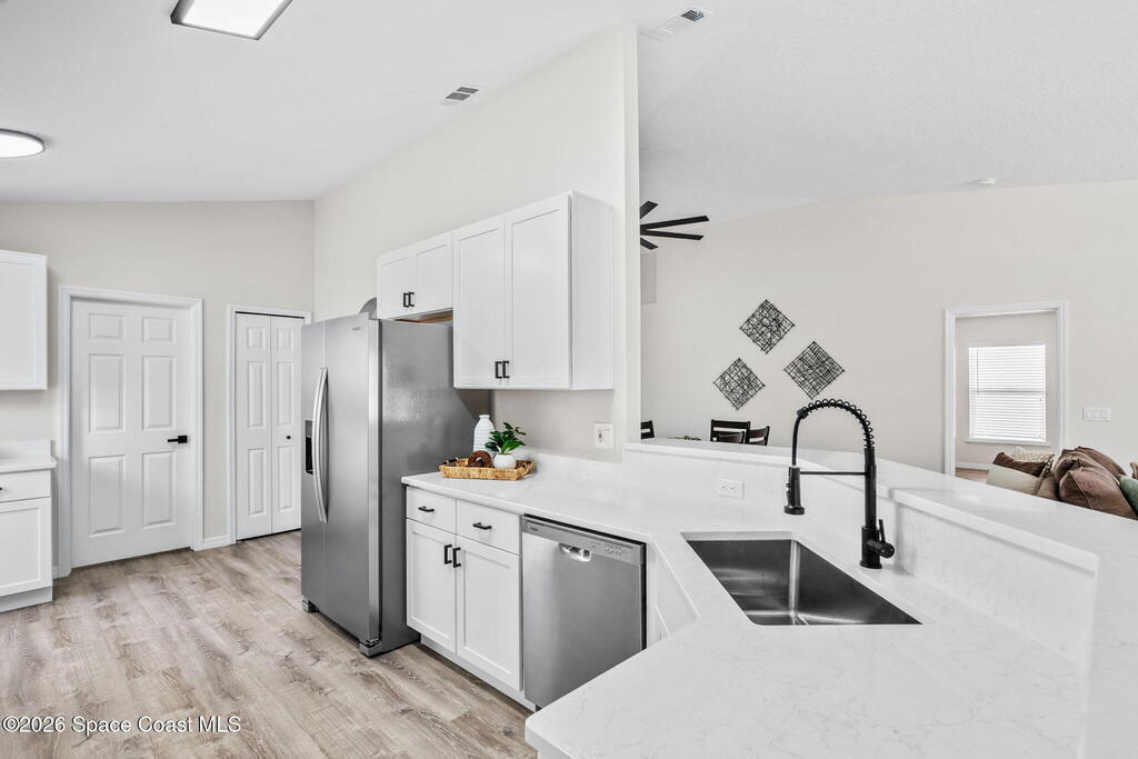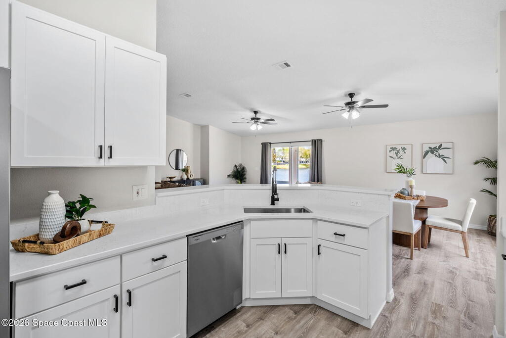 Completely renovated and move in ready, this lakefront home in Meadow Lake offers modern finishes, open living space, and beautiful water views. This gorgeous 3 bed, 2 bath home with a 2 car garage offers 1, 903 sq ft and one of the best lake views in the neighborhood. Inside, everything is brand new including LifeProof waterproof luxury vinyl plank flooring, fresh interior paint, and a stunning kitchen that has never been used. The kitchen features quartz countertops, soft close shaker cabinets, Whirlpool stainless steel appliances, and a custom coffee bar. The open and versatile layout provides space for living, dining, an eat in kitchen, and a flexible area for an office, library, or play space. Both bathrooms are beautifully updated with modern vanities, mirrors, and lighting. Enjoy peaceful lake views. sunsets and rocket launches from the covered and screened patio plus an additional outdoor patio ready for grilling or relaxing. Fresh sod, Community pool, Summer is almost here!