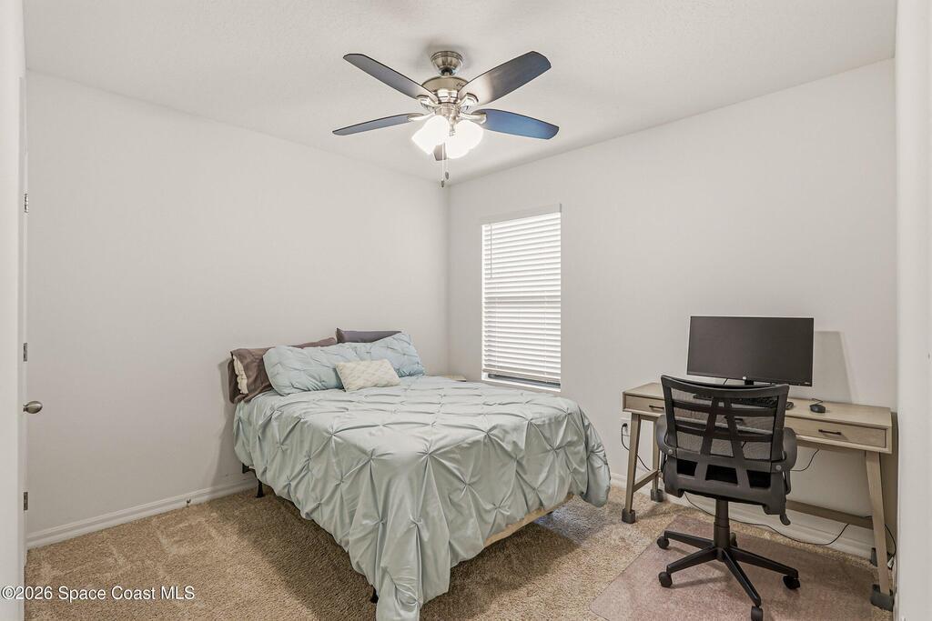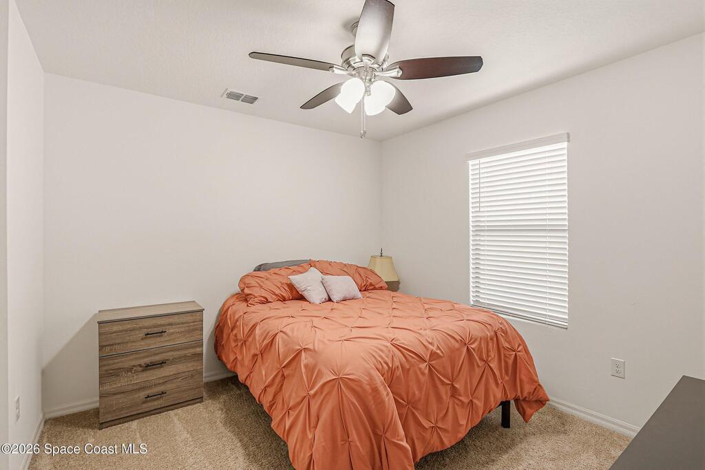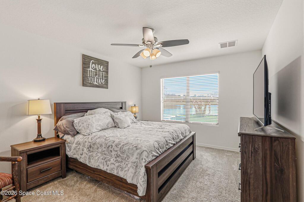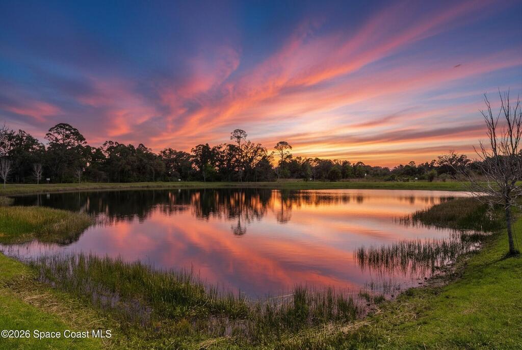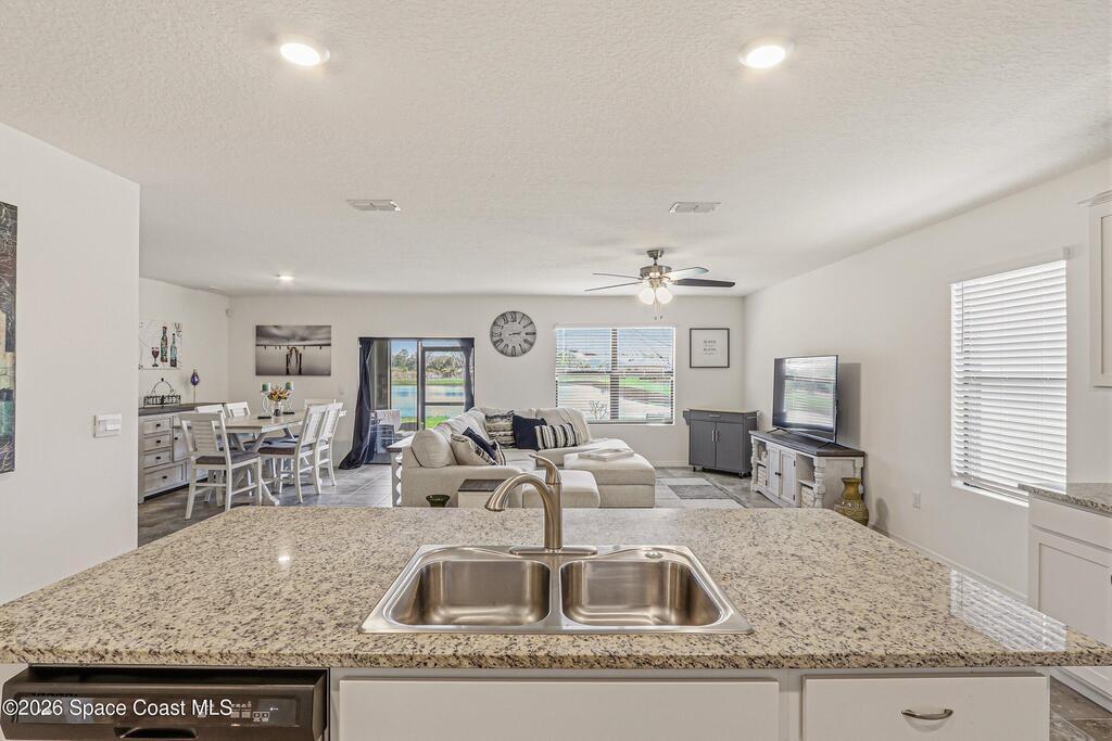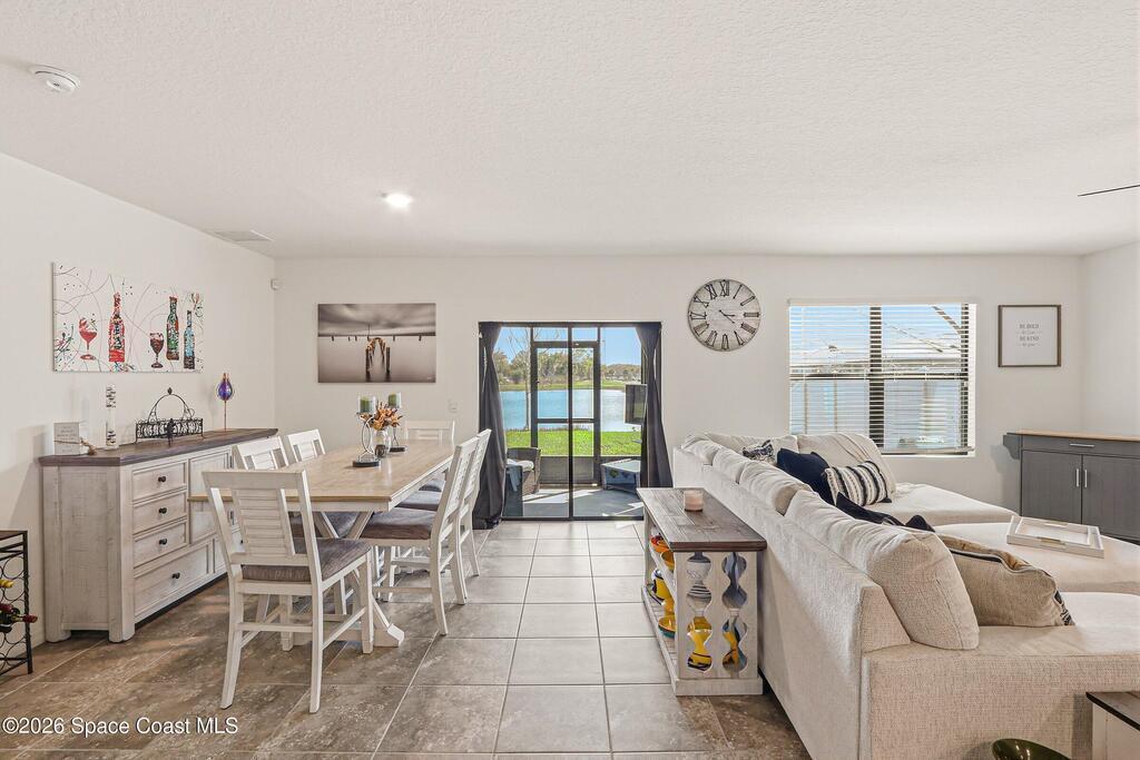 4b/2b move-in ready home in SE Palm Bay w/peaceful backyard water views & a bright, open layout designed for everyday living. The spacious kitchen anchors the home w/island seating overlooking the dining & family room, creating a natural gathering space that flows easily to the screened lanai. Step outside to the back patio & enjoy the calm waterfront backdrop. The owner's suite overlooks the water, includes step-in shower & offers a relaxing retreat feel. Two bedrooms at the front of the home share a well-placed bath w/tub/shower combo, while a flexible 4th bedroom works perfectly as an office, guest room or bonus space. Full-size laundry room, large pantry, ceiling fans throughout & 2-car garage add everyday convenience. Community pool & playground nearby, plus walking distance to shopping including Publix & quick access to I-95. If you're looking for comfort, views & convenience in one home, this one is worth seeing.