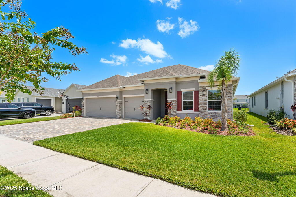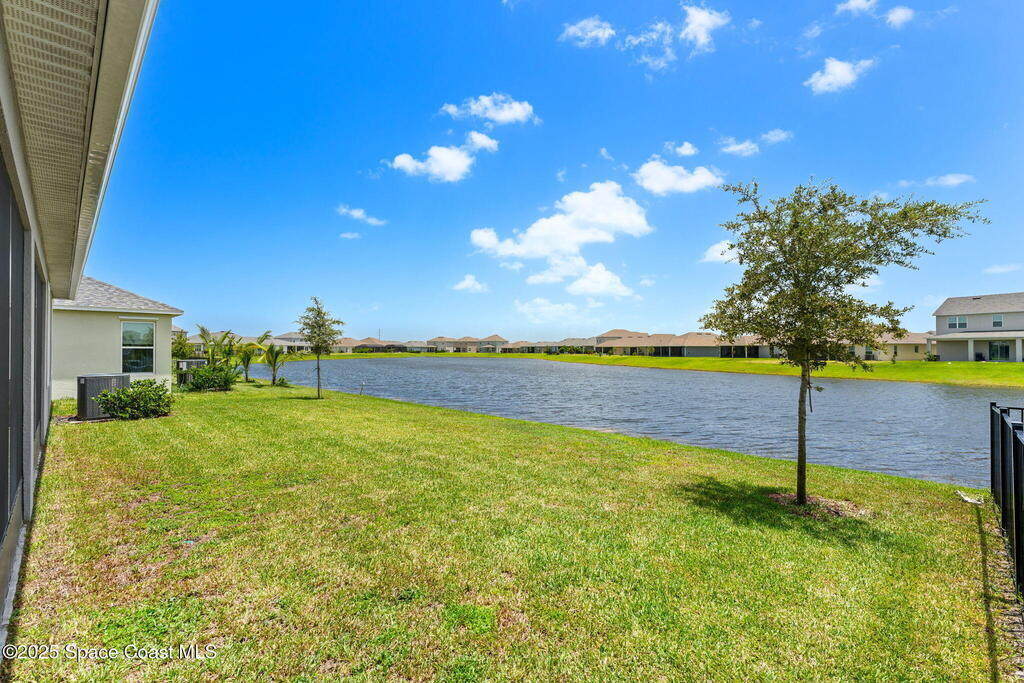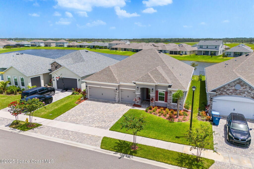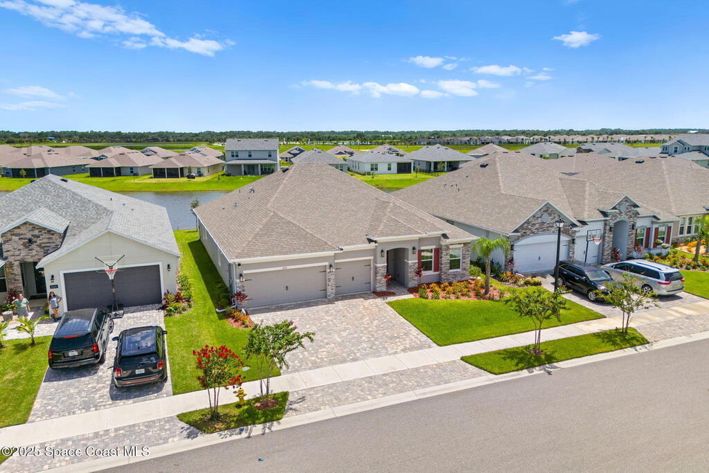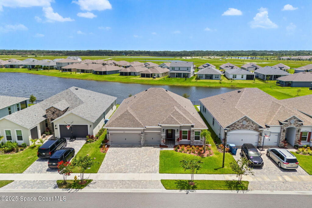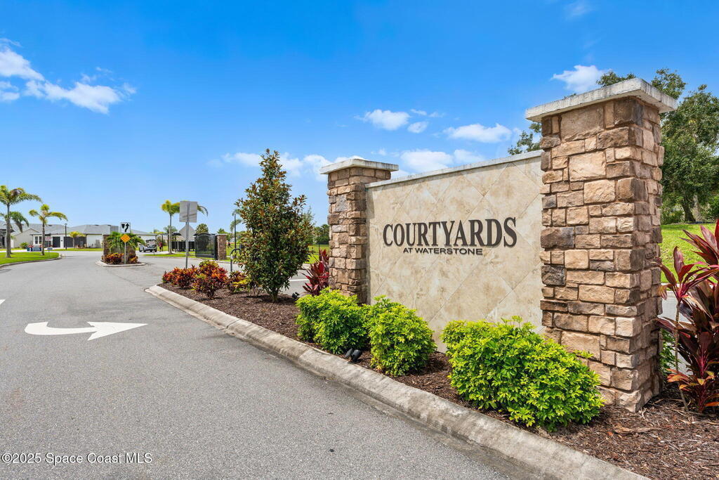 Located in the gated, lakefront community of Courtyards at Waterstone, this spacious 4-bedroom, 3-bathroom home blends comfort and convenience. The open-concept layout features a large great room with vaulted ceilings, crown molding, ceramic tile flooring, and 8-foot doors throughout. The kitchen boasts a massive island that flows seamlessly into the living area, along with quartz countertops, a breakfast bar, pantry, and stainless appliances--perfect for entertaining. The primary suite offers a walk-in closet, dual sinks, soaking tub, and separate shower. Additional highlights include a screened lanai with peaceful lake views, blinds throughout, laundry room with utility sink, stone-accented front elevation, 3-car garage, and full irrigation system. Enjoy the community pool, all just minutes from shopping, top-rated schools, and easy access to I-95. This is Florida living at its finest!