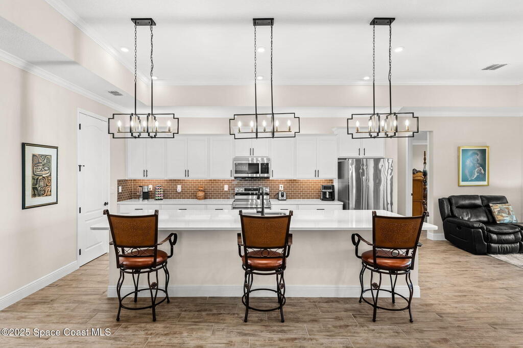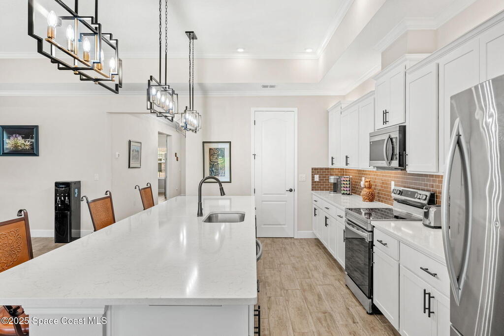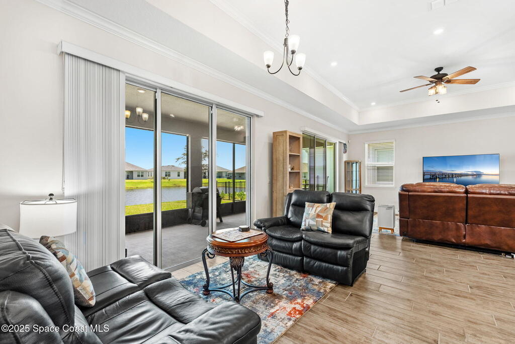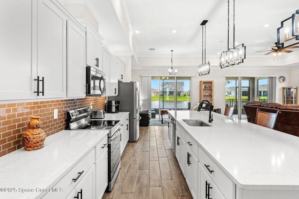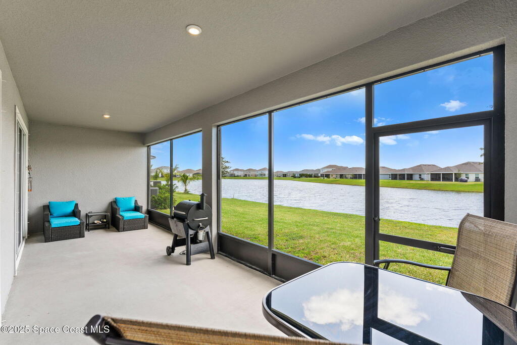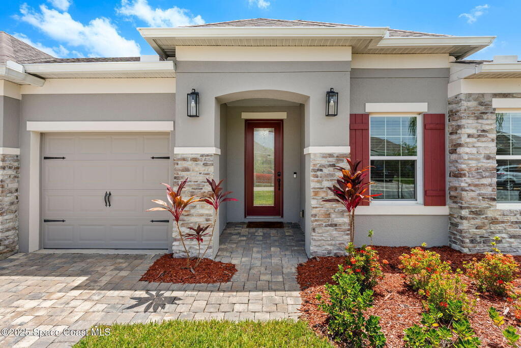 Located in the gated, lakefront community of Courtyards at Waterstone, this spacious 4-bedroom, 3-bathroom home blends comfort and convenience. The open-concept layout features a large great room with vaulted ceilings, crown molding, ceramic tile flooring, and 8-foot doors throughout. The kitchen boasts a massive island that flows seamlessly into the living area, along with quartz countertops, a breakfast bar, pantry, and stainless appliances--perfect for entertaining. The primary suite offers a walk-in closet, dual sinks, soaking tub, and separate shower. Additional highlights include a screened lanai with peaceful lake views, blinds throughout, laundry room with utility sink, stone-accented front elevation, 3-car garage, and full irrigation system. Enjoy the community pool, all just minutes from shopping, top-rated schools, and easy access to I-95. This is Florida living at its finest!