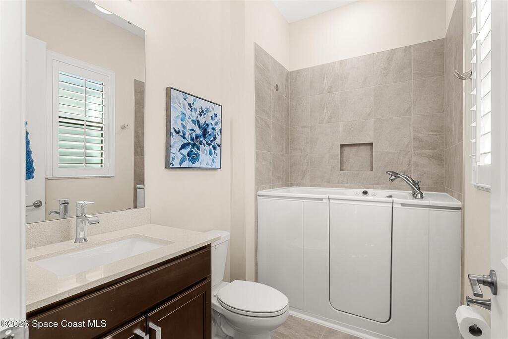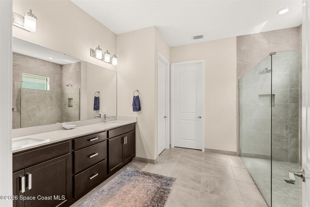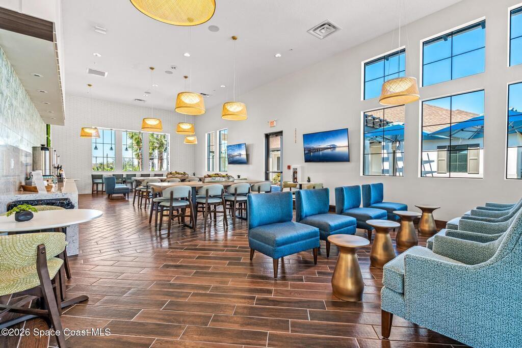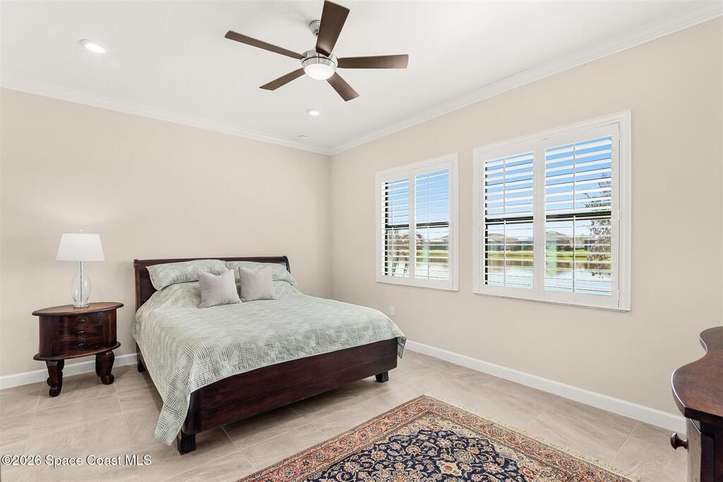 Enjoy waterfront views from this airy 3-bedroom, 4-bath home in the gated 55+ community Bridgewater at Viera. A den/flex room with double doors and closet can easily serve as a fourth bedroom. The kitchen features quartz countertops, stainless steel appliances, and an oversized island that opens to the main living area. Triple sliding glass doors fill the home with natural light and lead to a screened lanai overlooking the water--perfect for enjoying both sunrise and sunset. Interior highlights include ceramic tile flooring, plantation shutters, crown molding, recessed LED lighting, upgraded fixtures, and a laundry room with sink and built-in cabinets. The primary suite offers a custom walk-in closet, zero-entry shower, and dual vanities. Guest bedrooms include custom closets and en-suite baths, one with a walk-in Jacuzzi tub. Resort-style amenities include heated pool, fitness center, tennis, pickleball, bocce, billiards, movie theater. HOA includes lawn care, garbage, gated security.