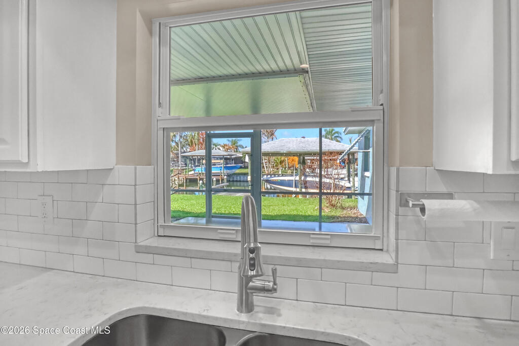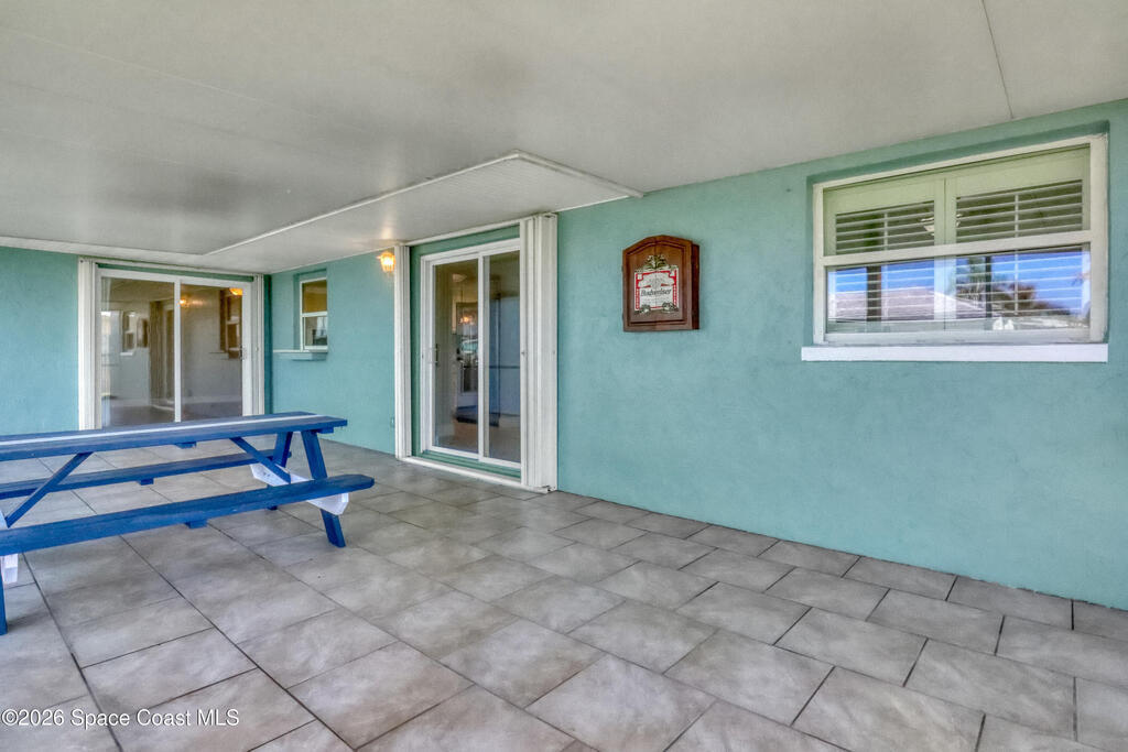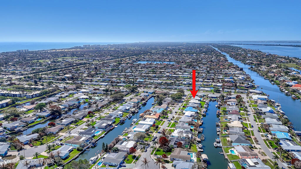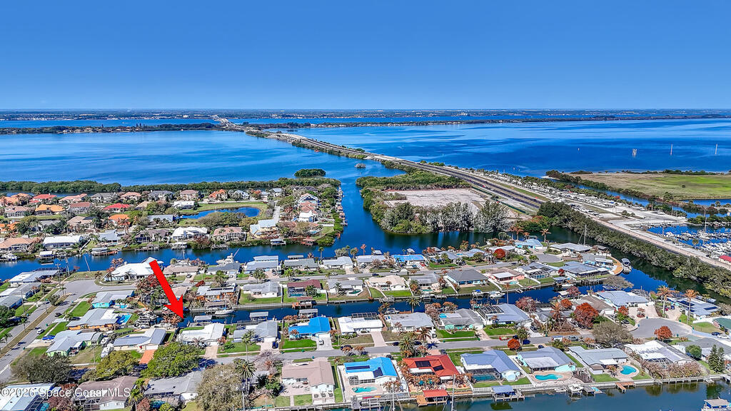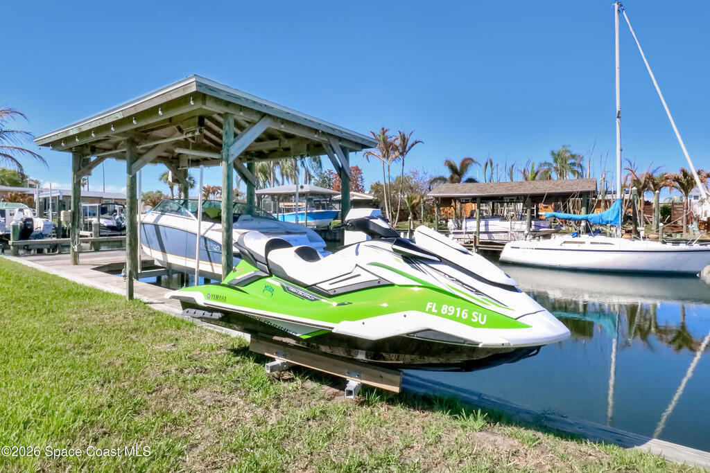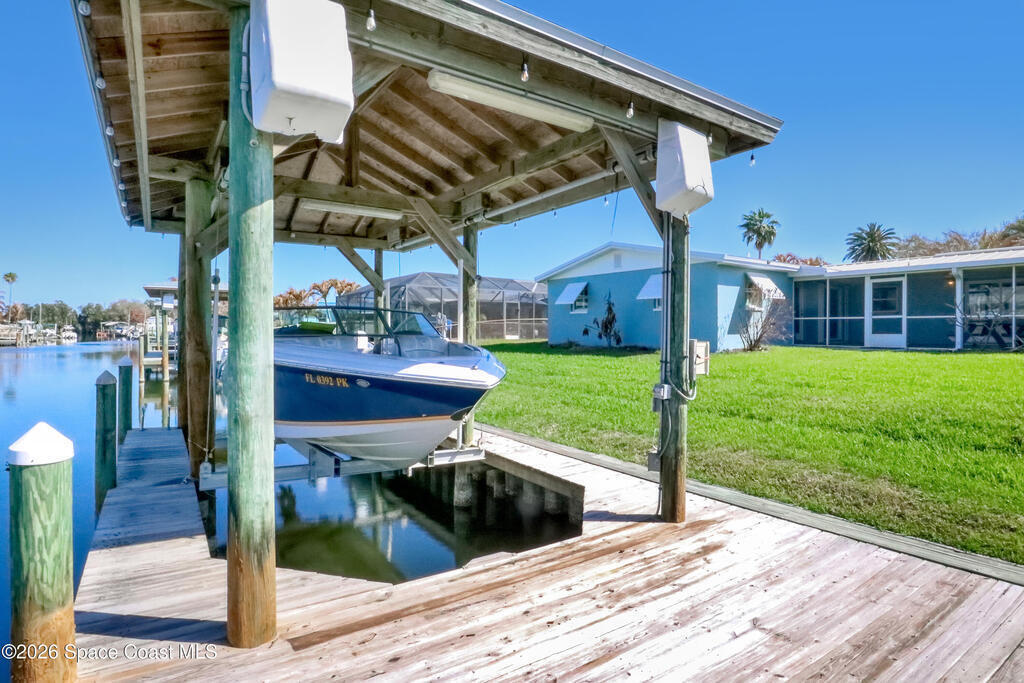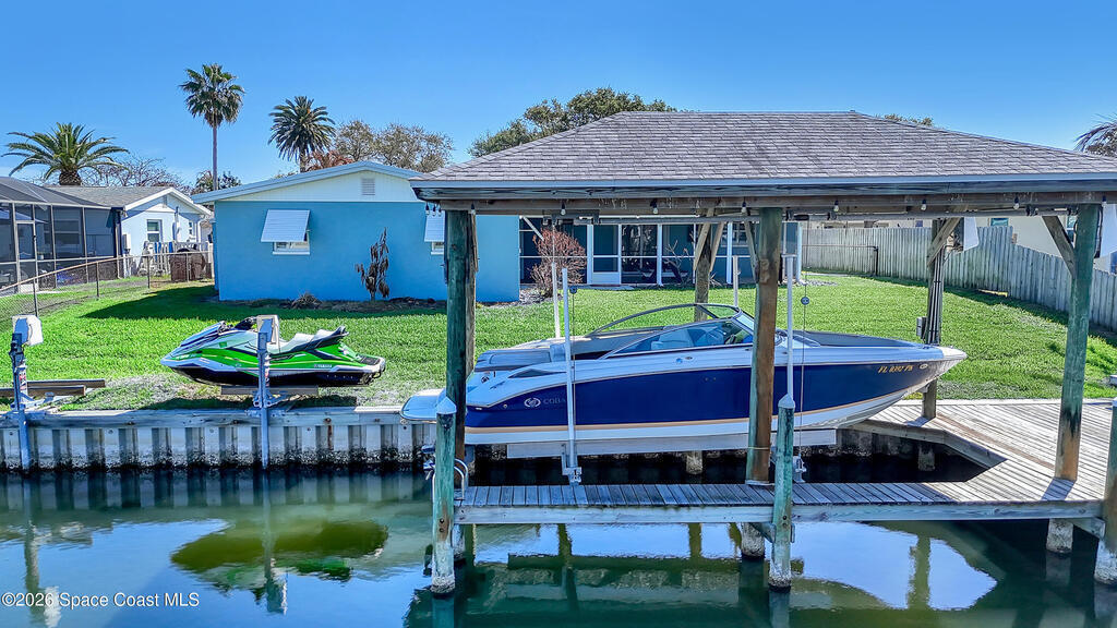 Boater's paradise on a deepwater canal with 85 ft of waterfront, covered dock, expansive sun pad, 80' boat lift, and two powered jet ski lifts. This 4-bed, 2-bath home offers a galley kitchen with stainless appliances, quartz counters, white cabinetry, and subway tile backsplash. Enjoy multiple living areas including formal living/dining, family room/flex space, and a huge, screened porch. Split floor plan with large en-suite primary and three additional bedrooms plus cabana bath with backyard access. Impeccably maintained: plantation shutters, metal roof, hurricane window & door protection, Tesla charger, no carpet, washer/dryer, storage shed, and side-entry garage access door. Canal dredged in 2025. Underground utilities. Minutes to Space Force Base and quick boat access to the Banana River. Outstanding location near the beach and top-rated schools.