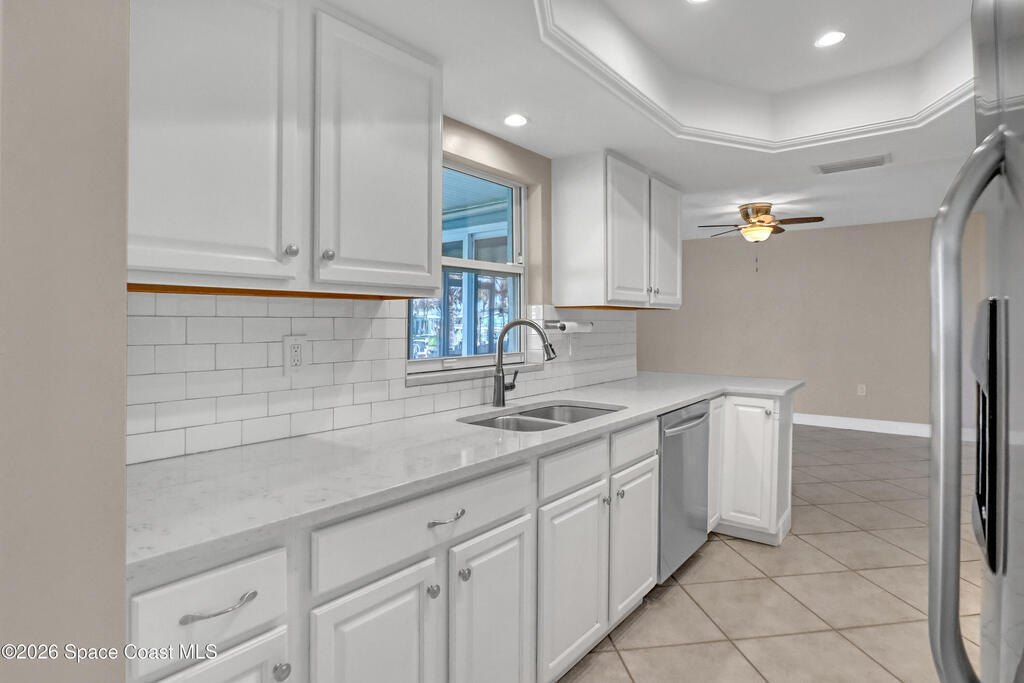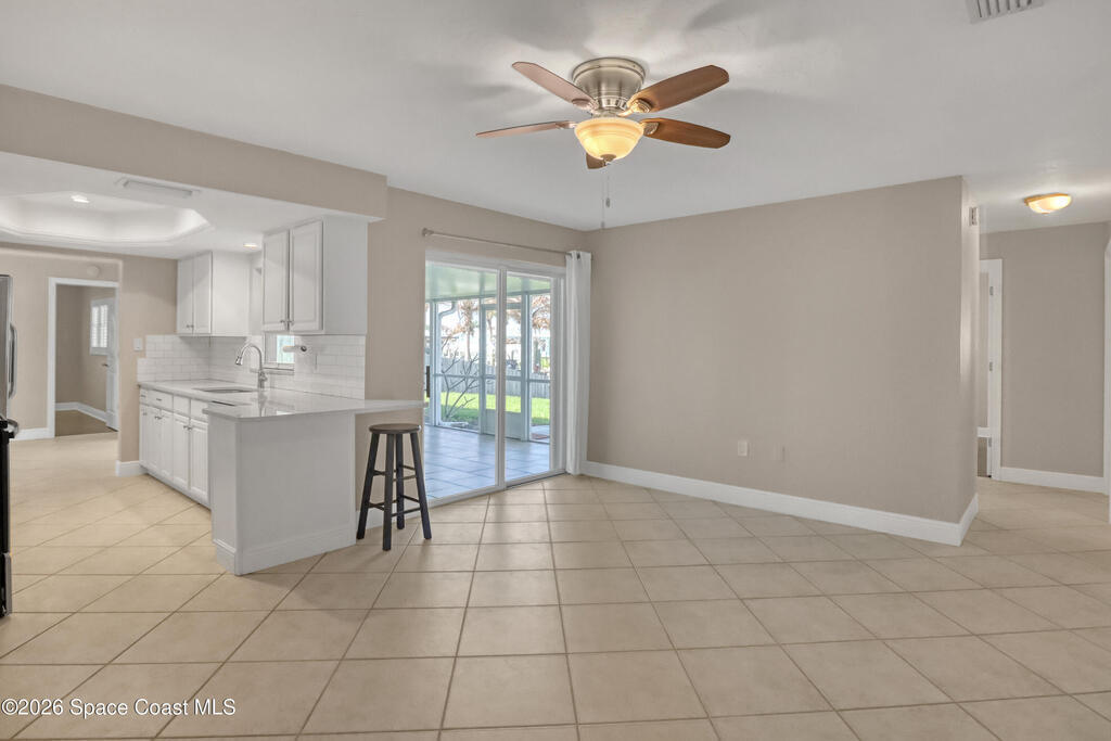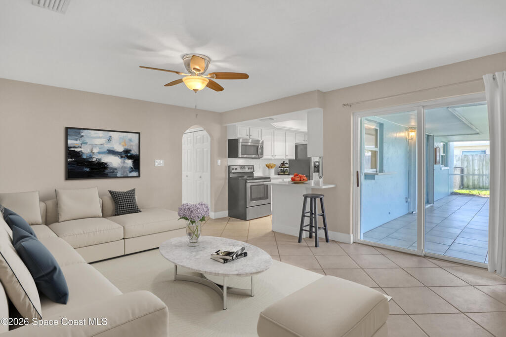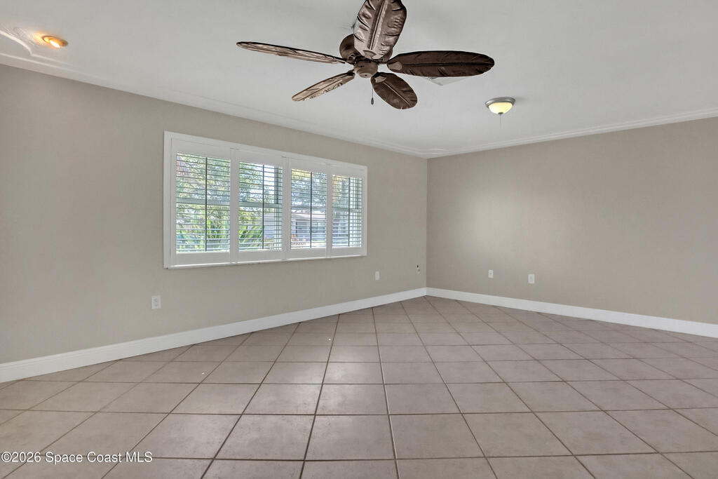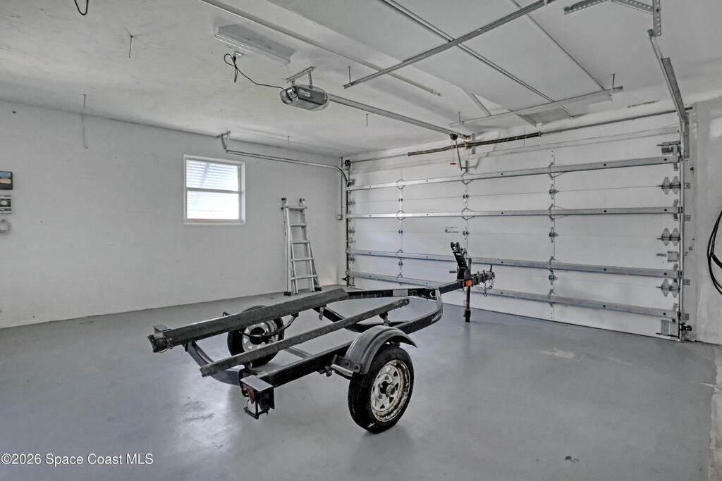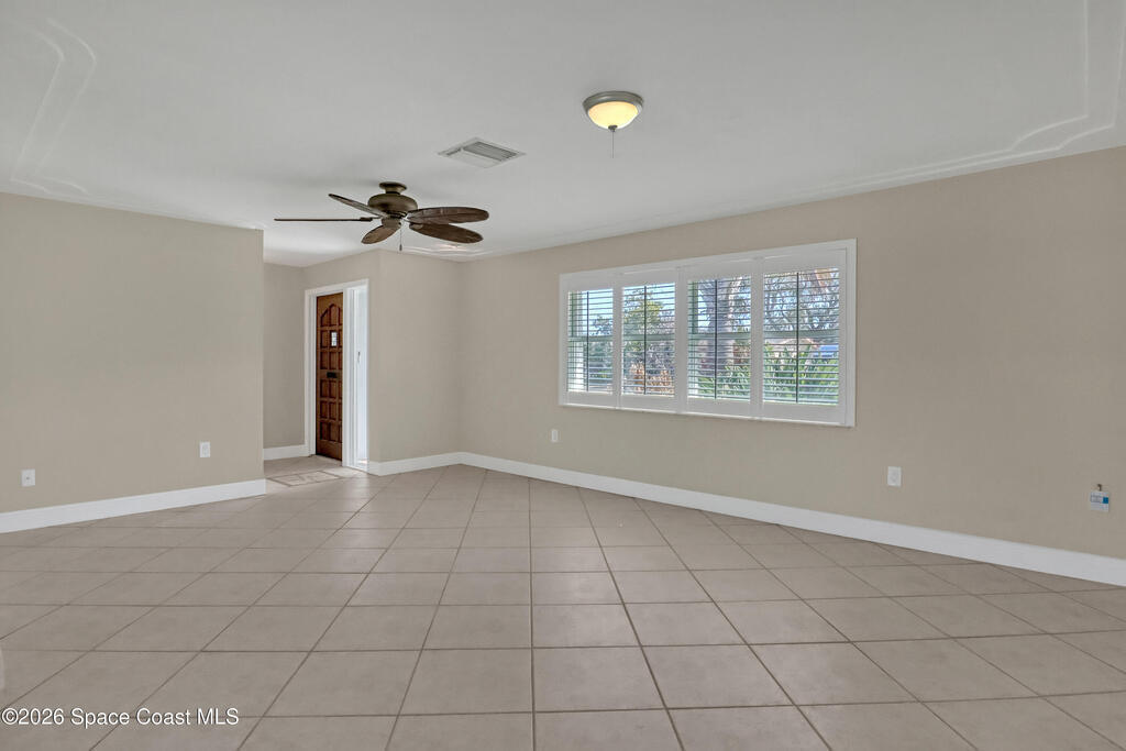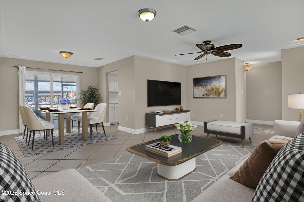 Boater's paradise on a deepwater canal with 85 ft of waterfront, covered dock, expansive sun pad, 80' boat lift, and two powered jet ski lifts. This 4-bed, 2-bath home offers a galley kitchen with stainless appliances, quartz counters, white cabinetry, and subway tile backsplash. Enjoy multiple living areas including formal living/dining, family room/flex space, and a huge, screened porch. Split floor plan with large en-suite primary and three additional bedrooms plus cabana bath with backyard access. Impeccably maintained: plantation shutters, metal roof, hurricane window & door protection, Tesla charger, no carpet, washer/dryer, storage shed, and side-entry garage access door. Canal dredged in 2025. Underground utilities. Minutes to Space Force Base and quick boat access to the Banana River. Outstanding location near the beach and top-rated schools.
