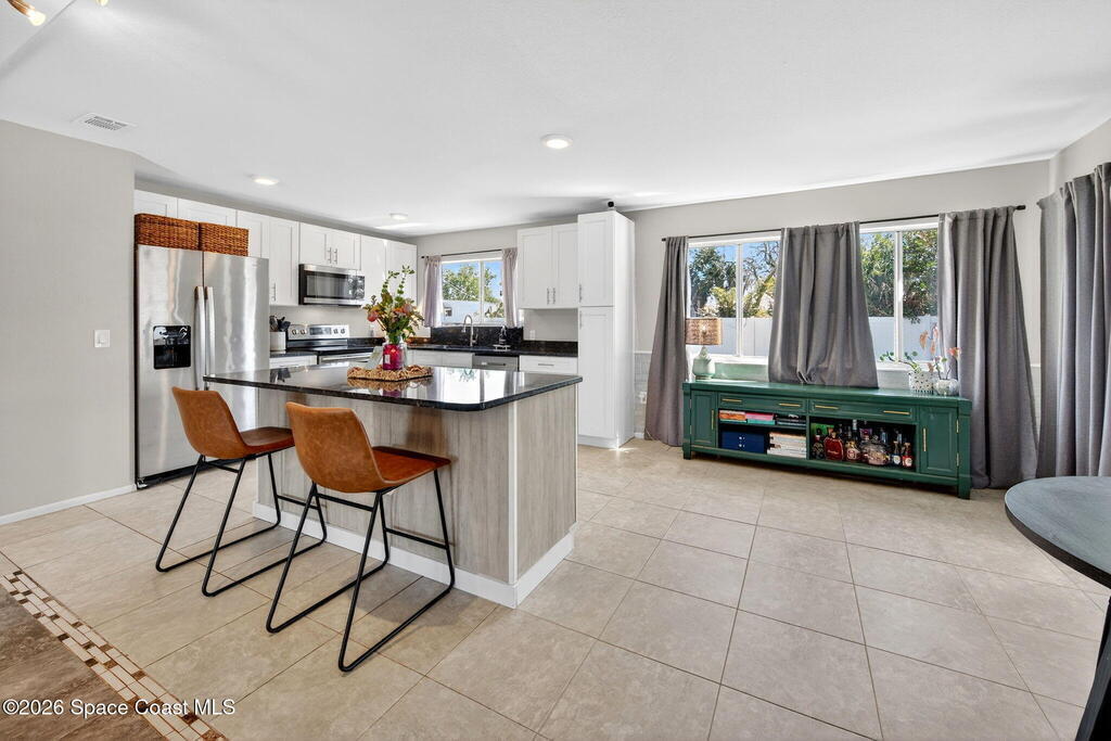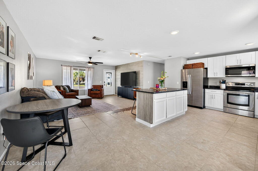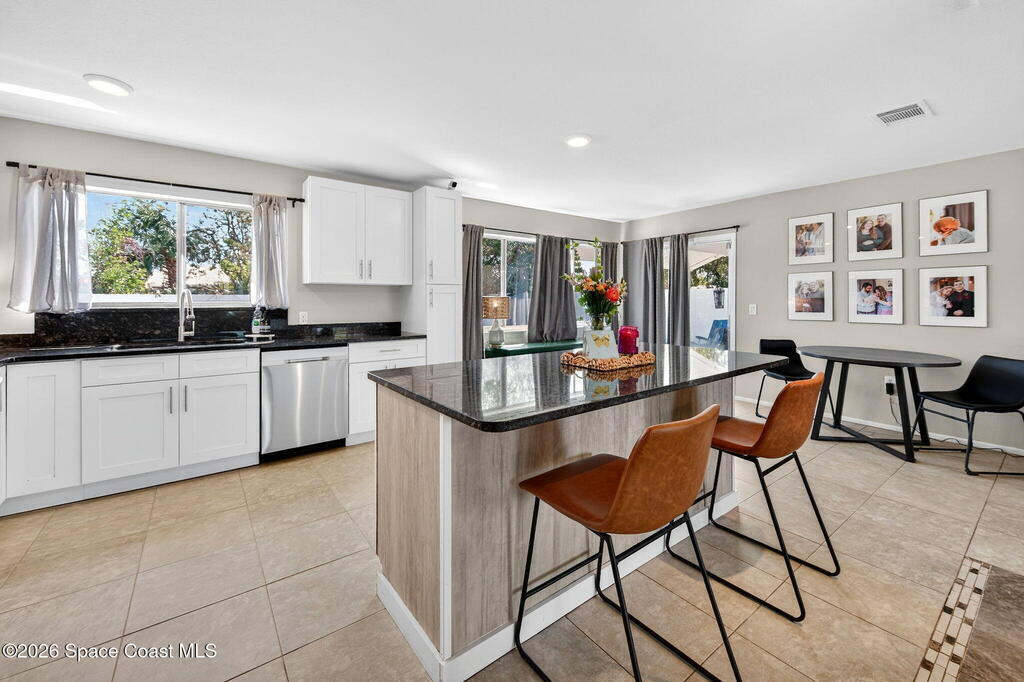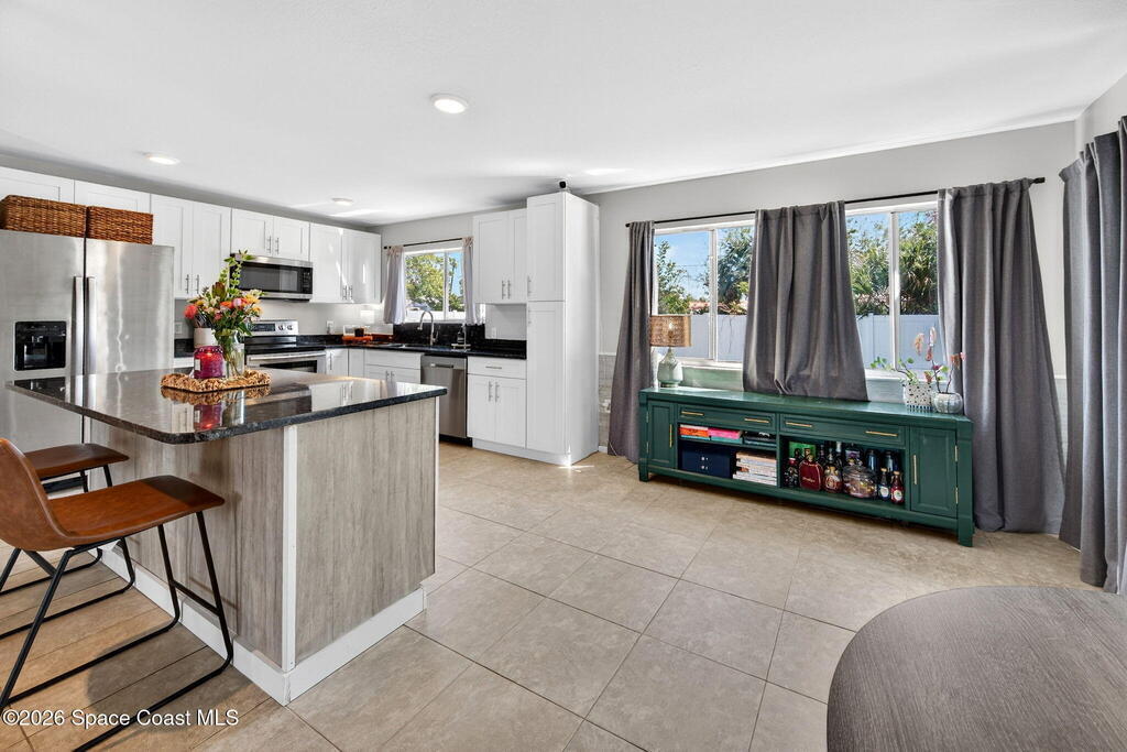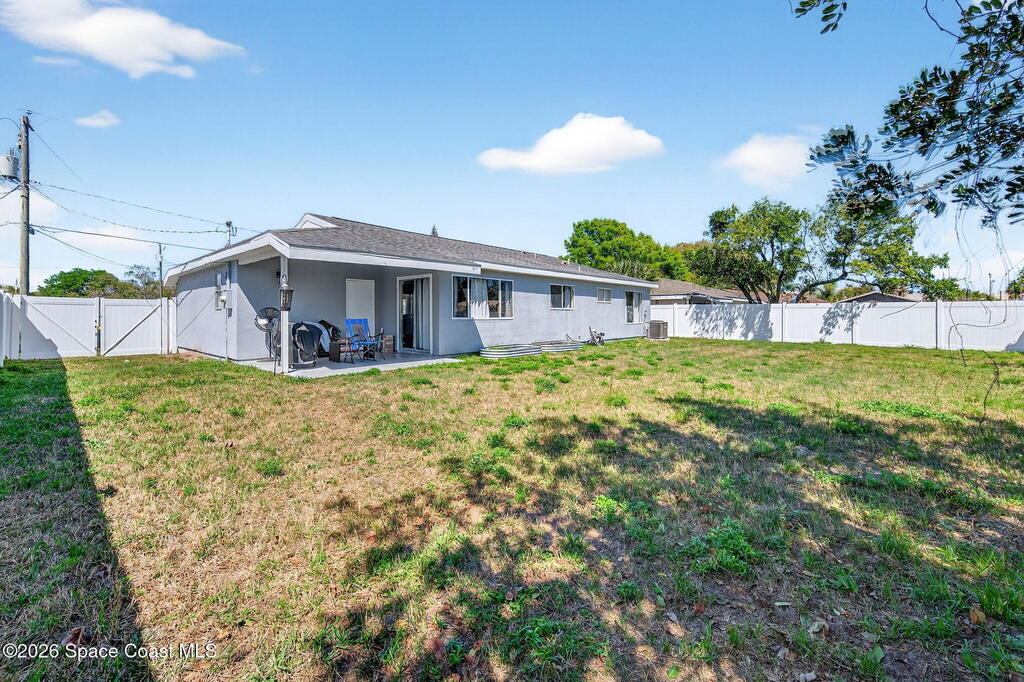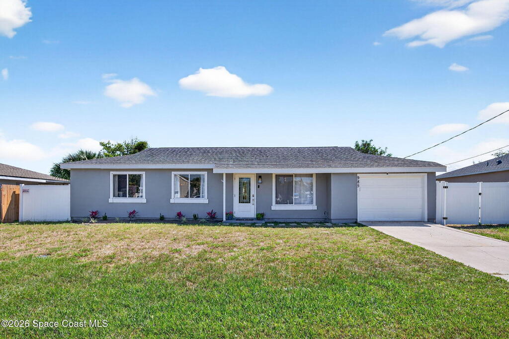 Welcome home to this charming 3 bedroom 2 bath residence located in the heart of the Space Coast! This inviting home offers a NEWER roof (2019), along with a bright and open floor plan designed for comfortable living and easy entertaining! Step inside to find tile flooring throughout the main living areas and durable LVP in the bedrooms, both beautiful and practical. The kitchen features elegant granite countertops, a large center island perfect for gathering, classic white shaker style cabinetry, and sleek stainless steel appliances. Both bathrooms have been updated, adding a modern touch to the home. The open layout allows natural light to flow throughout the living spaces, making it easy to relax. Outside, the fully fenced backyard has clean white vinyl fencing- perfect for pets or weekend BBQ's. The covered back porch is a cozy spot for coffee or to unwind in the evenings. Complete with a 1 car garage and located near everything that makes this home desirable with comfort and style