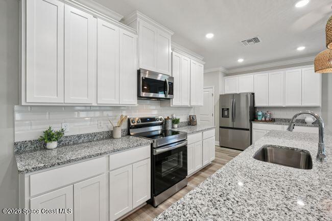 Pre-Construction. To Be Built. Set within the gated community of Malabar Springs, the Drexel floor plan blends thoughtful design with stylish finishes and comfortable everyday living. A stone-accented exterior, paver driveway, and covered front entry create a welcoming first impression, while hurricane shutters and irrigation add everyday practicality.Inside, soaring 9'4'' ceilings and upgraded custom interior paint enhance the open layout. Durable 6x36 plank ceramic tile flooring extends through the main living areas with carpet in the bedrooms, while cordless blinds and upgraded door hardware provide a polished finishing touch throughout the home.The main living space unfolds into a bright and spacious great room featuring additional windows and flush mount LED lighting that fill the home with natural light. The kitchen serves as the heart of the home with granite countertops, Shaker cabinets, stainless steel appliances, a large center island, and a generous pantry.