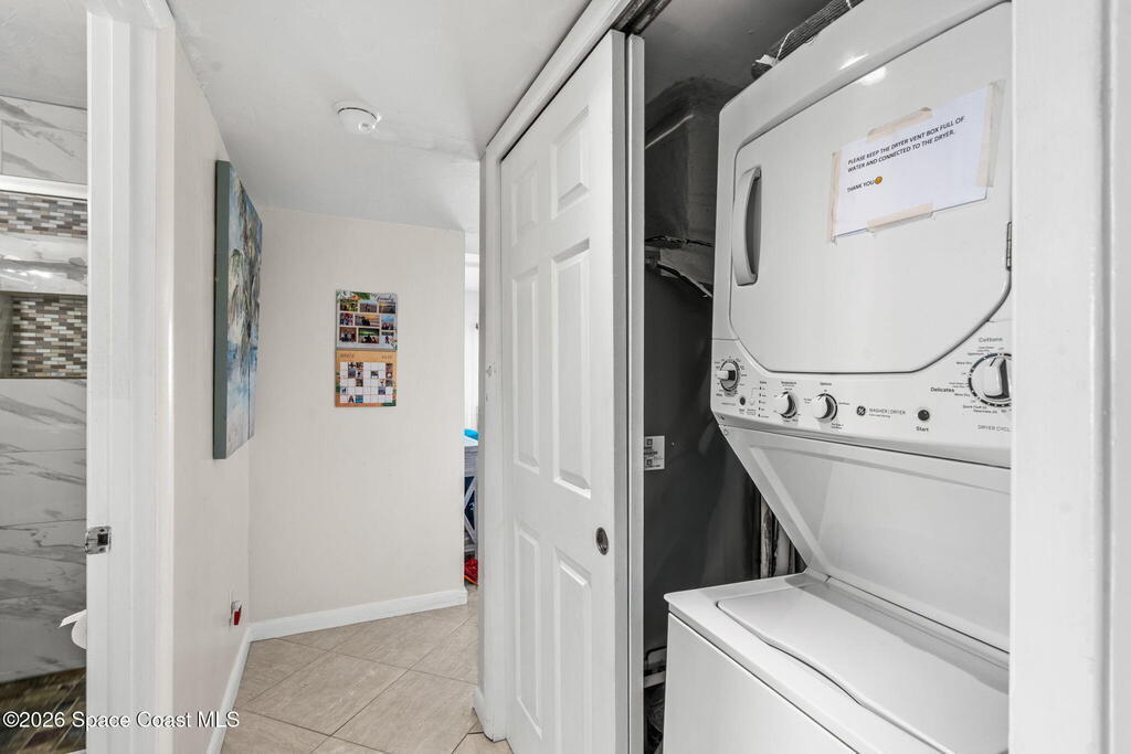 Dishwasher, Electric Range, Microwave, Refrigerator, Washer/Dryer Stacked