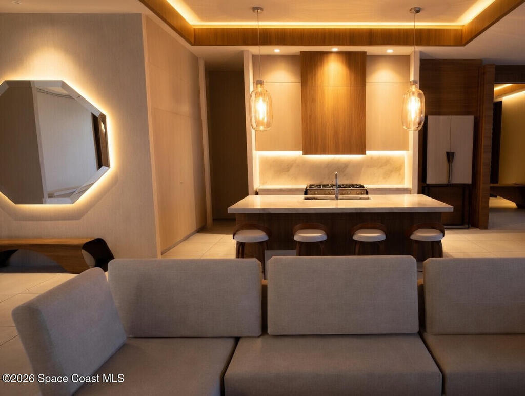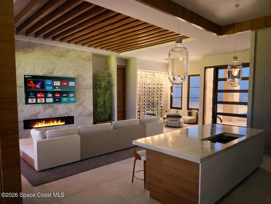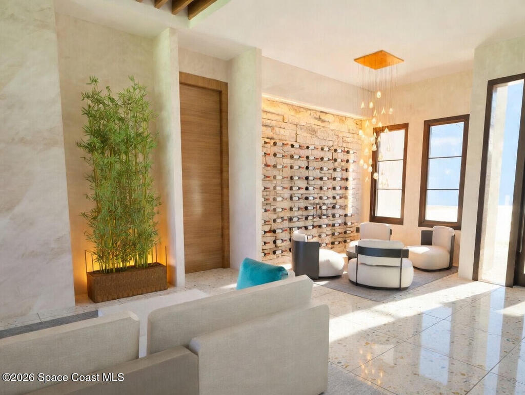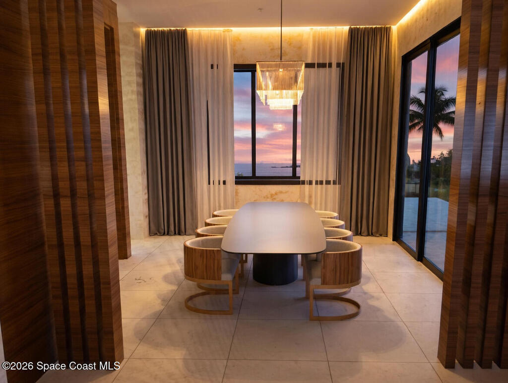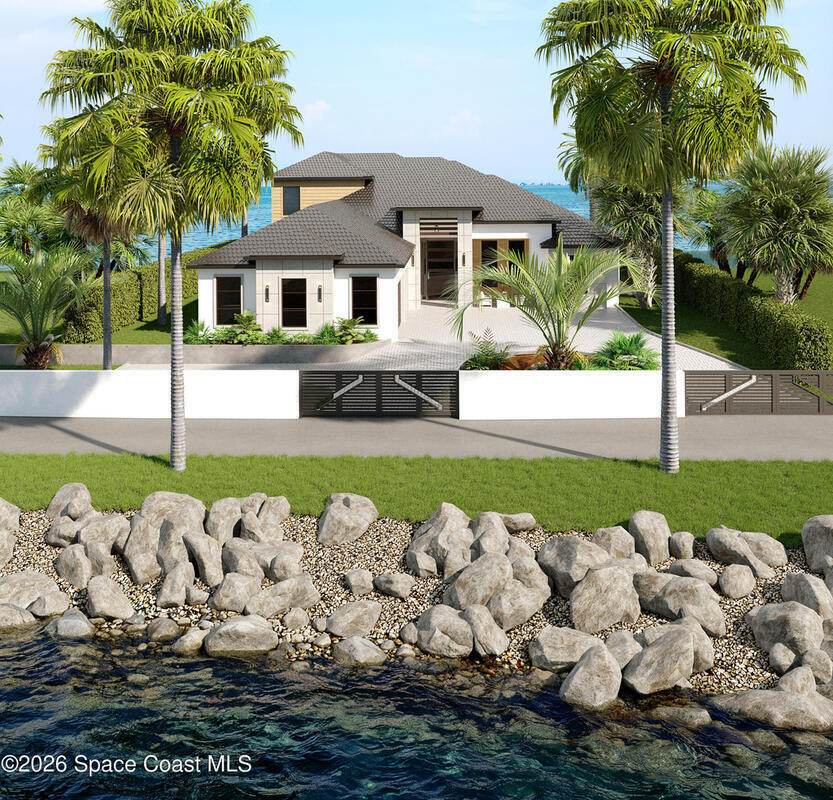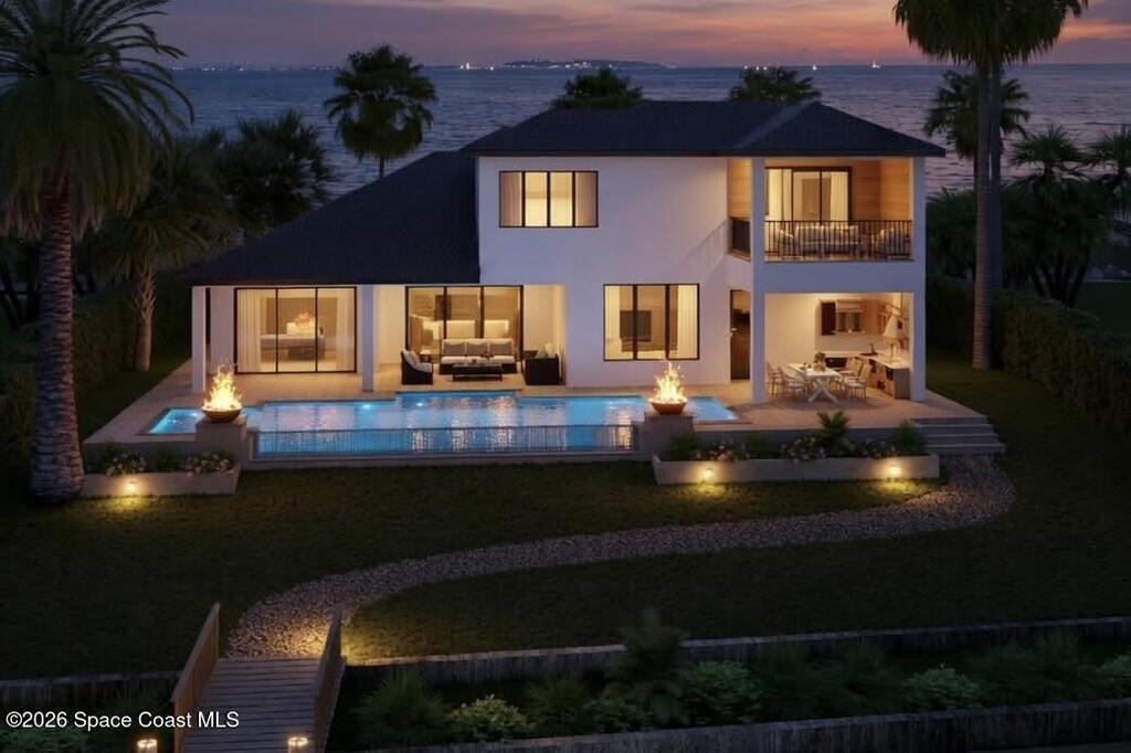 This extraordinary brand-new luxury waterfront estate sits along the exclusive S. Tropical Trail on Florida's Space Coast. This remarkable river-to-river property offers panoramic views of the Indian River from the front and tranquil Banana River vistas from the backyard--creating a rare dual-waterfront setting where you can enjoy breathtaking sunrises and unforgettable sunsets each day. Perched atop a natural Coquina bluff at a 10-foot elevation, the home provides stunning vantage points. A dramatic 10-foot pivot door opens to an expansive open-concept interior featuring soaring coffered ceilings, designer finishes, and walls of impact-rated glass framing the water beyond. The chef's gourmet kitchen w/ Dacor appliances, custom cabinetry, statement island, and hidden walk-in pantry. The expansive first-floor primary suite offers spectacular views and a spa-inspired bath. Resort-style backyard w/ infinity edge pool, spa and outdoor kitchen. Oversized 3 car garage. Under construction now