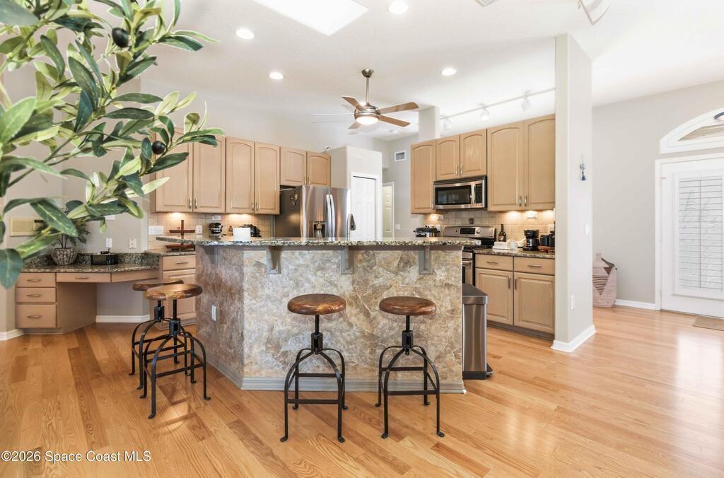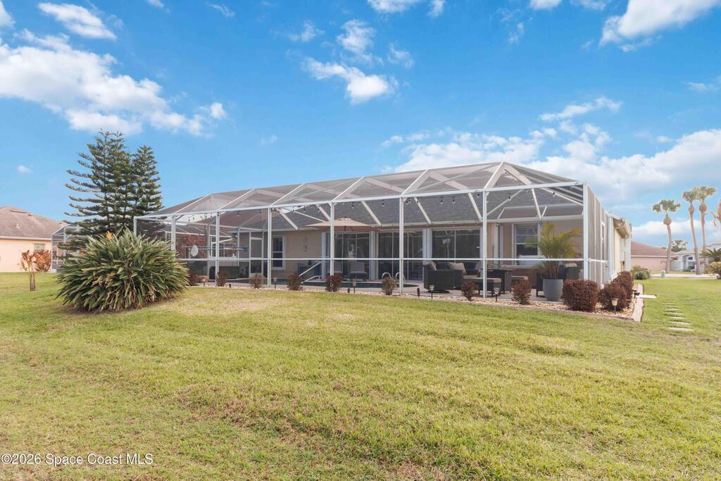 Viera East Golf Course Pool Home! This 4-bedroom, 3-bath, 2, 297 sq ft home sits on the 9th fairway with golf and water views. Enjoy a heated saltwater pool with stone waterfall, screened lanai, above-ground hot tub, and enclosed Florida room with sliding glass doors for year-round comfort. Inside, the open floorplan features tile flooring, high ceilings, fireplace with built-ins, and a chef's kitchen with granite countertops, wood cabinetry, stainless steel all-gas appliances, breakfast bar, and dining nook. The primary suite boasts vaulted ceilings, dual closets, spa-style bath, and patio access. Additional upgrades include a tankless water heater, whole-home generator, split-bedroom layout, central vacuum system, and hurricane-proof windows throughout, including the garage.