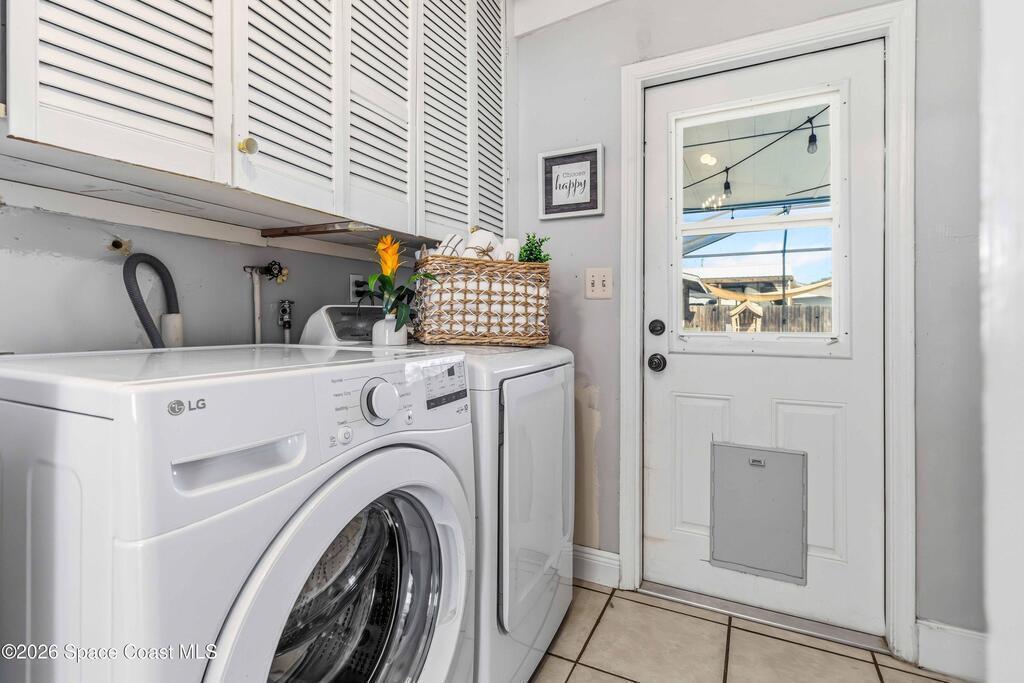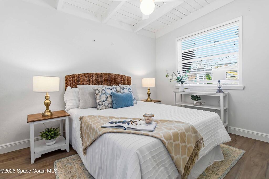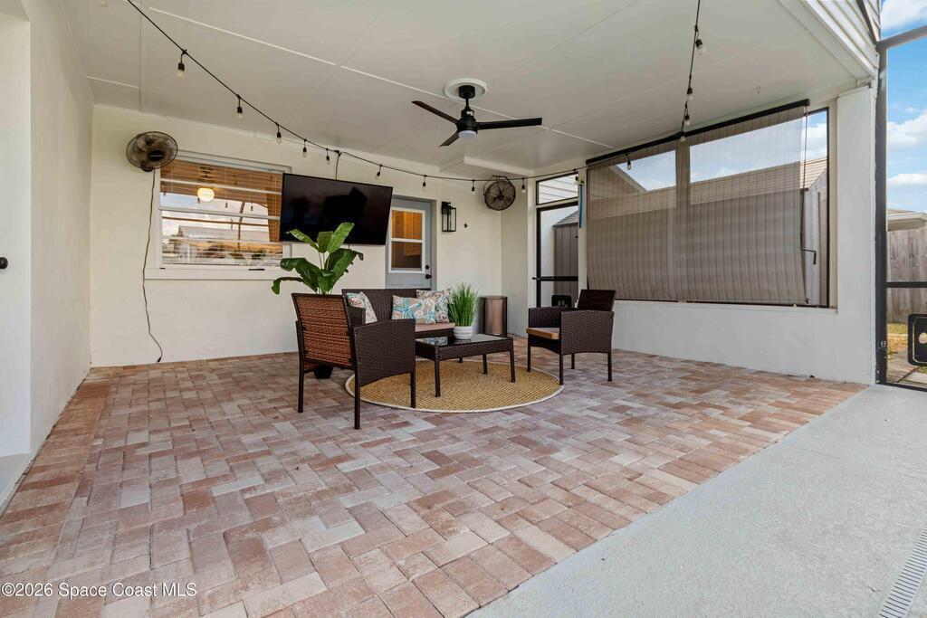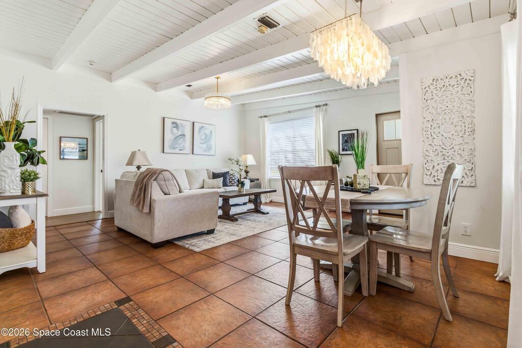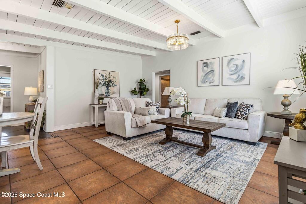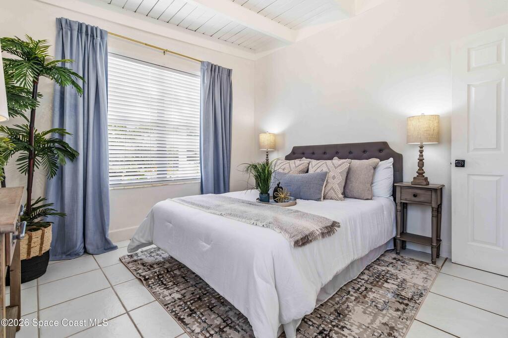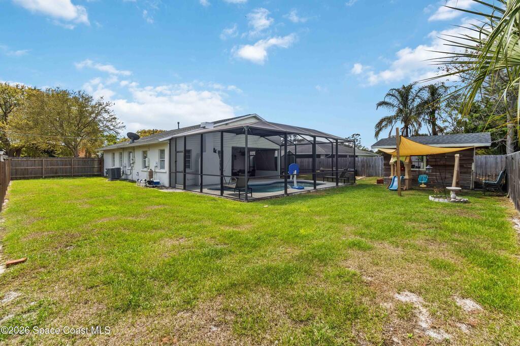 Charming home with historic character & modern updates offering comfort & convenience! This move-in ready 3-bedroom, 2-bath concrete block home provides peace of mind with the major systems already replaced, including the AC (2022/2023), tankless gas water heater (2024), roof (2018), blown-in insulation (2024) & updated electrical and PVC water lines. The owner's suite features a cozy fireplace, access to pool & an ensuite bath w/double sinks, tiled walk-in shower & stand alone spa-style tub. Guest bath is also updated w/tiled walk-in shower. Enjoy entertaining family & friends from your saltwater pool & paver patio, overlooking the fenced backyard w/two sheds, one with electric - ideal for storage or hobbies. Indoor laundry room w/washer & gas dryer that stay with the home. The carport offers ample covered parking. Conveniently located near shopping & dining, just 15 minutes to the beach & Patrick Air Force Base, and 60 minutes to Orlando International Airport & area attractions!