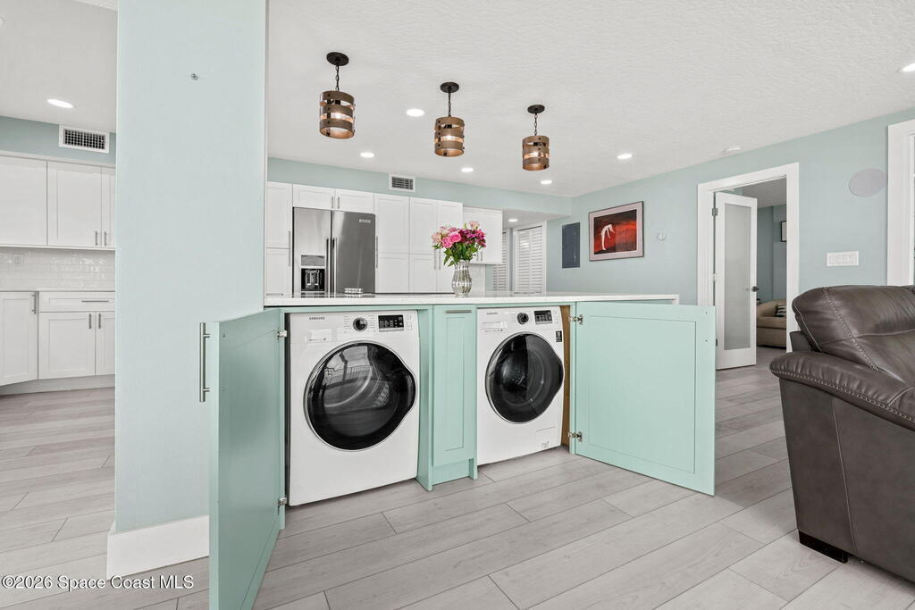 Rare 7th-floor southeast corner direct oceanfront residence offering elevated Atlantic views & miles of unobstructed coastline stretching south toward Sebastian Inlet. The desirable SE exposure fills the home w/ natural light & spectacular sunrises. Renovated from the studs out w/ updated drywall, electrical, plumbing, impact windows & sliders, this condo blends modern coastal design w/ peace of mind. Multiple sliders open to a true wraparound corner balcony capturing ocean breezes & sweeping shoreline views. Open living & dining areas flow into a stylish kitchen w/ stainless appliances, white cabinetry, quartz counters & a waterfall-edge island. Luxury vinyl plank flooring runs throughout. The Villager is a well-managed, pet-friendly oceanfront community offering private beach access, a large pool, secure lobby, garage parking, on-site manager & facilities, & 2 dogs allowed w/ no weight limit. Milestone & SIRS complete w/ over $1M reserves. Walk to Publix, restaurants, gyms & shops.