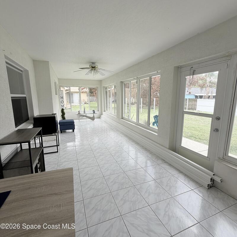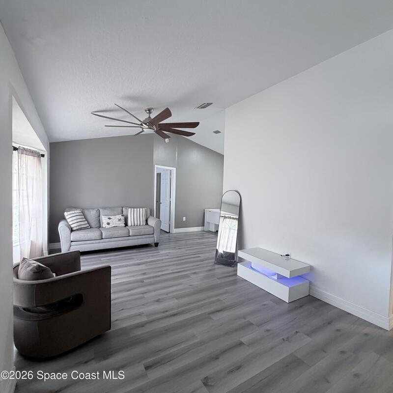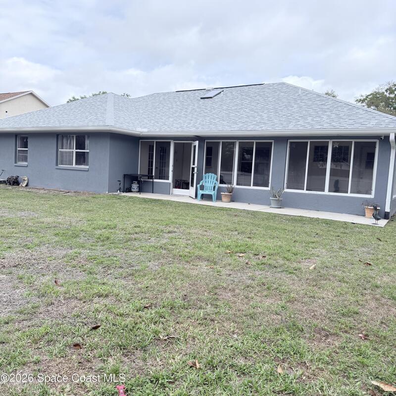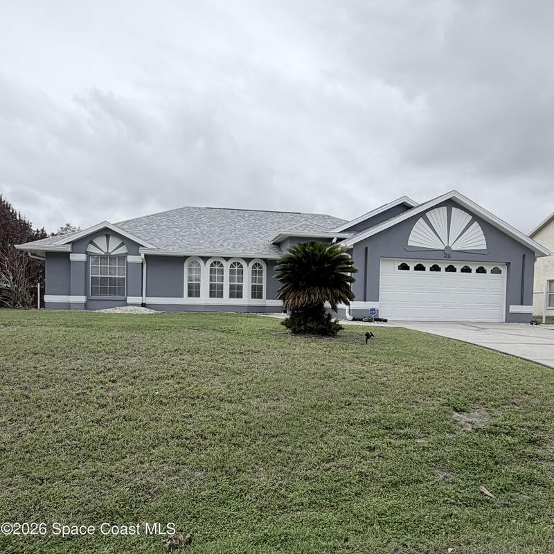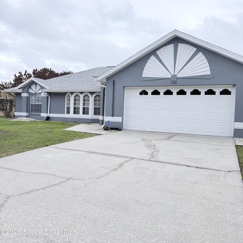 Major updates include a NEW ROOF (2025), NEW A/C (2025), and water heater (2022). Come add your personal touches to this well-maintained 3-bedroom, 2-bath CONCRETE BLOCK home located in a desirable area of NW Palm Bay on CITY WATER. The home features laminate flooring throughout and a spacious master suite with a large ensuite bathroom, jetted tub, and separate shower. Enjoy plenty of parking with a large driveway and 2-car garage. The enclosed sunroom provides additional space for relaxing or entertaining and adds valuable extra square footage. The large backyard offers great space for family activities. Solid bones, very clean, and well maintained--just ready for cosmetic updates to make it your own. Conveniently located close to shopping, dining, and everyday amenities. Schedule your showing today to see the potential this home has to offer!