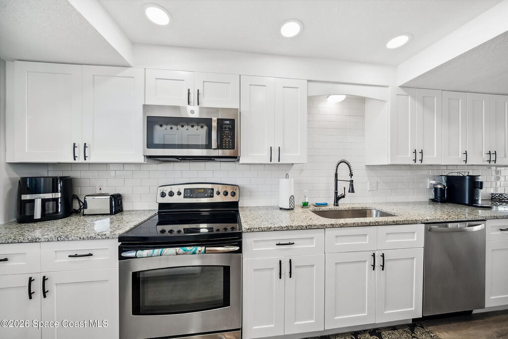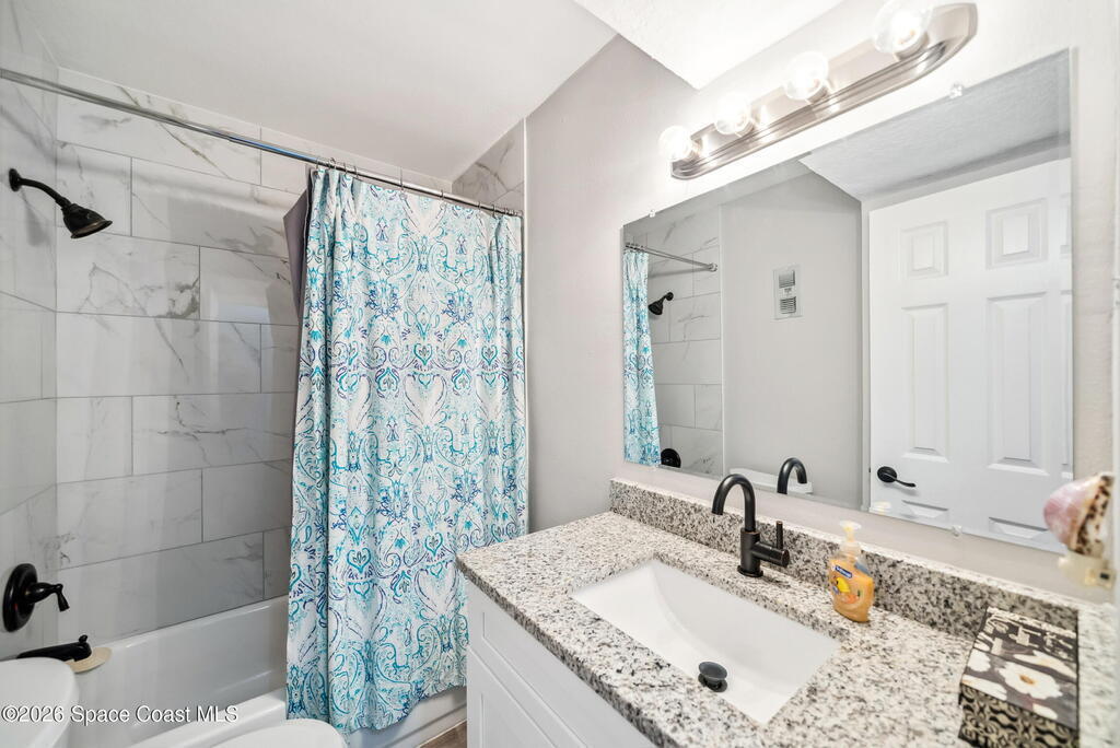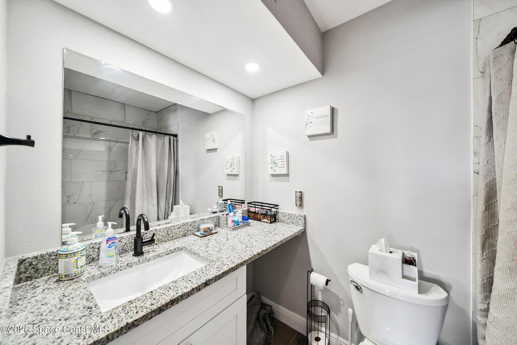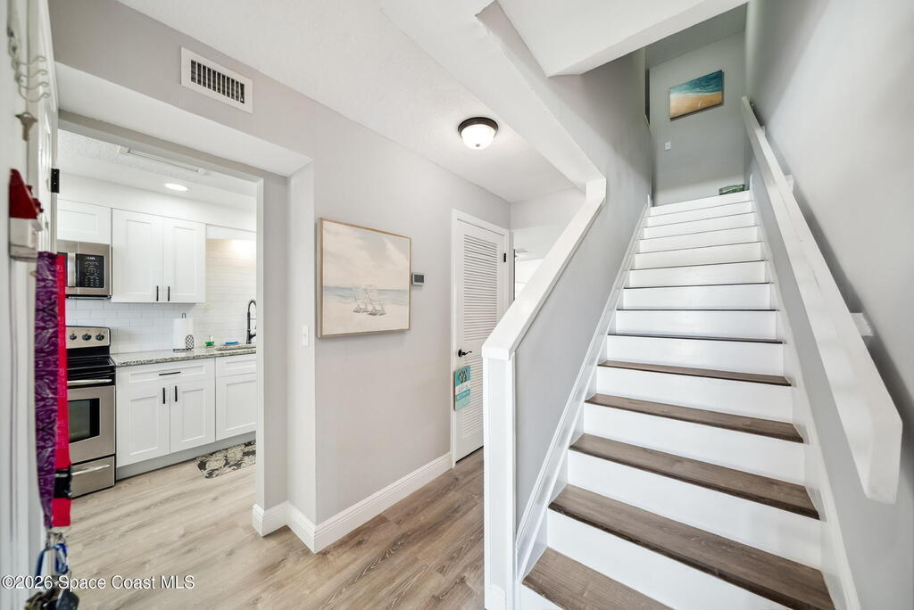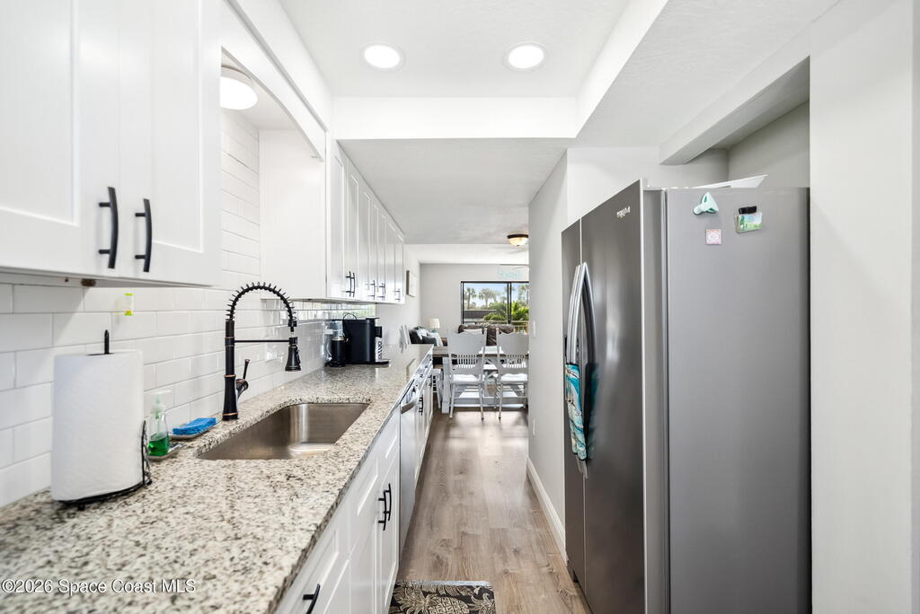 Like brand new, completely remodeled, fully furnished condo located across the street from the beach & Paradise Beach Park. One of the best locations in Brevard. All new kitchen w/white shaker cabinets w/crown molding, quality stainless steel appliances, tiled backsplash, & granite countertops. New luxury vinyl plank flooring throughout. 2 full master suites upstairs plus bathroom downstairs. Nice tile work & granite in all baths as well. Upgraded fixtures & extras throughout. One of the best locations tucked away in the back of the community w/private balcony overlooking the heated pool. Enjoy ocean breezes, rocket launches & gorgeous sunrises. Community amenities include heated pool, clubhouse, sauna, outdoor grill area, tennis & more.