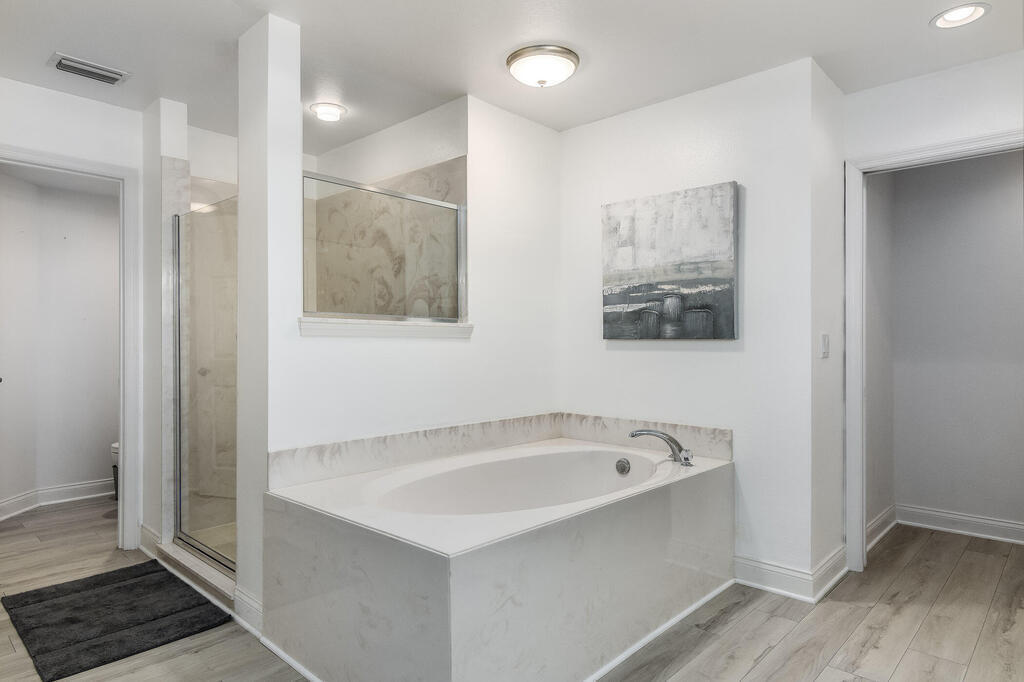 Breakfast Bar, Ceiling Fan(s), Eat-in Kitchen, Entrance Foyer, Guest Suite, His and Hers Closets, Kitchen Island, Open Floorplan, Pantry, Primary Bathroom - Tub with Shower, Primary Bathroom -Tub with Separate Shower, Primary Downstairs, Split Bedrooms, Vaulted Ceiling(s), Walk-In Closet(s)