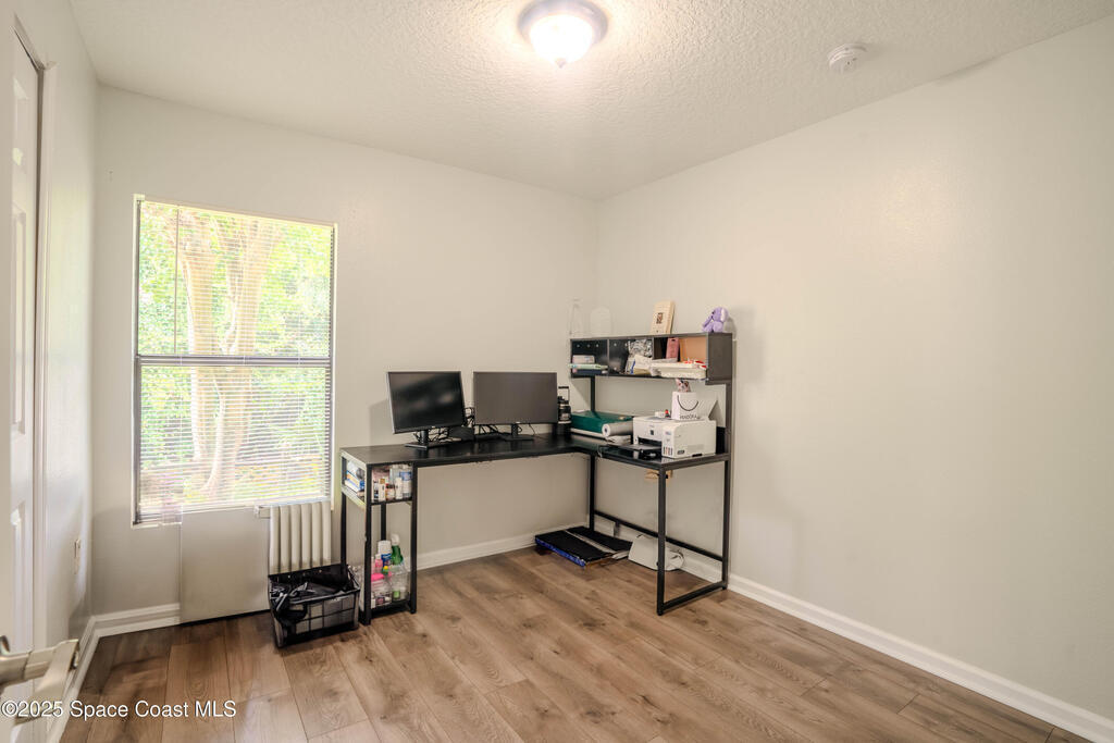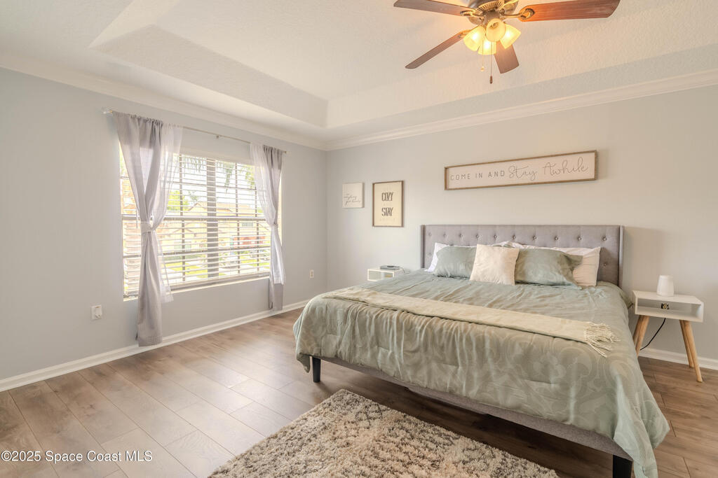 Lovely Two-Story Townhome featuring a living/dining room combo floorplan and is a 3bdrm, 2bath. Nice vinyl plank flooring and tile thru-out. The downstairs has 2bdrms & a full bath, Step-Saver kitchen with architectural archway, breakfast bar, quartz counter tops & a pantry. Upstairs features a huge primary bedroom with double closets and a full bath that encompasses the entire 2nd level. Tray ceilings in the bedrooms are an additional architectural touch. Full glass door leads to quaint backyard that is perfect for your little pets. Inside laundry room - washer & dryer can stay but not warranted. Located in area of quick access to SR405 or Hwy 50. Just minutes to KSC, Orlando and other main areas of travel.
