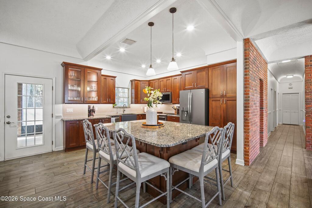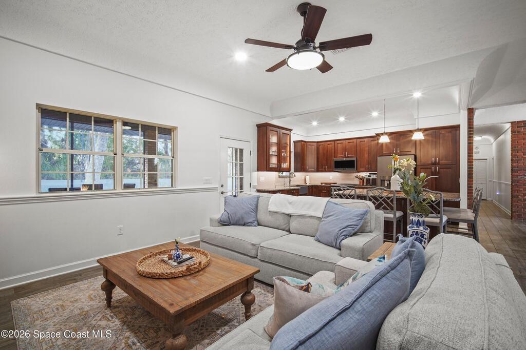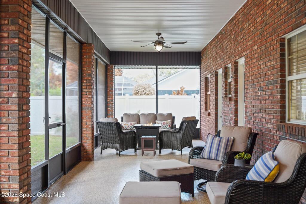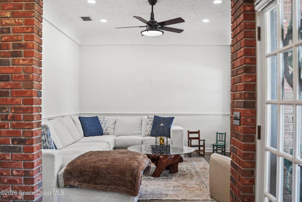Some homes just have a warmth to them the moment you walk in, and this is one of them. Located in the gated Ashley Manor community in West Melbourne, this 4-bed, 2-bath home offers over 2, 400 sq ft with a layout designed for both everyday living and gathering with family and friends. Multiple living spaces create flexibility, while the split floor plan offers privacy for the primary suite. Warm brick accents, higher ceilings, and warm modern touches throughout give the home a unique character that feels comfortable and inviting. A massive screened patio stretching over 60 feet across the back creates an awesome environment for relaxing and entertaining while enjoying the added privacy of the grove property behind the home. The property also features a circular driveway and paved side yard ideal for RV, boat, or extra vehicle parking. Roof 2023. Reverse osmosis system. Storm-rated garage door. Ashley Manor offers tennis, pickleball, basketball, a gazebo, and a play area.