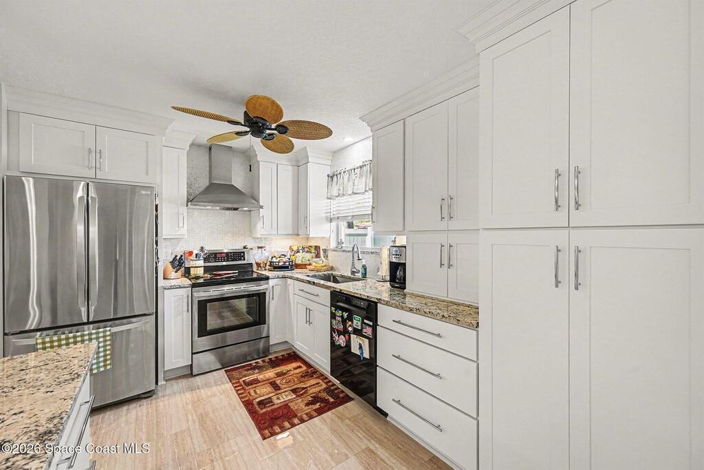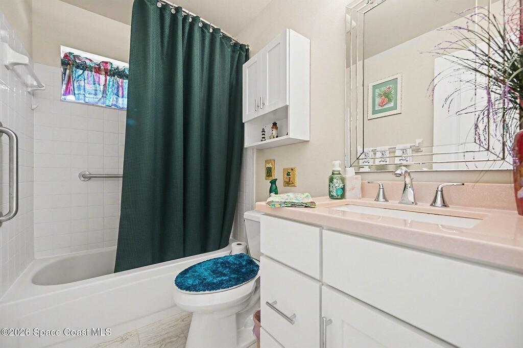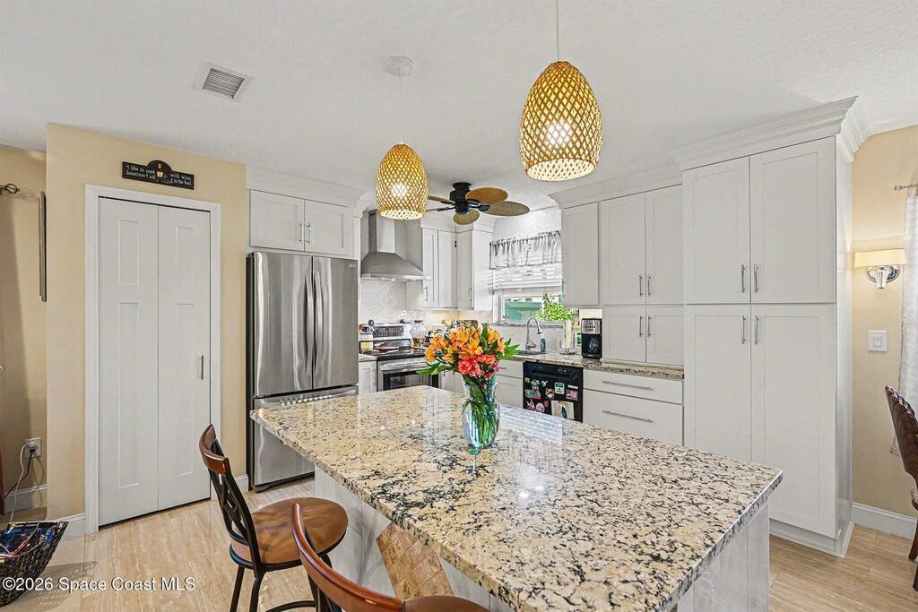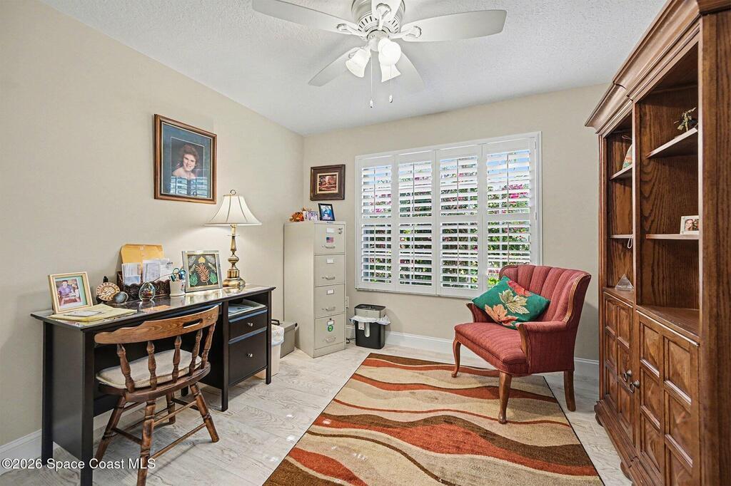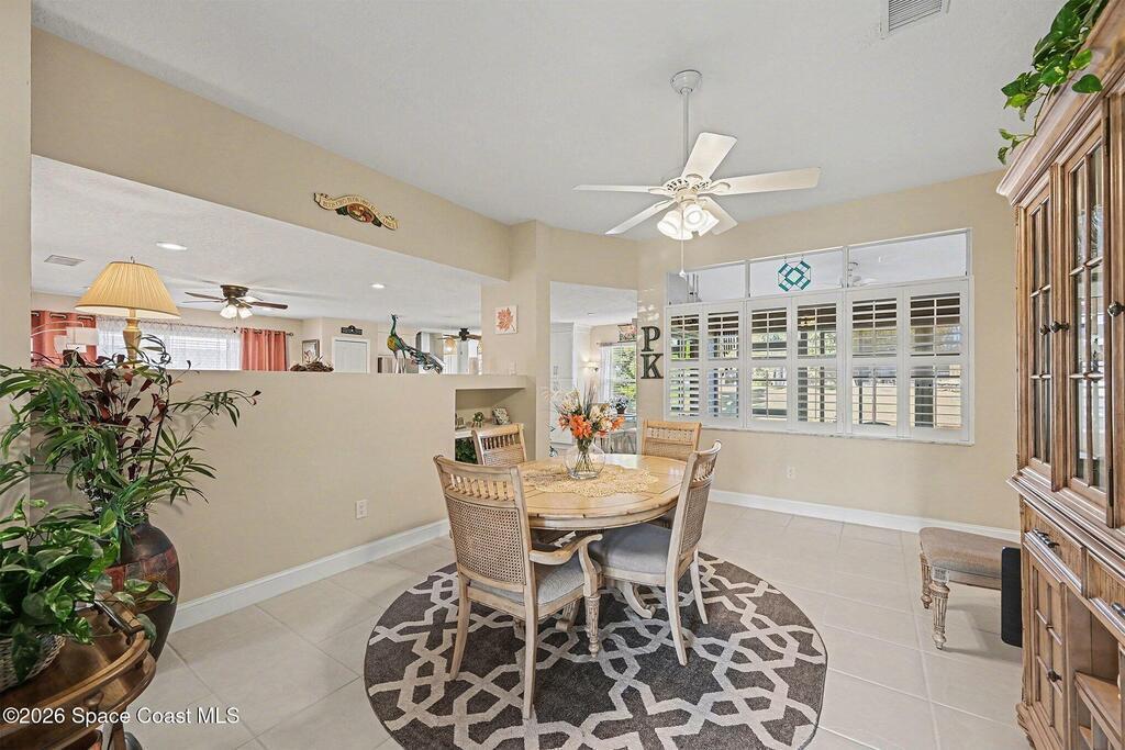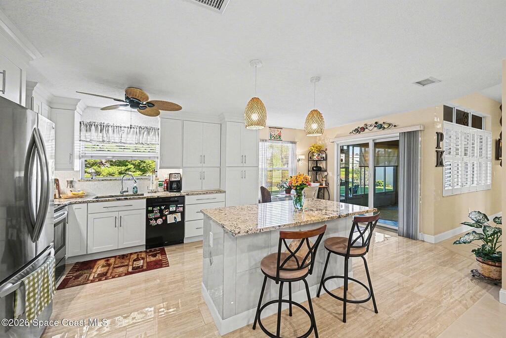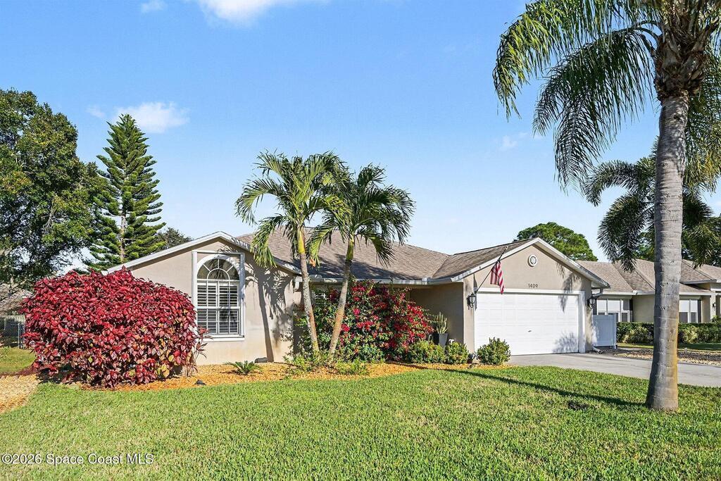 Enjoy peaceful water view at 1409 California Drive in the desirable Hidden Springs community of Suntree. This beautiful 3-bedroom, 2-bathroom home offers a split floor plan, a 2-car garage, and an indoor laundry room. The stunning kitchen features LG appliances, granite countertops, soft-close drawers, and sliders leading to the enclosed rear porch, which is finished with plexiglass & a brick paver patio. Master bedrm includes a walk-in closet, porch access, and a bathroom with a walk-in shower. LG washer and dryer convey. Major upgrades include a June 2025 Trane AC with brand-new ductwork 2022, a 2025 garage door opener, and a 2019 roof. Additional features include accordion shutters on most windows, plantation shutters, ceiling fans throughout, rain gutters, and an insulated garage door and built-in storage cabinets. Community offers excellent amenities, including two community pools, a playground, tennis court, shuffleboard court, and basketball hoop. Schedule your showing today!
