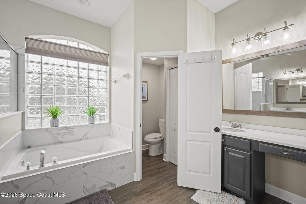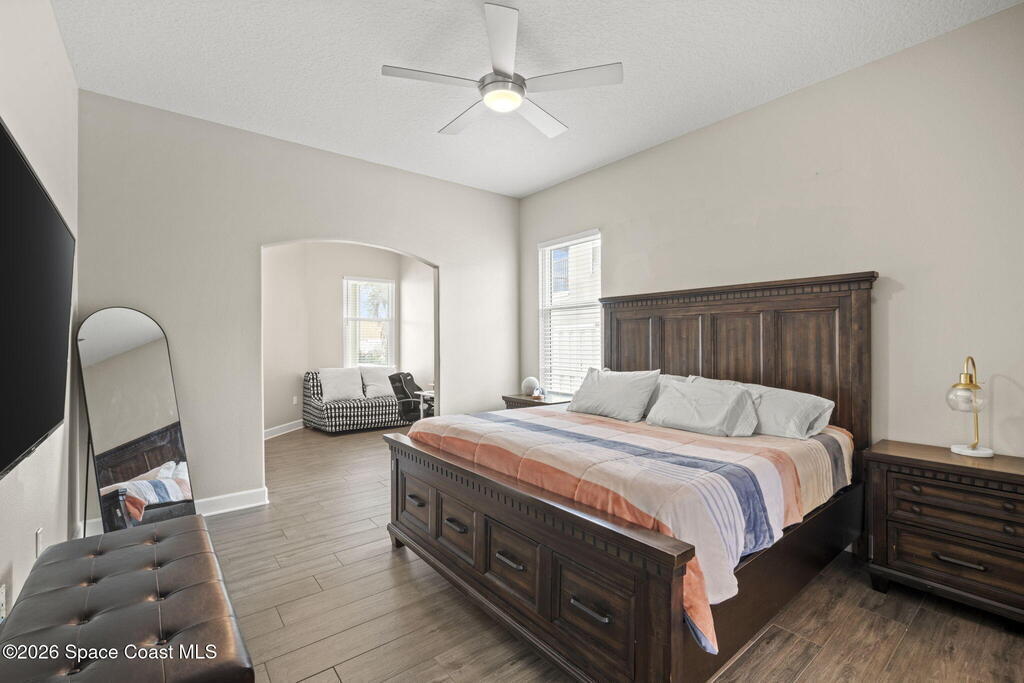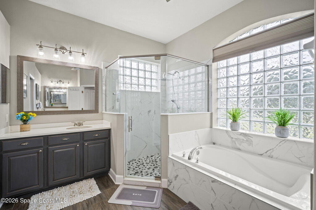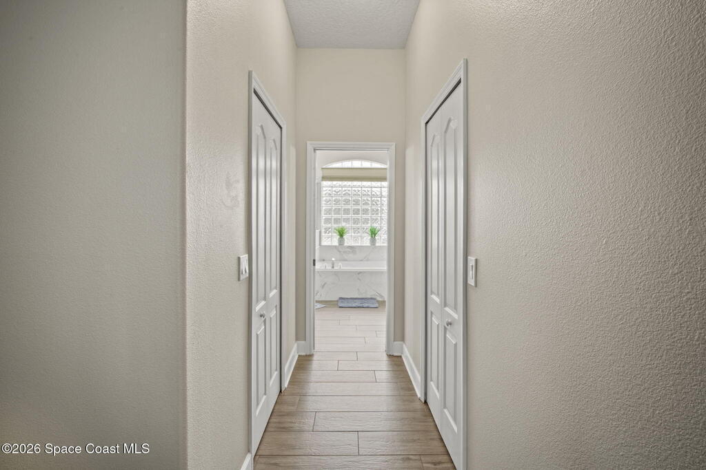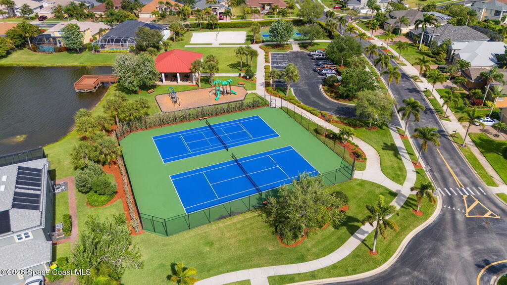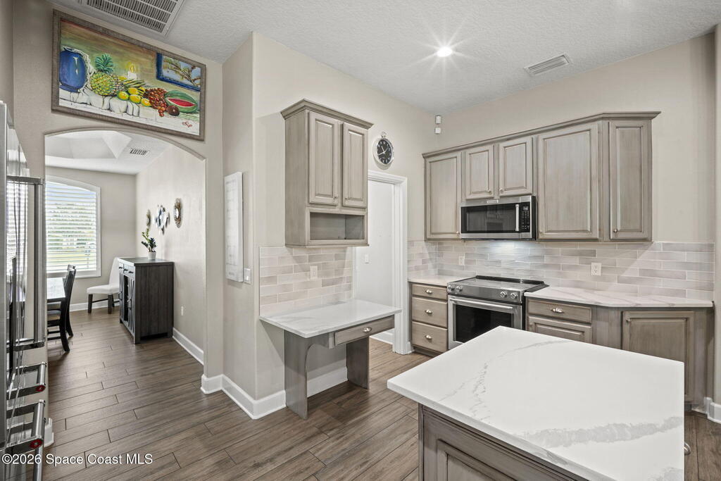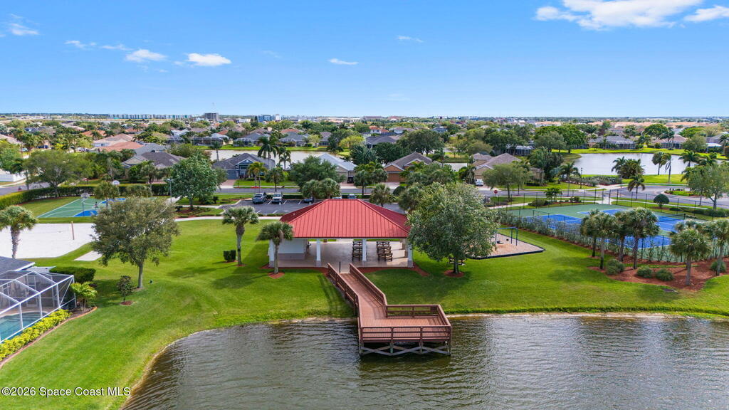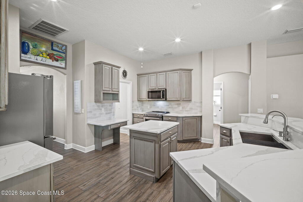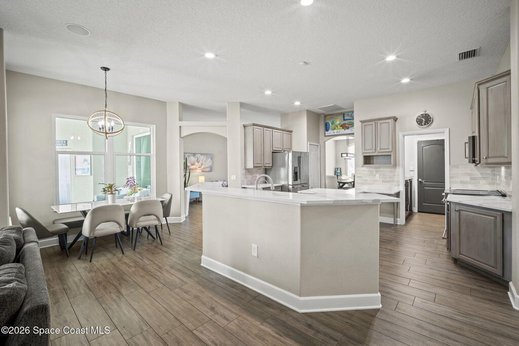 Welcome to this exceptional residence in the highly sought after gated Sonoma Subdivision in Viera, featuring a fully fenced backyard with green space and a resort style pool and spa, perfect for relaxing or entertaining. This meticulously maintained 4 bedroom, 3 bath pool home offers timeless design with modern upgrades throughout.Expansive living areas showcase large format porcelain plank tile flooring and abundant natural light from energy efficient windows. Plantation shutters and designer lighting, including statement chandeliers, add a sophisticated touch.The gourmet kitchen is beautifully appointed with white and gray marble inspired quartz countertops, premium KitchenAid stainless steel appliances, and 42 inch custom cabinetry. A kitchen sink water filtration system adds everyday convenience. The breakfast bar and eat in nook overlook the pool, creating a seamless indoor outdoor living experience.Modern enhancements include a smart thermostat with Alexa compatibility, an