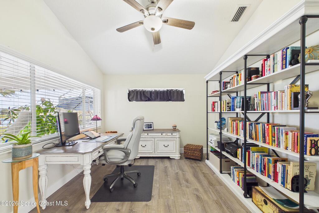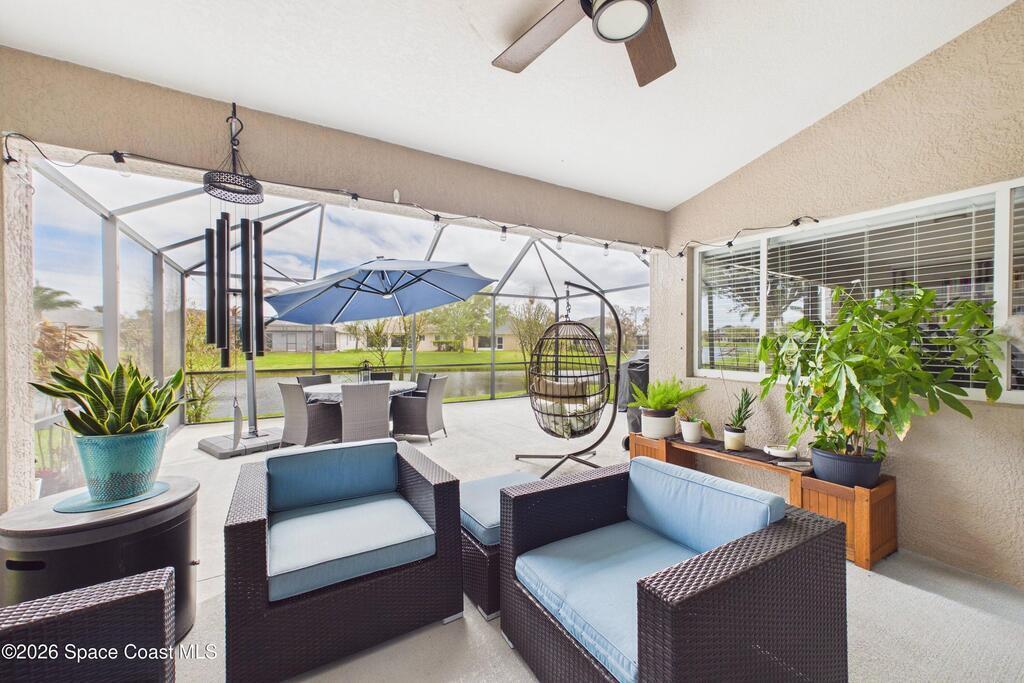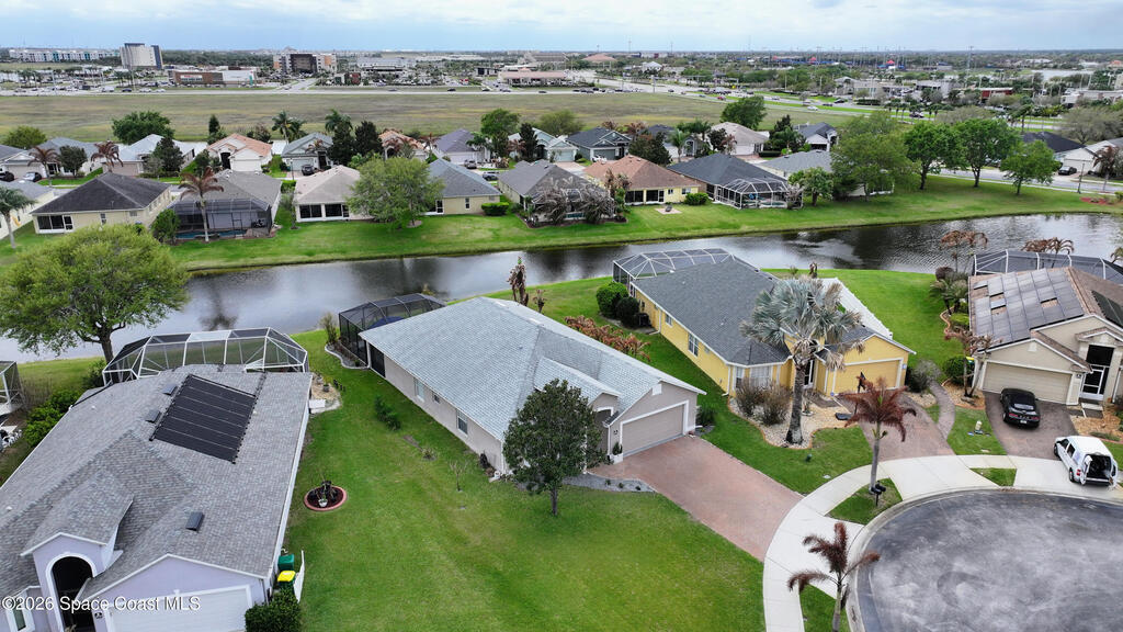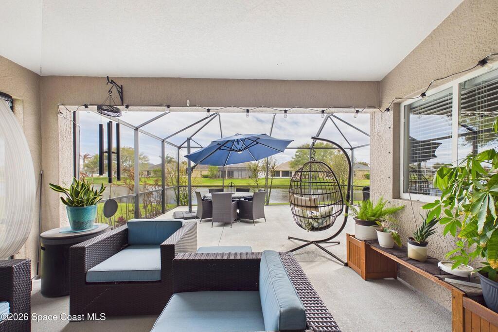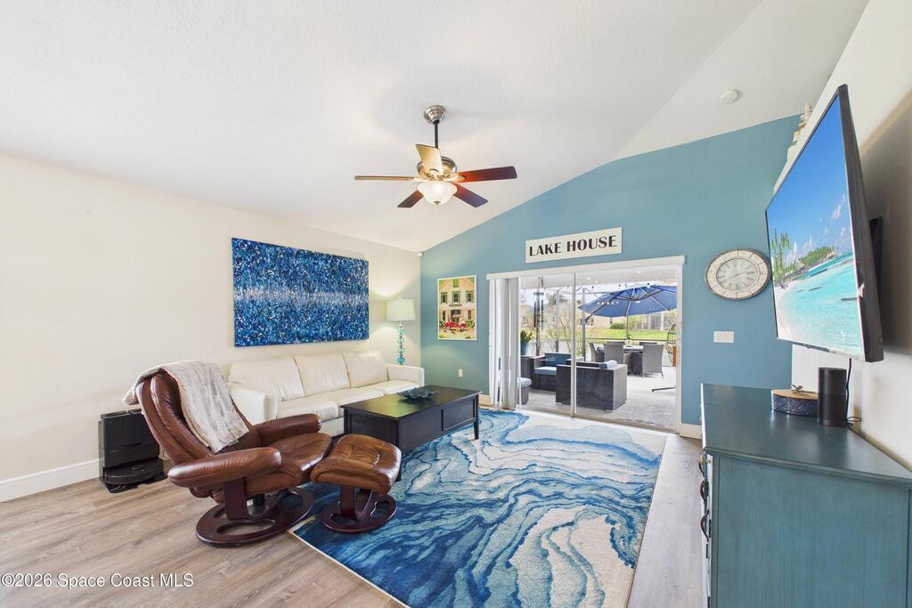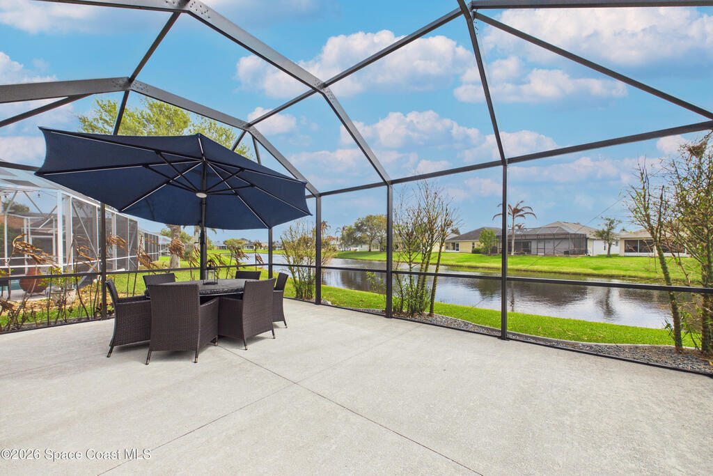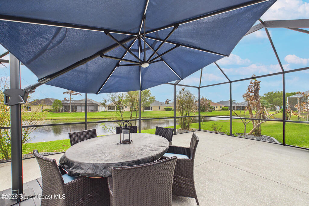 Everything Like new in gated Sonoma at Viera! Move right in. This home sits on a Premium Waterfront lot with privacy landscaping and a new larger 18'x26' screened lanai w/ pet-grade screening. 3 bedrooms plus a Sitting Room/Office, Huge walk-in Primary Closet, Primary Bath has jetted tub, double sinks, and linen closet. Major updates include new roof, water heater (2020), Trane AC (2023), LifeProof LVP floors, Gorgeous Quartz countertops, LG appliances with Double Oven!! A craft ice fridge, coffee/beverage bar with Fridge, 5'' wood baseboards, fans, lighting, all within the last 3 years. New sprinkler pump & control, drip irrigation, curbing, Aluminum Hurricane shutters included. A+ Viera schools. Bus stop, Publix, shops and restaurants right outside the gate. Bike the golf cart trails to the Avenue Viera Shops and restaurants in minutes. Community offers tennis, pickleball, basketball, playground, picnic area, and fishing dock. Orlando airport 45 minutes away