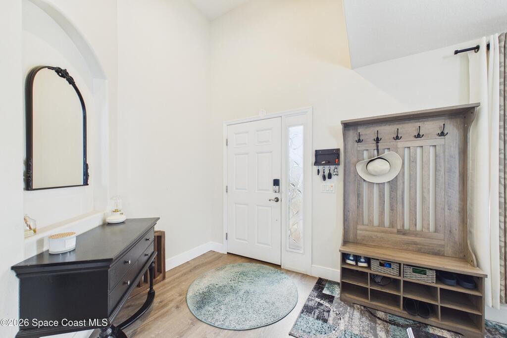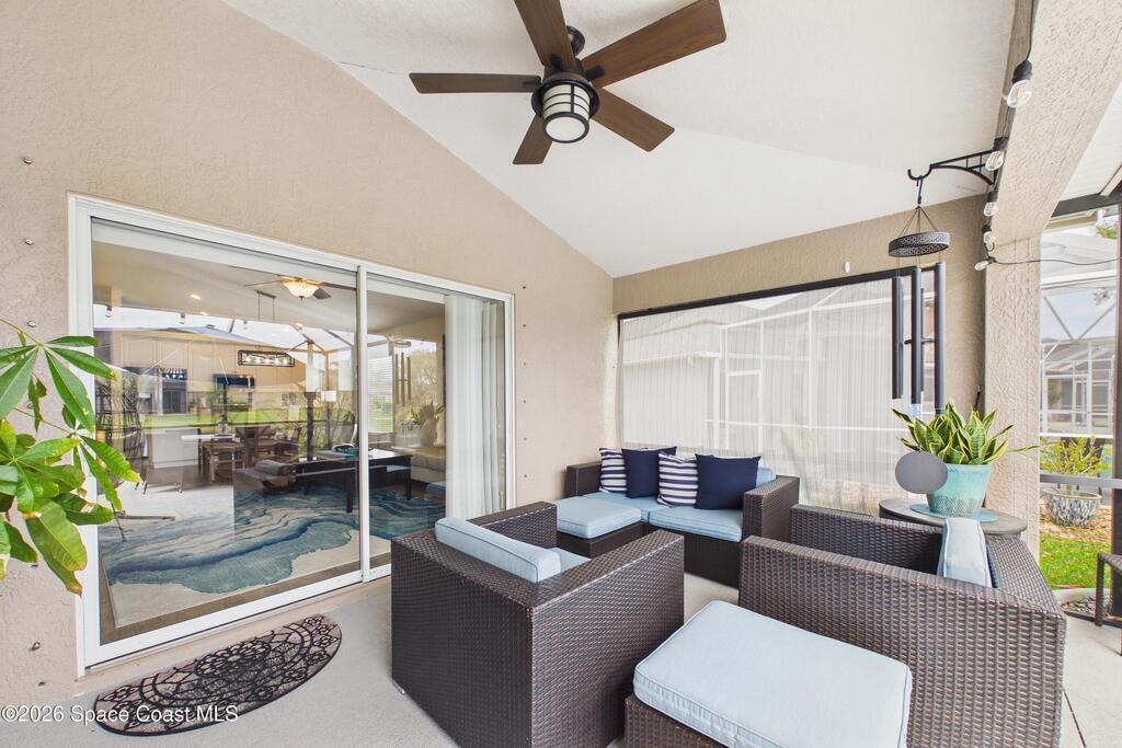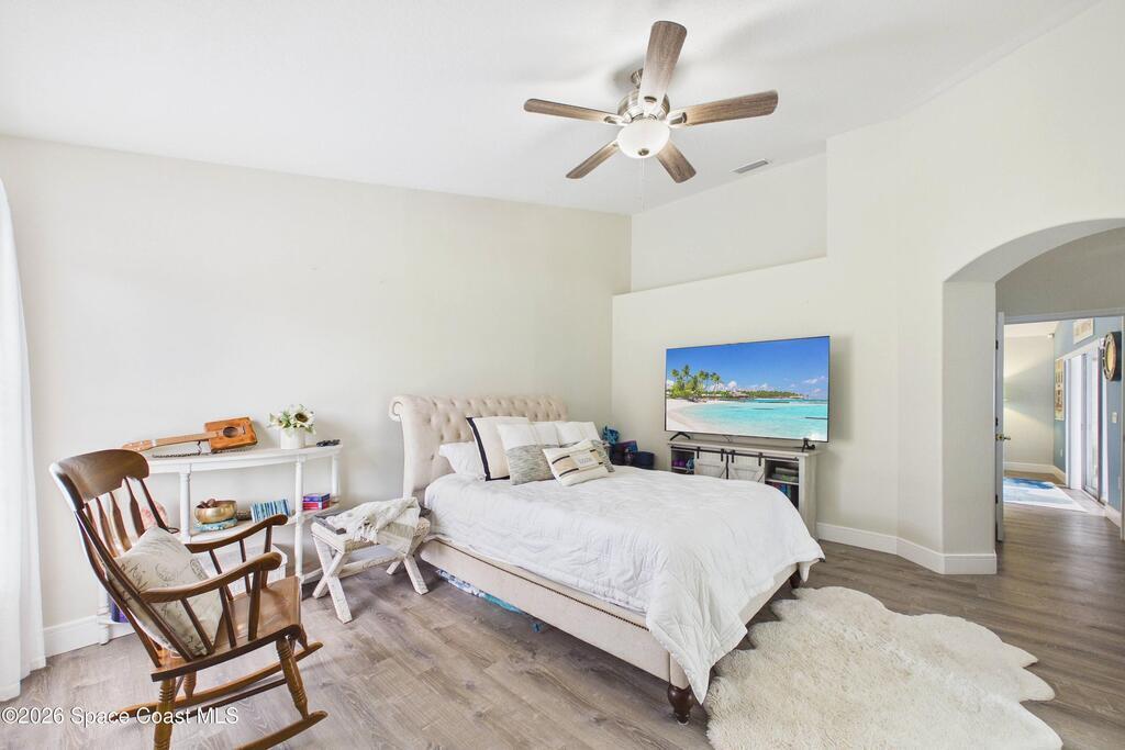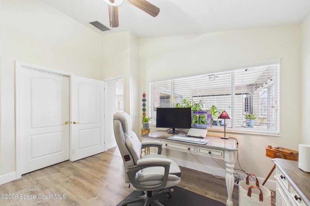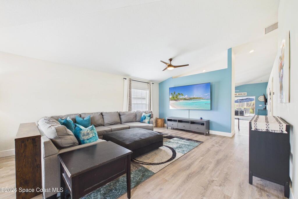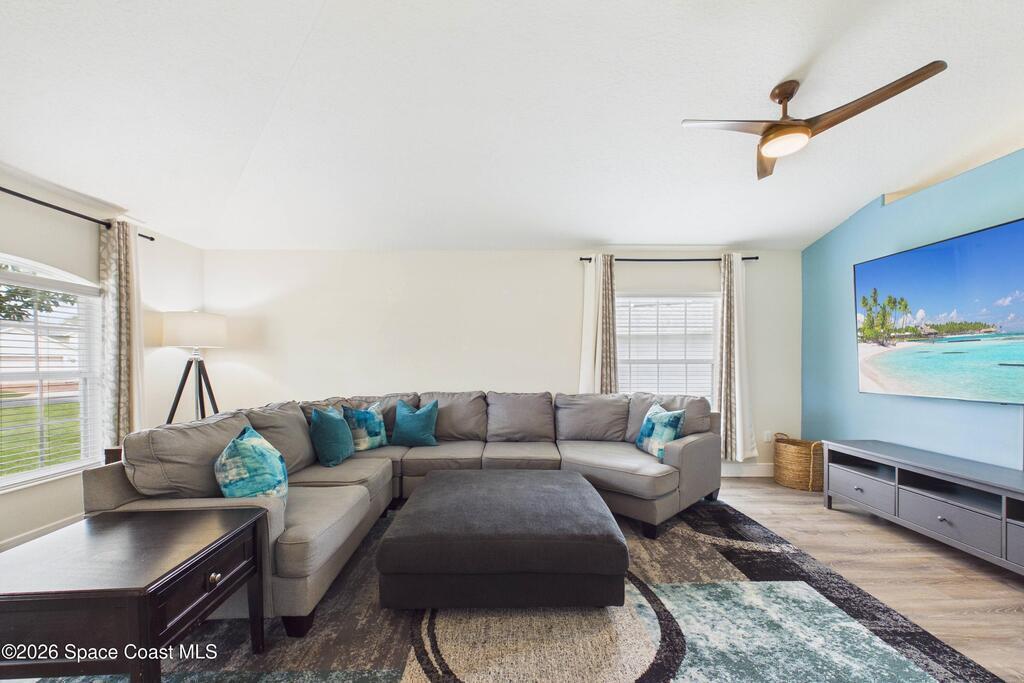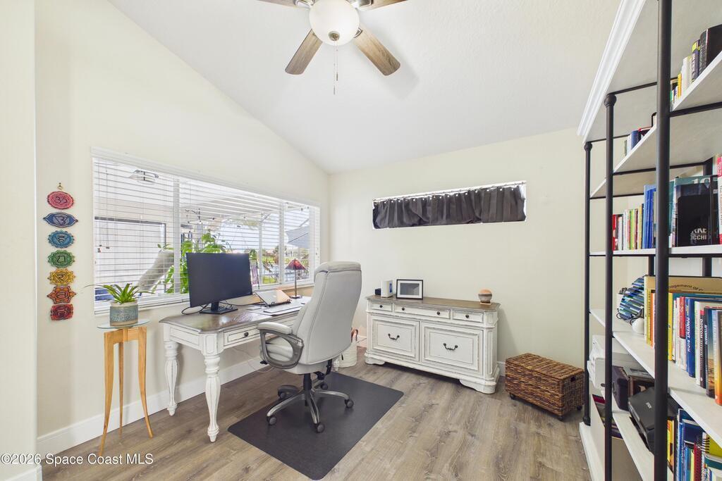 Everything Like new in gated Sonoma at Viera! Move right in. This home sits on a Premium Waterfront lot with privacy landscaping and a new larger 18'x26' screened lanai w/ pet-grade screening. 3 bedrooms plus a Sitting Room/Office, Huge walk-in Primary Closet, Primary Bath has jetted tub, double sinks, and linen closet. Major updates include new roof, water heater (2020), Trane AC (2023), LifeProof LVP floors, Gorgeous Quartz countertops, LG appliances with Double Oven!! A craft ice fridge, coffee/beverage bar with Fridge, 5'' wood baseboards, fans, lighting, all within the last 3 years. New sprinkler pump & control, drip irrigation, curbing, Aluminum Hurricane shutters included. A+ Viera schools. Bus stop, Publix, shops and restaurants right outside the gate. Bike the golf cart trails to the Avenue Viera Shops and restaurants in minutes. Community offers tennis, pickleball, basketball, playground, picnic area, and fishing dock. Orlando airport 45 minutes away