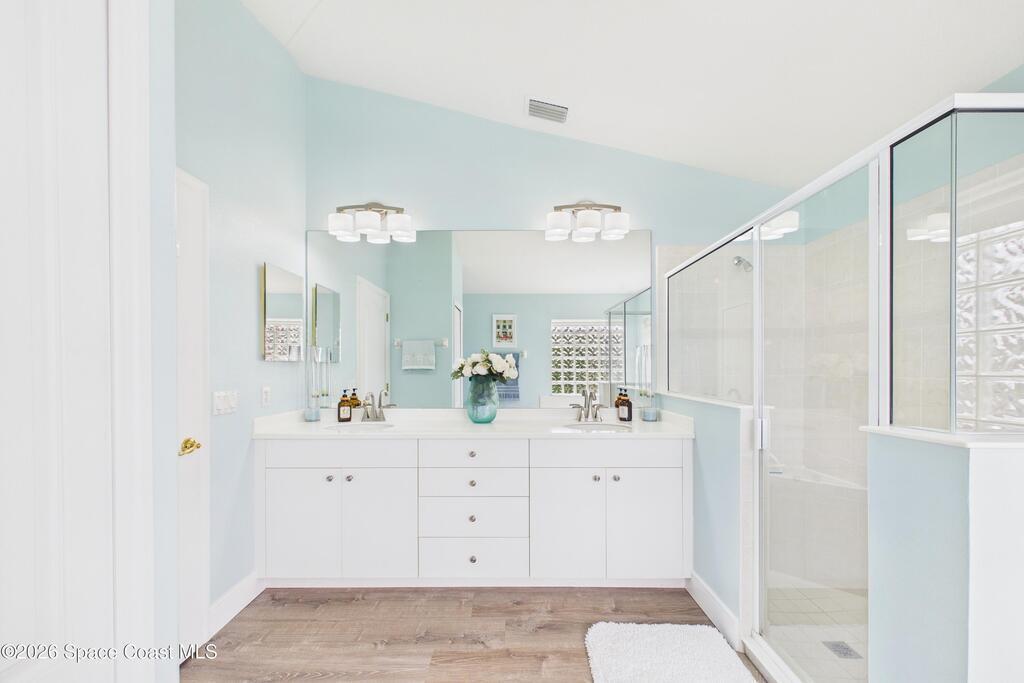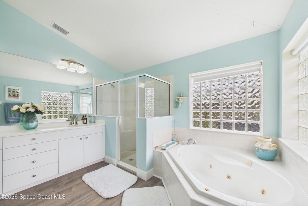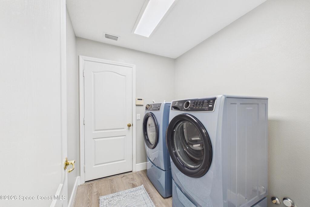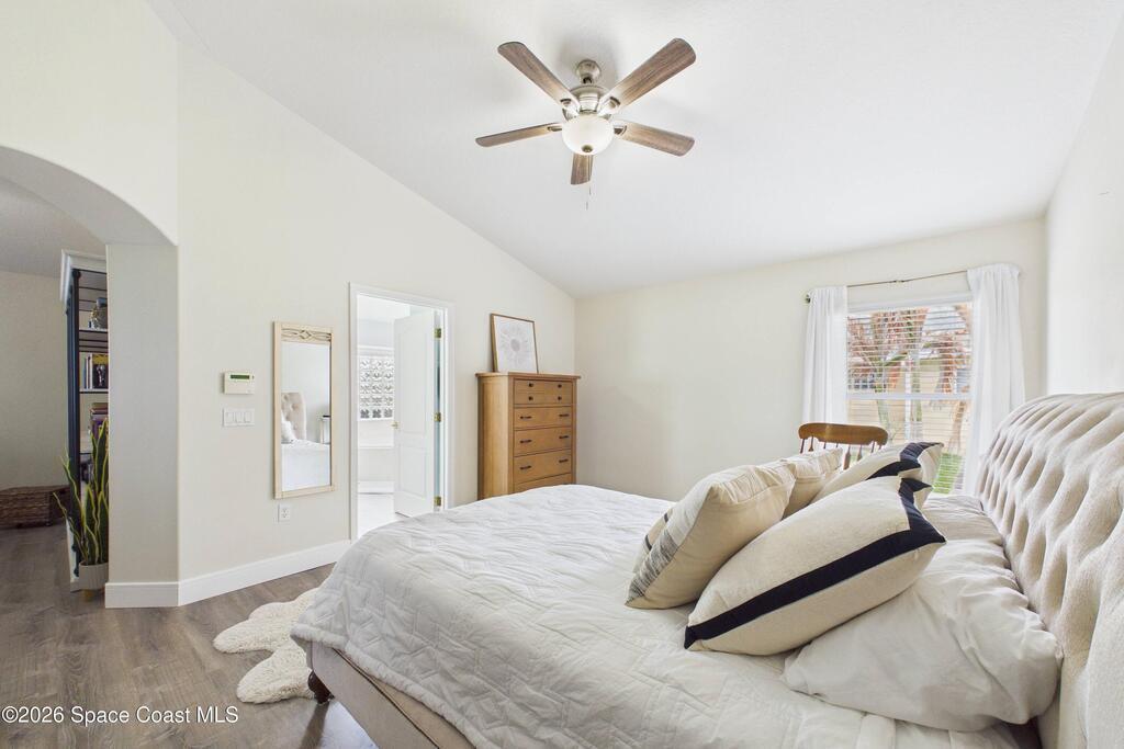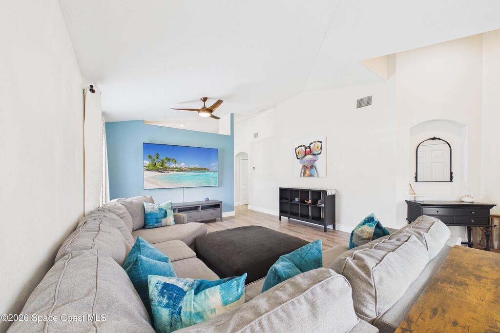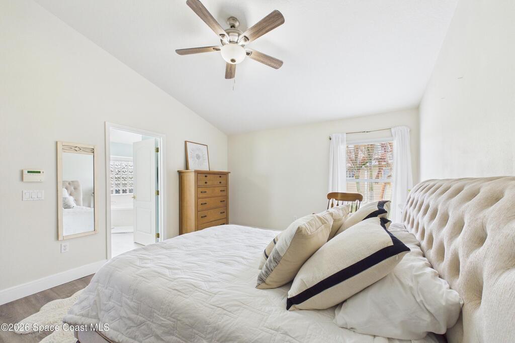 Everything Like new in gated Sonoma at Viera! Move right in. This home sits on a Premium Waterfront lot with privacy landscaping and a new larger 18'x26' screened lanai w/ pet-grade screening. 3 bedrooms plus a Sitting Room/Office, Huge walk-in Primary Closet, Primary Bath has jetted tub, double sinks, and linen closet. Major updates include new roof, water heater (2020), Trane AC (2023), LifeProof LVP floors, Gorgeous Quartz countertops, LG appliances with Double Oven!! A craft ice fridge, coffee/beverage bar with Fridge, 5'' wood baseboards, fans, lighting, all within the last 3 years. New sprinkler pump & control, drip irrigation, curbing, Aluminum Hurricane shutters included. A+ Viera schools. Bus stop, Publix, shops and restaurants right outside the gate. Bike the golf cart trails to the Avenue Viera Shops and restaurants in minutes. Community offers tennis, pickleball, basketball, playground, picnic area, and fishing dock. Orlando airport 45 minutes away