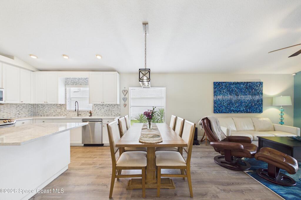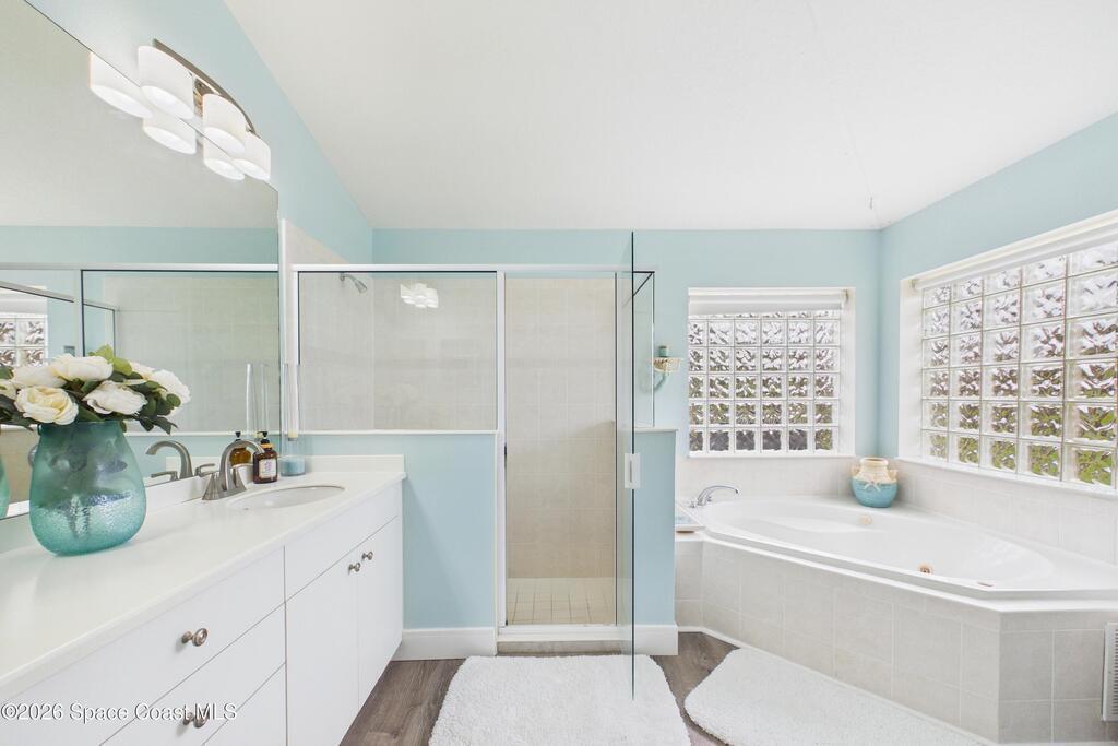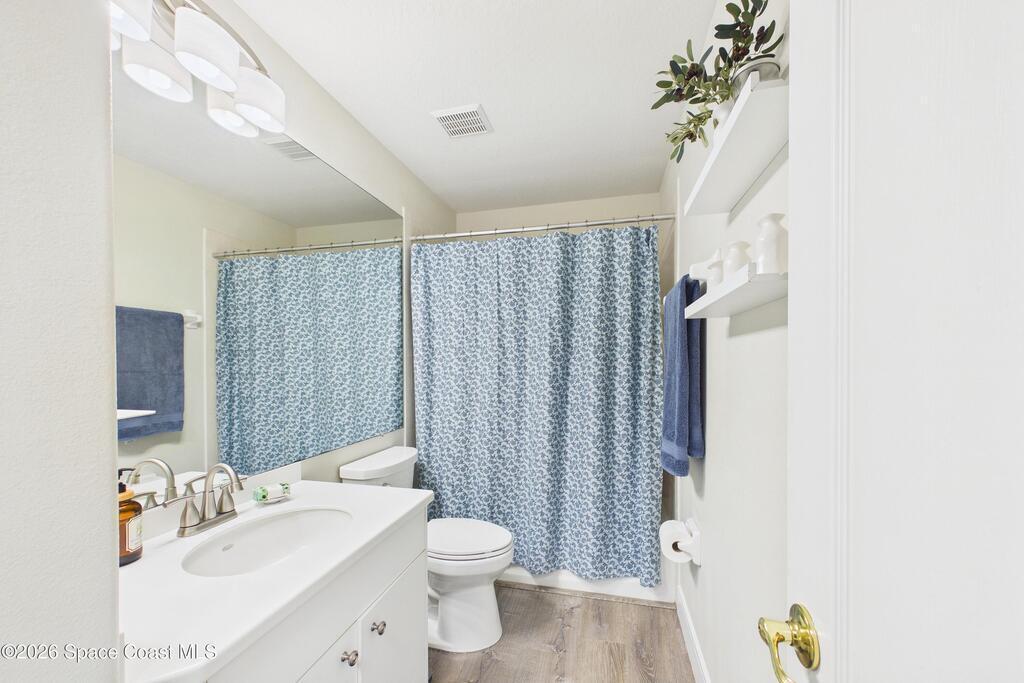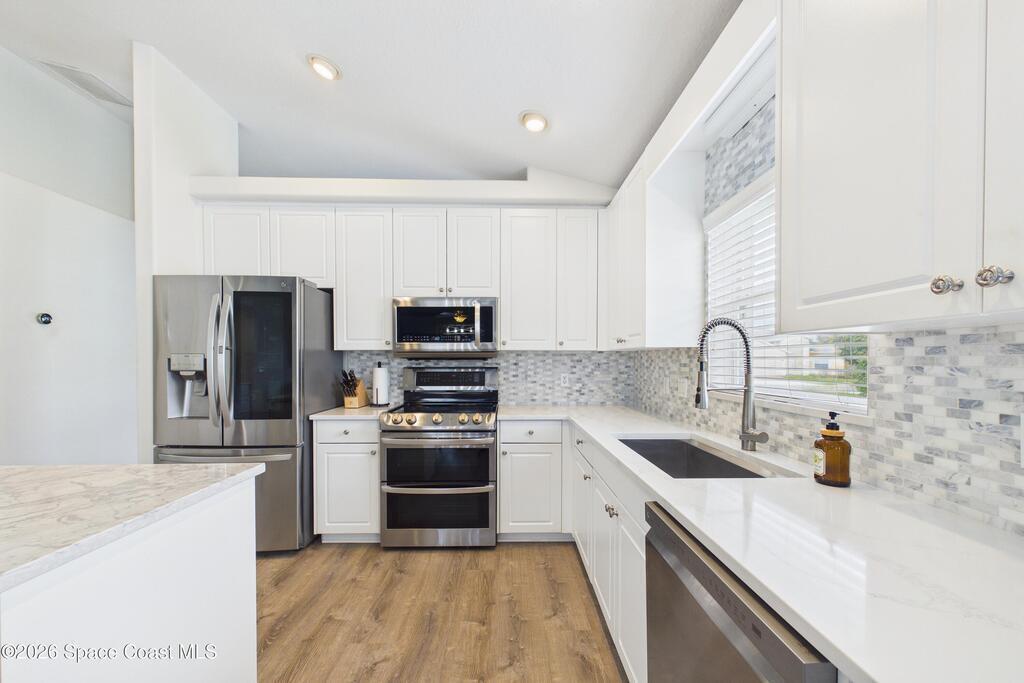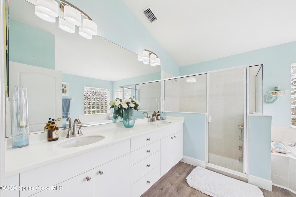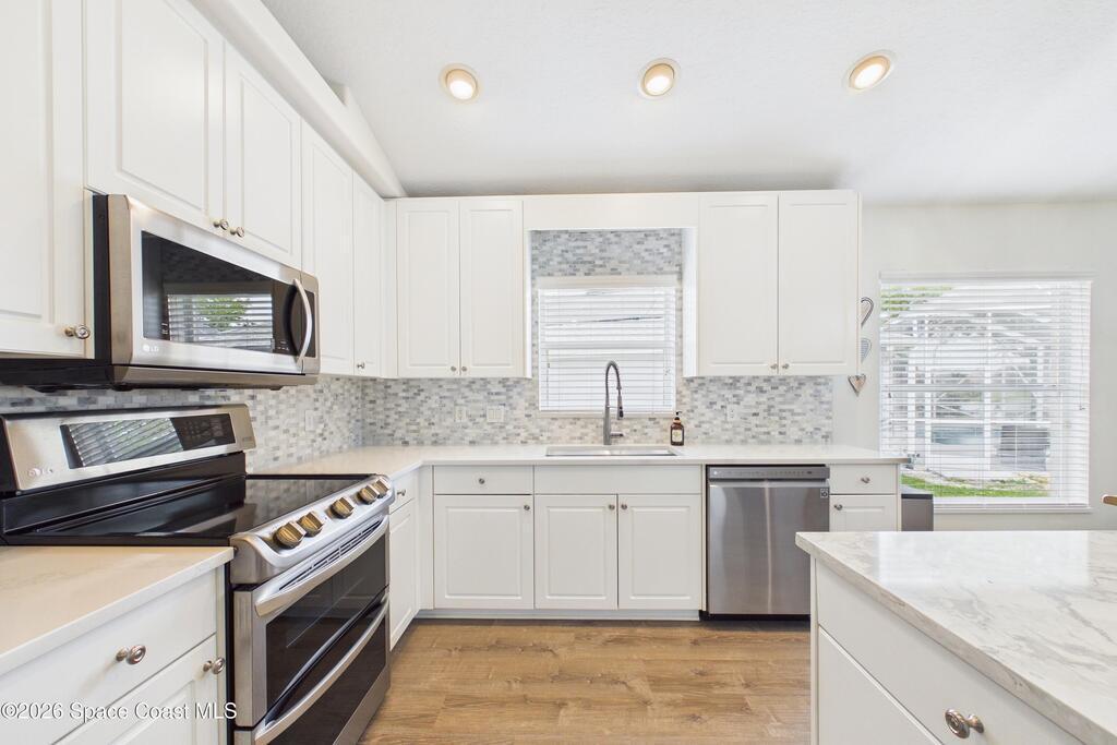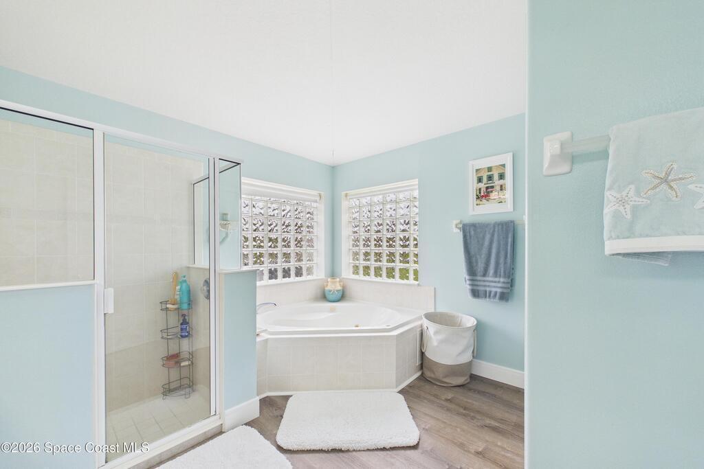 Everything Like new in gated Sonoma at Viera! Move right in. This home sits on a Premium Waterfront lot with privacy landscaping and a new larger 18'x26' screened lanai w/ pet-grade screening. 3 bedrooms plus a Sitting Room/Office, Huge walk-in Primary Closet, Primary Bath has jetted tub, double sinks, and linen closet. Major updates include new roof, water heater (2020), Trane AC (2023), LifeProof LVP floors, Gorgeous Quartz countertops, LG appliances with Double Oven!! A craft ice fridge, coffee/beverage bar with Fridge, 5'' wood baseboards, fans, lighting, all within the last 3 years. New sprinkler pump & control, drip irrigation, curbing, Aluminum Hurricane shutters included. A+ Viera schools. Bus stop, Publix, shops and restaurants right outside the gate. Bike the golf cart trails to the Avenue Viera Shops and restaurants in minutes. Community offers tennis, pickleball, basketball, playground, picnic area, and fishing dock. Orlando airport 45 minutes away