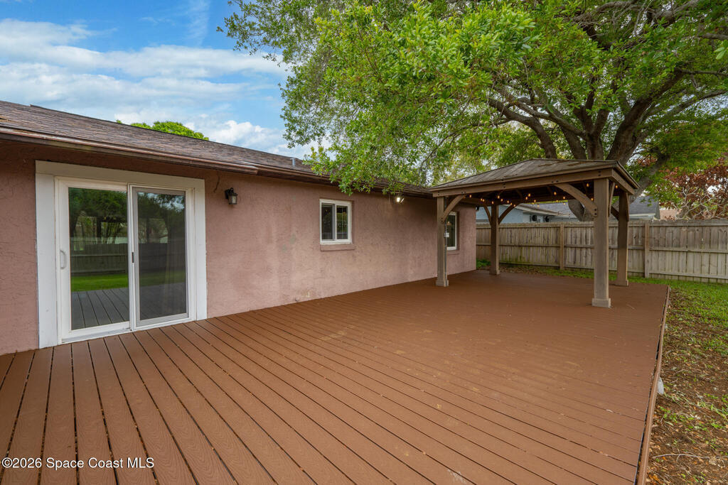 Thoughtfully updated 3-bed, 2-bath home in the heart of Rockledge with NO HOA! An open floor plan welcomes you with plenty of natural light and tile flooring throughout. The spacious kitchen features granite countertops, solid wood cabinets, breakfast bar, and stainless appliances. The newly remodeled primary suite has a renovated en suite bath and walk-in closet complete with custom built-ins. Out back, the expansive deck and gazebo wired for speakers overlooks a large, fully-fenced private yard, complete with a fire pit and plenty of room for a pool--making this the perfect home for gathering and entertaining! Loaded with smart features including light switches, primary blinds, and a motorized garage screen. Security camera wiring and hurricane-impact windows and slider add peace of mind. Major updates include a 2016 roof, 2019 air handler, and 2025 condenser. Minutes from shopping, dining, schools, and parks, this home is move-in ready and waiting for its next chapter!