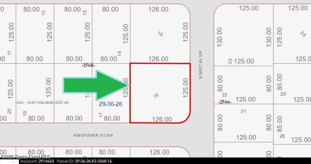 It's an oversized 0.36 acre [[[corner]]] buildable single family residential lot [Rs2 Zoning] available in Port Malabar Unit #49 of Palm Bay. Powerlines are at the street and there is a home a couple of lots away. Located in the buildable section of Palm Bay, this property is just 4.1 miles -12 minutes to Publix Shopping, 2.1 miles -6 minutes- to Westside Elementary School, and 2.6 miles -7 minutes- to Bayside High School. Property measures 126 feet on the northern boundary and 125 feet on the western boundary From Exit #173 of I-95 go west on Malabar Road for 1.4 miles. Turn left on Emerson Drive SE and Right on Jupiter Boulevard. Proceed for 1.6 miles and turn left on DeGroodt Road. Proceed 3.3 miles. turn right on Osmosis Drive. Proceed 1 miles and turn left on Madden Avenue SW and Left on Kingfisher Street. Go to the corner of Kingfisher and Egret. The lot is on the NW Corner.