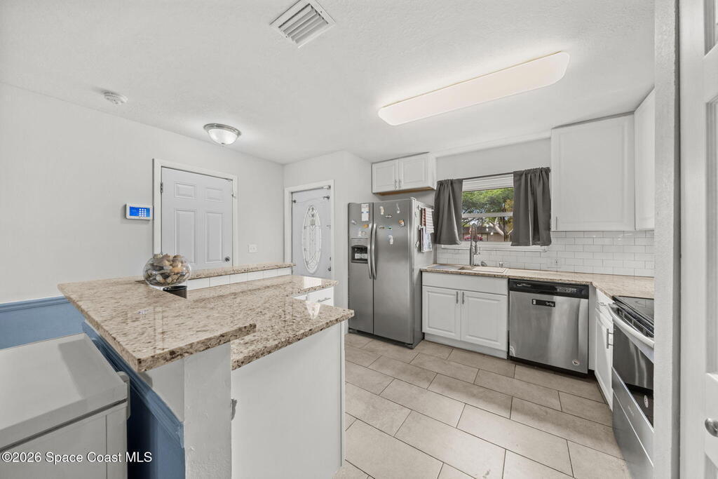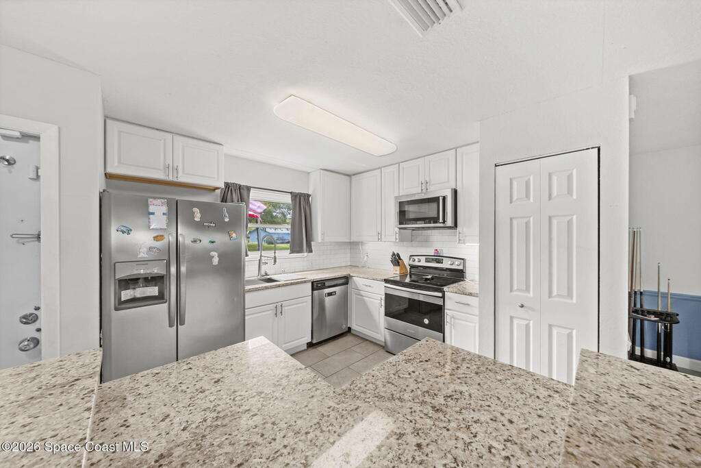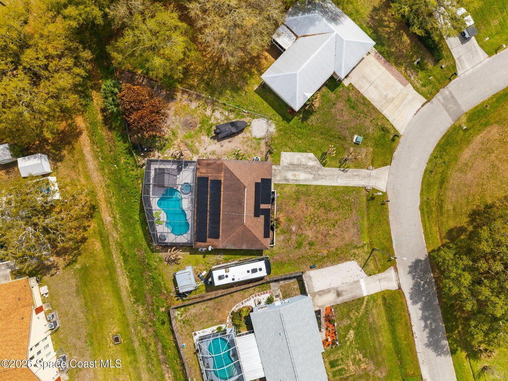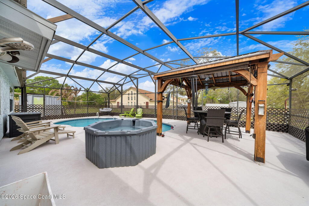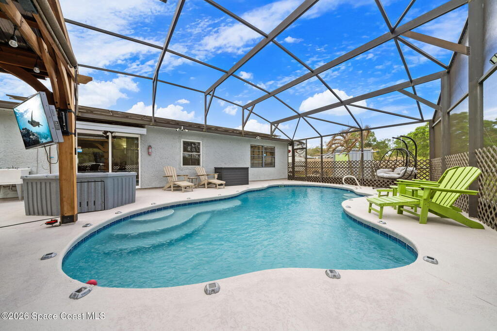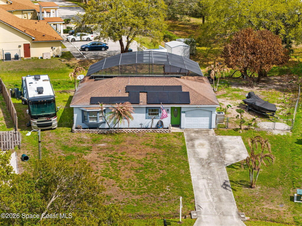 CITY/SEWER PALM BAY Beautifully updated 3-bedroom, 2-bath home on an oversized .34-acre pie-shaped lot with a fully fenced backyard offering privacy and plenty of space to relax or entertain. Freshly painted inside and out, this move-in-ready home features tile flooring throughout with carpets in the bedrooms. The kitchen boasts granite countertops, stainless steel appliances, and a farmhouse sink. Both bathrooms include newer vanities and modern fixtures. Step outside to your private retreat featuring a freshly screened in-ground pool, above ground jacuzzi, newly painted deck, and a charming gazebo with electric fire-pit and seating area. Additional highlights include solar panels for significantly lower electric bills, brand new windows, built-in security system, 50-amp RV breaker, digital pool pump system. Centrally located near shopping, restaurants, 10 mins from beaches and 5 mins from interstate. A perfect blend of comfort, efficiency, and Florida lifestyle living! ☀️🏡🌴