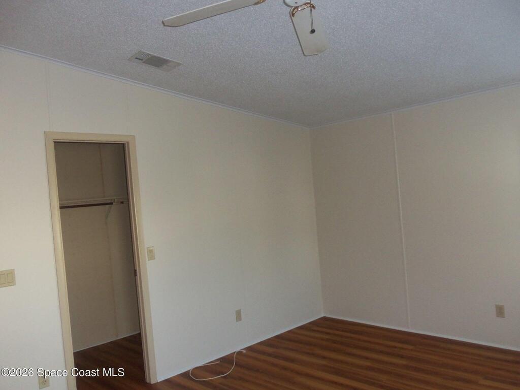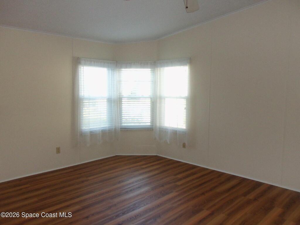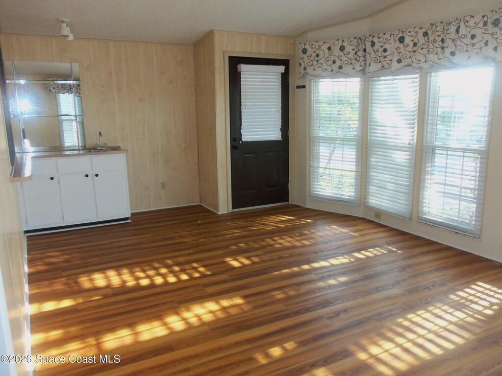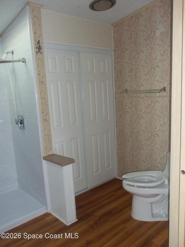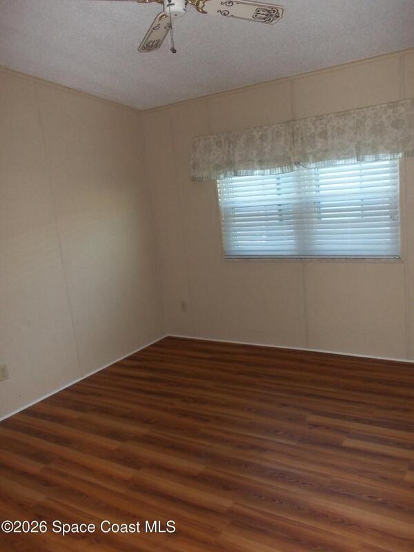 Here is a 24'x60' Jacobsen home located in the Floral section of Barefoot Bay. Within walking distance to pool 3. Has a ground level screen porch on side of home with tile flooring. Has the extra room on the front of home with pass thru window and wet bar, the kitchen has loads of cabinets, dining room has a built in hutch, washer and dryer in laundry room, large master bedroom, master bath has an oversized walk in shower. Large walk in closets in both bed rooms. Flooring is a waterproof click-lock, New roof in 2024. Windows are all hurricane glass.