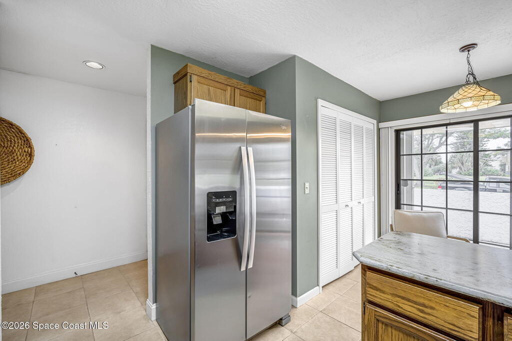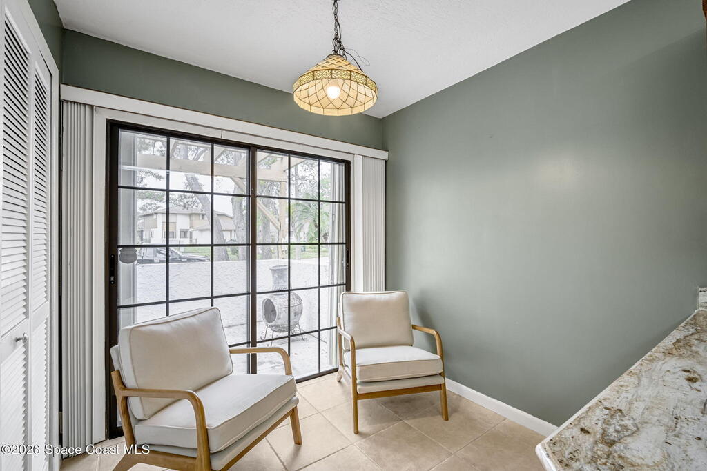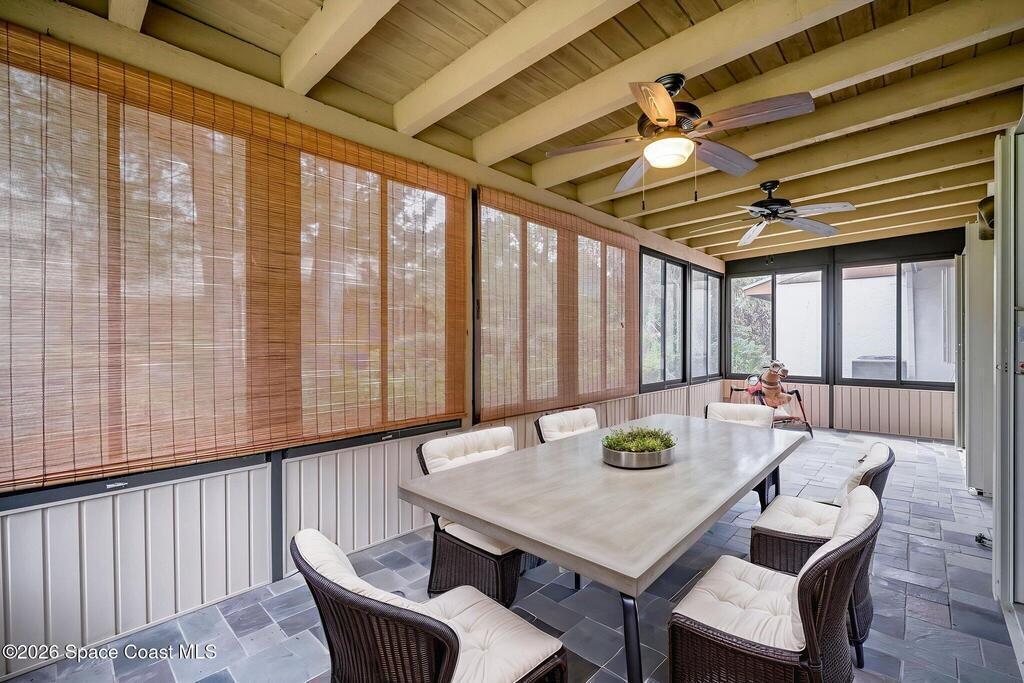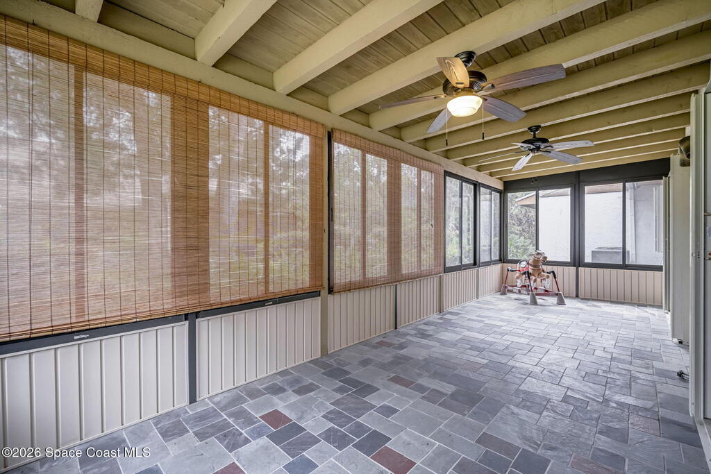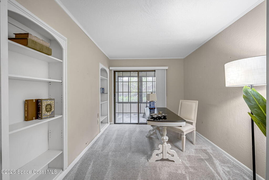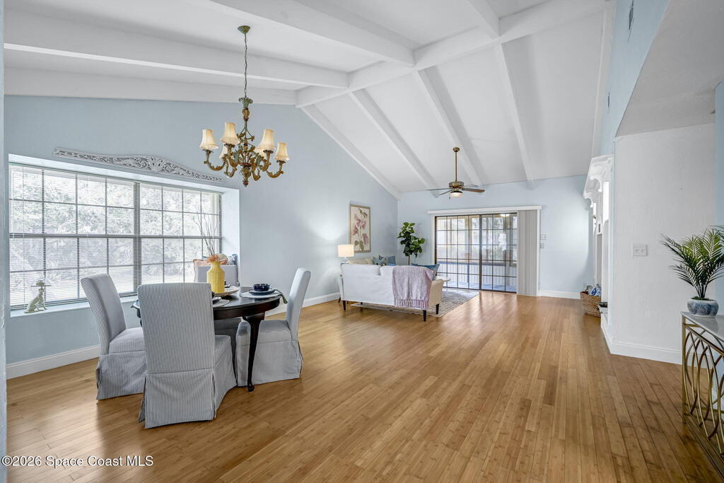 Welcome to Quail Ridge Townhomes! This well-maintained half duplex offers 2 bedrooms, 2 bathrooms, PLUS a versatile office that can easily serve as a 3rd bedroom or flex space. The entry and kitchen feature tile flooring, bamboo flooring flows throughout the main living areas, with the comfort of carpet in the bedrooms and office area.Soaring cathedral ceilings with exposed beams create a bright, open feel, complimented by a built-in entertainment feature in the living room. The office includes custom built-in bookshelves, perfect for work or study. Step outside to a large screened-in porch ideal for relaxing or entertaining.More highlights include a 2-car garage, a new roof installed May 2025, and AC 2023, water heater 2020. Enjoy community amenities including a clubhouse, pool, and tennis courts. The storage area can even store your boat, trailer, OR RV. Conveniently located across from Wickham Park, offering community events, walking trails, sports fields, and more!