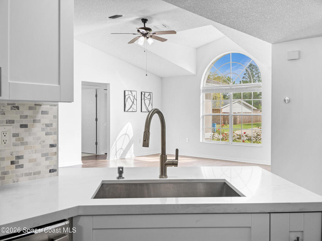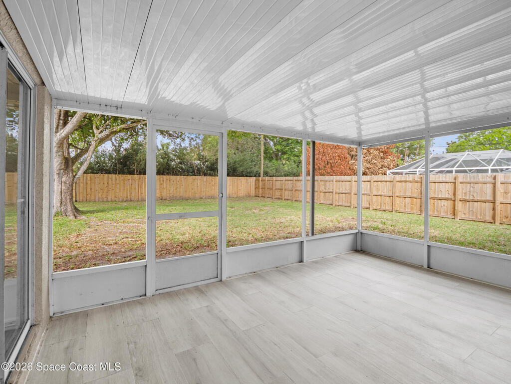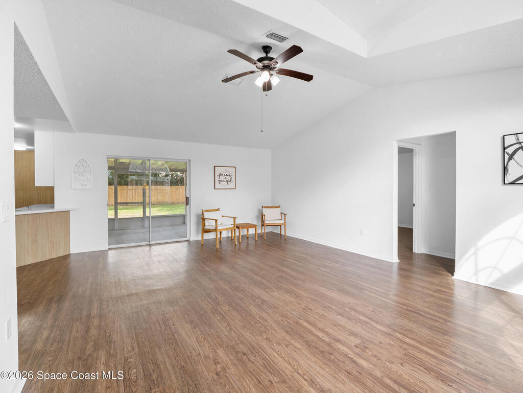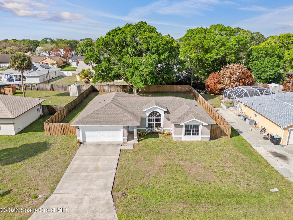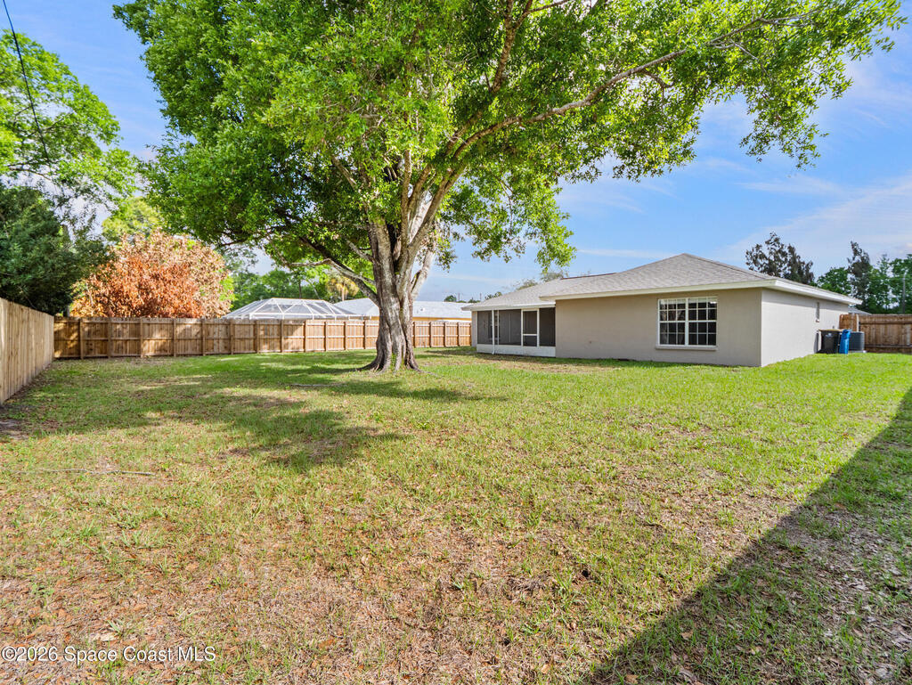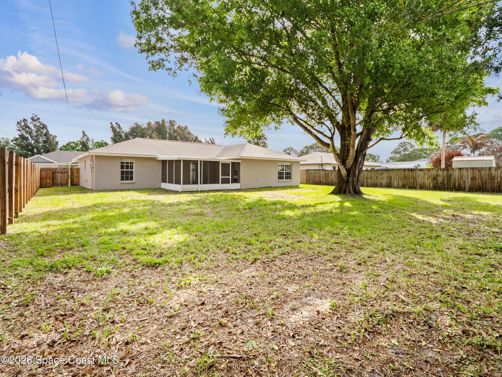 Welcome home to this beautifully fully fenced & renovated 3-bedroom, 2-bathroom gem nestled in the heart of Palm Bay! Sitting at 1, 510 sq ft with zero HOA fees, this solid block home is move-in ready and built for the next chapter of your life. Step inside to an open floorplan with vaulted ceilings and a split-bedroom layout that gives everyone their own space. The fully updated kitchen features stunning quartz countertops with a waterfall edge, 42'' soft-close wood cabinets, and a breakfast bar. The primary features a large walk-in closet & bathroom that has been stylishly updated with a tiled quartz shower, and countertops, as well. Out back, you'll find a screened-in rear porch with tile flooring, all within a fully fenced, private backyard. Located just minutes from Hammock Landing, Publix, and a wide variety of local restaurants, everything you need is right at your doorstep. Commuters will love the quick 5-minute access to I-95, making it easy to get anywhere on the Space Coast.