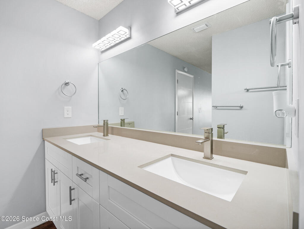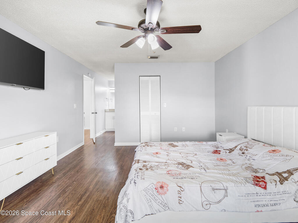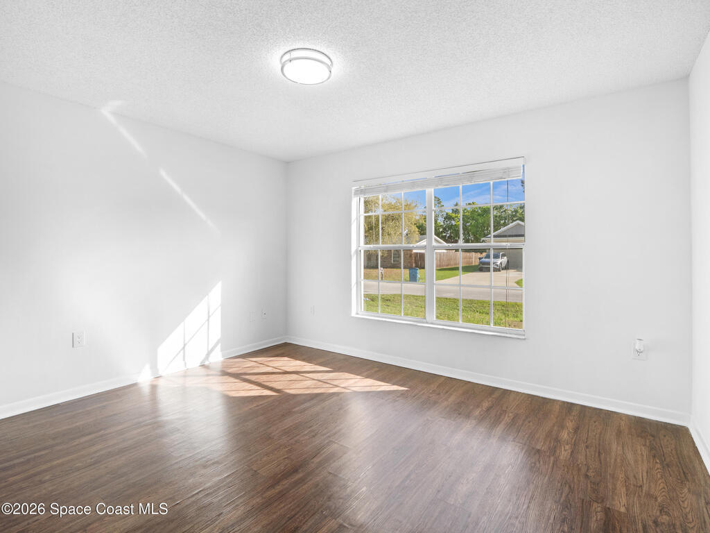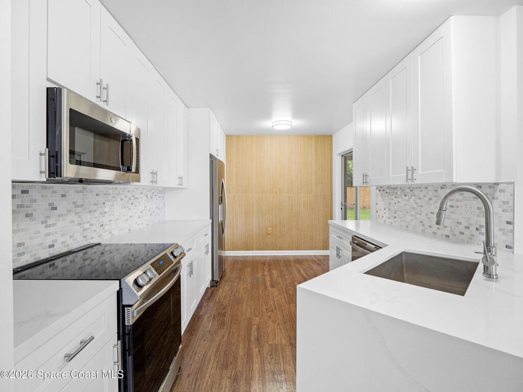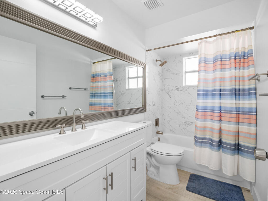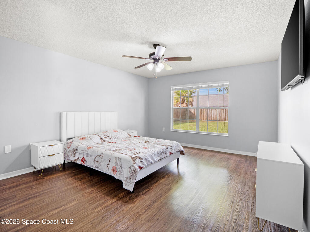 Welcome home to this beautifully fully fenced & renovated 3-bedroom, 2-bathroom gem nestled in the heart of Palm Bay! Sitting at 1, 510 sq ft with zero HOA fees, this solid block home is move-in ready and built for the next chapter of your life. Step inside to an open floorplan with vaulted ceilings and a split-bedroom layout that gives everyone their own space. The fully updated kitchen features stunning quartz countertops with a waterfall edge, 42'' soft-close wood cabinets, and a breakfast bar. The primary features a large walk-in closet & bathroom that has been stylishly updated with a tiled quartz shower, and countertops, as well. Out back, you'll find a screened-in rear porch with tile flooring, all within a fully fenced, private backyard. Located just minutes from Hammock Landing, Publix, and a wide variety of local restaurants, everything you need is right at your doorstep. Commuters will love the quick 5-minute access to I-95, making it easy to get anywhere on the Space Coast.