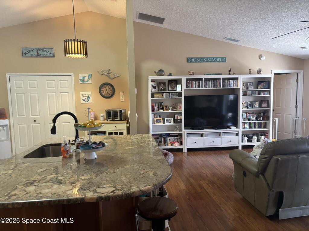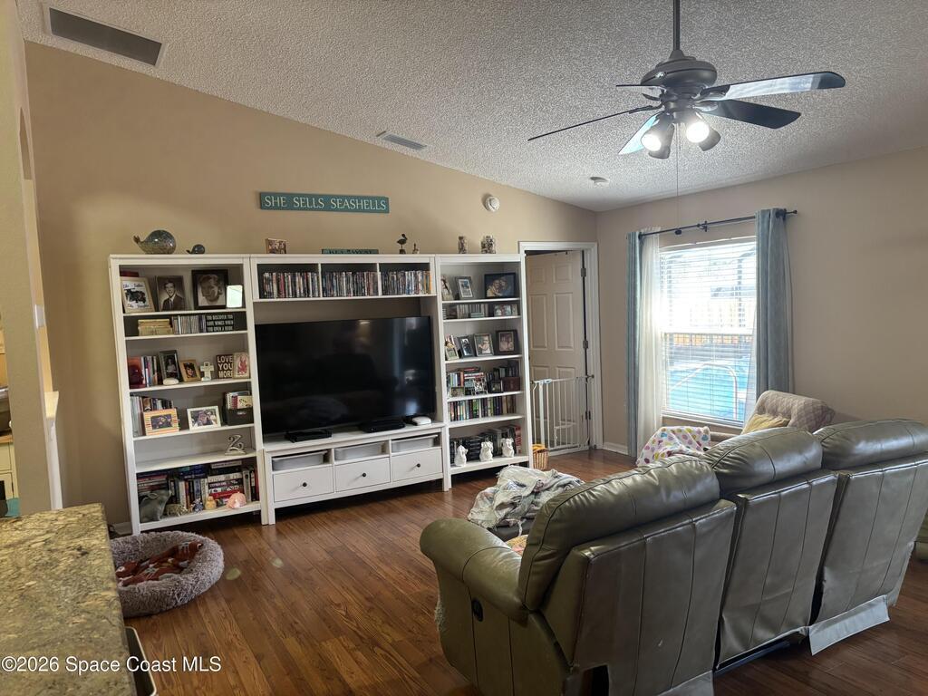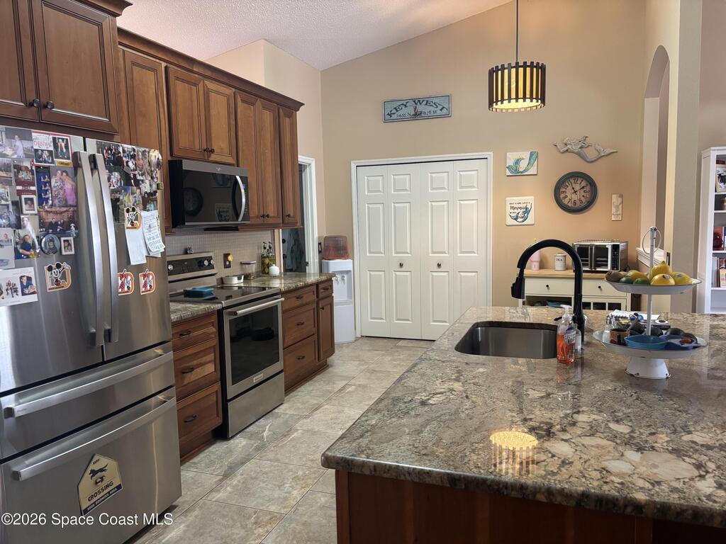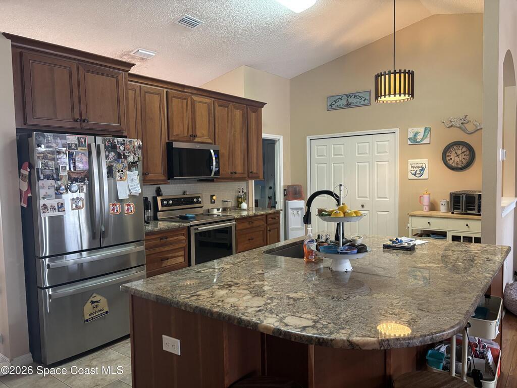 Beautiful pool home ready for its new owners! 2025 Roof. Step through the elegant glass front entry door and instantly feel at home. The spacious, updated floor plan features soaring vaulted ceilings and lots of natural light, creating a bright and inviting atmosphere. The designer kitchen truly stands out showcasing 42'' cherry-glazed cabinets with crown molding, stunning granite countertops and a large island with added storage. Enjoy conveniences like soft-close hinges and a newer four-piece stainless steel appliance package featuring a convection oven. Additional highlights include premium laminate flooring in the living, dining and family rooms, decorative plant shelves, an arched walkway, interior laundry room complete with sink and a surveillance and alarm system. Step outside and embrace Florida living at its best. Cool off in the screened-in, in-ground pool or unwind on the truss-covered porch while listening to the soothing waterfalls. City water/sewer, fully fenced yard.
