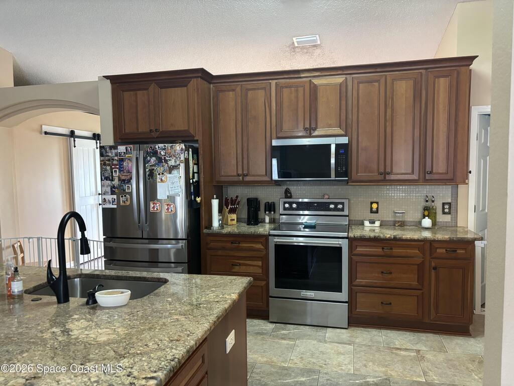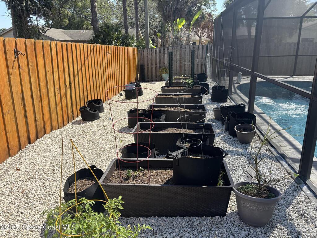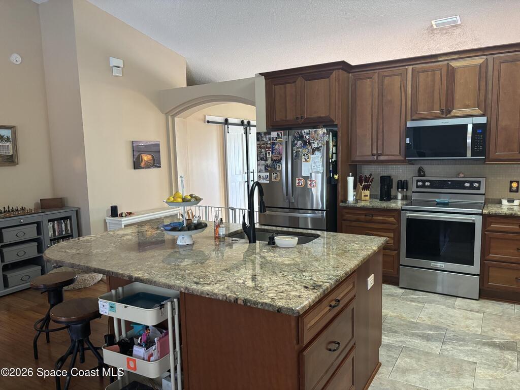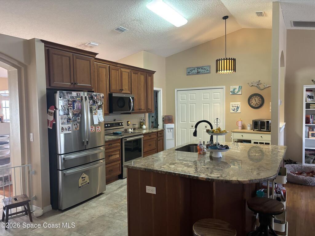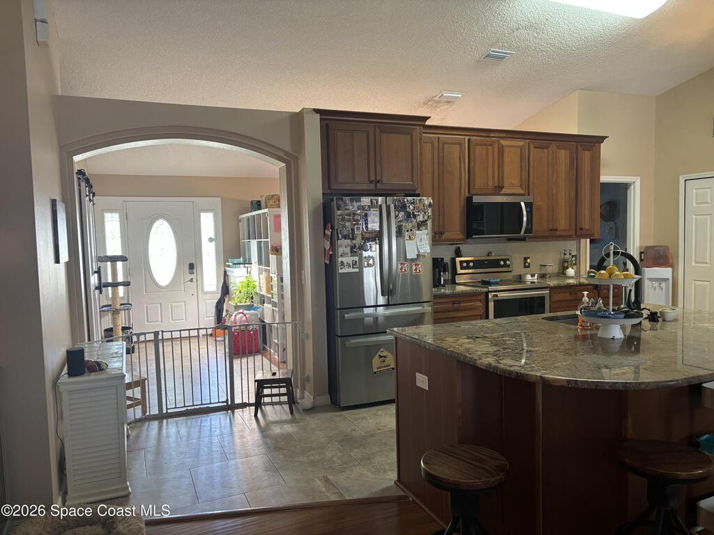 Beautiful pool home ready for its new owners! 2025 Roof. Step through the elegant glass front entry door and instantly feel at home. The spacious, updated floor plan features soaring vaulted ceilings and lots of natural light, creating a bright and inviting atmosphere. The designer kitchen truly stands out showcasing 42'' cherry-glazed cabinets with crown molding, stunning granite countertops and a large island with added storage. Enjoy conveniences like soft-close hinges and a newer four-piece stainless steel appliance package featuring a convection oven. Additional highlights include premium laminate flooring in the living, dining and family rooms, decorative plant shelves, an arched walkway, interior laundry room complete with sink and a surveillance and alarm system. Step outside and embrace Florida living at its best. Cool off in the screened-in, in-ground pool or unwind on the truss-covered porch while listening to the soothing waterfalls. City water/sewer, fully fenced yard.
