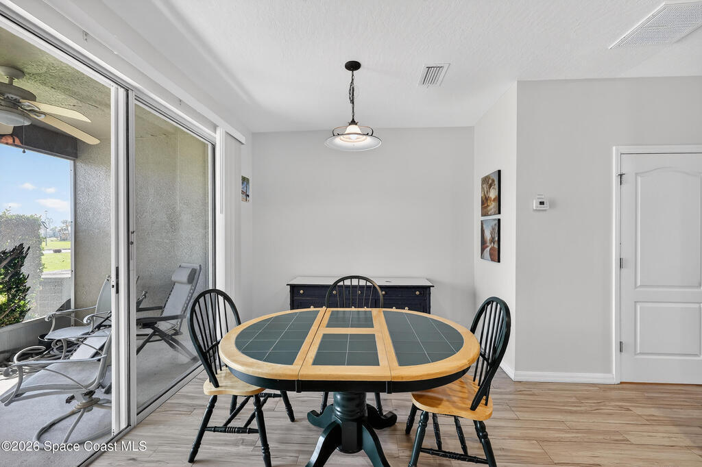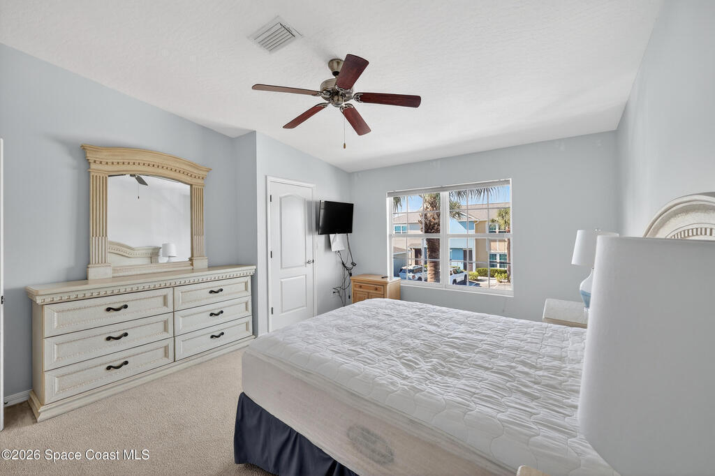 Beautifully maintained two-story townhome in gated Oceanside Village with open-concept living area and tile flooring throughout main living areas. Features include a screened-in rear patio with clubhouse view, detached garage, and guest parking. The home offers a modern kitchen with quartz countertops and updated bathroom finishes. Located in a gated community with resort-style amenities including pool, clubhouse, tennis courts, and playground, with HOA covering roof, exterior, landscaping, and insurance. Beachside location just minutes to the ocean with convenient access from both Eau Gallie Blvd and A1A. Close to restaurants and shopping including Texas Roadhouse, Chipotle, Starbucks, and Walmart. Currently the only available unit in Oceanside Village.