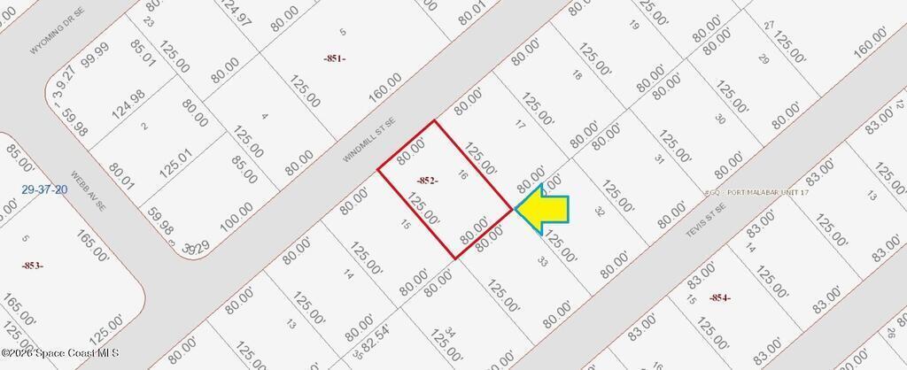 One of 2 side-by-side adjacent lots available in Port Malabar Unit 17 of Palm Bay (the other is 1042 Windmill). Located in the southeast section, this 0.23 acre buildable residential lot is just 2.1 miles - 6 minutes to the Publix Supermarket, 2.4 miles - 6 minutes to Columbia Elementary School, 11.6 miles - 26 minutes to Melbourne Airport, and 13.8 miles - 31 minutes to the beaches of Indialantic. From exit #173 of I-95 go west on Malabar Road for .2 miles, left on San Filippo Drive for 3.3 miles, right on Wyoming Drive for .9 miles, left on Raintree Avenue for .1 mile, and right on Windmill Street. The lot will be on your left.