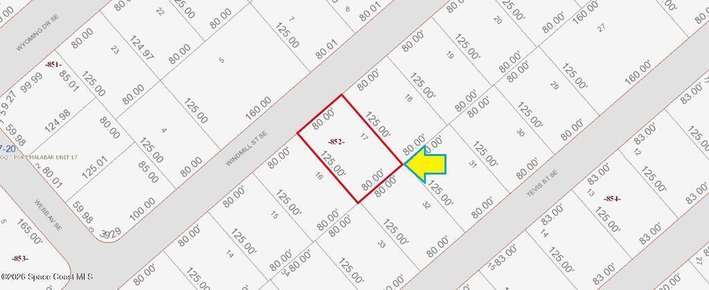 One of 2 side-by-side adjacent lots available in Port Malabar Unit 17 of Palm Bay (the other is 1034 Windmill). Located in the southeast section, this 0.23 acre buildable residential lot is just 2.1 miles - 6 minutes to the Publix Supermarket, 2.4 miles - 6 minutes to Columbia Elementary School, 11.6 miles - 26 minutes to Melbourne Airport, and 13.8 miles - 31 minutes to the beaches of Indialantic. From exit #173 of I-95 go west on Malabar Road for .2 miles, left on San Filippo Drive for 3.3 miles, right on Wyoming Drive for .9 miles, left on Raintree Avenue for .1 mile, and right on Windmill Street. The lot will be on your left.